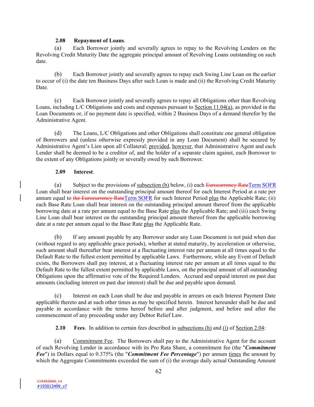 2.08 Repayment of Loans. (a) Each Borrower jointly and severally agrees to repay to the Revolving Lenders on the Revolving Credit Maturity Date the aggregate principal amount of Revolving Loans outstanding on such date. (b) Each Borrower jointly and severally agrees to repay each Swing Line Loan on the earlier to occur of (i) the date ten Business Days after such Loan is made and (ii) the Revolving Credit Maturity Date. (c) Each Borrower jointly and severally agrees to repay all Obligations other than Revolving Loans, including L/C Obligations and costs and expenses pursuant to Section 11.04(a), as provided in the Loan Documents or, if no payment date is specified, within 2 Business Days of a demand therefor by the Administrative Agent. (d) The Loans, L/C Obligations and other Obligations shall constitute one general obligation of Borrowers and (unless otherwise expressly provided in any Loan Document) shall be secured by Administrative Agent’s Lien upon all Collateral; provided, however, that Administrative Agent and each Lender shall be deemed to be a creditor of, and the holder of a separate claim against, each Borrower to the extent of any Obligations jointly or severally owed by such Borrower. 2.09 Interest. (a) Subject to the provisions of subsection (b) below, (i) each Eurocurrency RateTerm SOFR Loan shall bear interest on the outstanding principal amount thereof for each Interest Period at a rate per annum equal to the Eurocurrency RateTerm SOFR for such Interest Period plus the Applicable Rate; (ii) each Base Rate Loan shall bear interest on the outstanding principal amount thereof from the applicable borrowing date at a rate per annum equal to the Base Rate plus the Applicable Rate; and (iii) each Swing Line Loan shall bear interest on the outstanding principal amount thereof from the applicable borrowing date at a rate per annum equal to the Base Rate plus the Applicable Rate. (b) If any amount payable by any Borrower under any Loan Document is not paid when due (without regard to any applicable grace periods), whether at stated maturity, by acceleration or otherwise, such amount shall thereafter bear interest at a fluctuating interest rate per annum at all times equal to the Default Rate to the fullest extent permitted by applicable Laws. Furthermore, while any Event of Default exists, the Borrowers shall pay interest, at a fluctuating interest rate per annum at all times equal to the Default Rate to the fullest extent permitted by applicable Laws, on the principal amount of all outstanding Obligations upon the affirmative vote of the Required Lenders. Accrued and unpaid interest on past due amounts (including interest on past due interest) shall be due and payable upon demand. (c) Interest on each Loan shall be due and payable in arrears on each Interest Payment Date applicable thereto and at such other times as may be specified herein. Interest hereunder shall be due and payable in accordance with the terms hereof before and after judgment, and before and after the commencement of any proceeding under any Debtor Relief Law. 2.10 Fees. In addition to certain fees described in subsections (h) and (i) of Section 2.04: (a) Commitment Fee. The Borrowers shall pay to the Administrative Agent for the account of each Revolving Lender in accordance with its Pro Rata Share, a commitment fee (the "Commitment Fee") in Dollars equal to 0.375% (the "Commitment Fee Percentage") per annum times the amount by which the Aggregate Commitments exceeded the sum of (i) the average daily actual Outstanding Amount 62 119482860_14 #193013499_v7