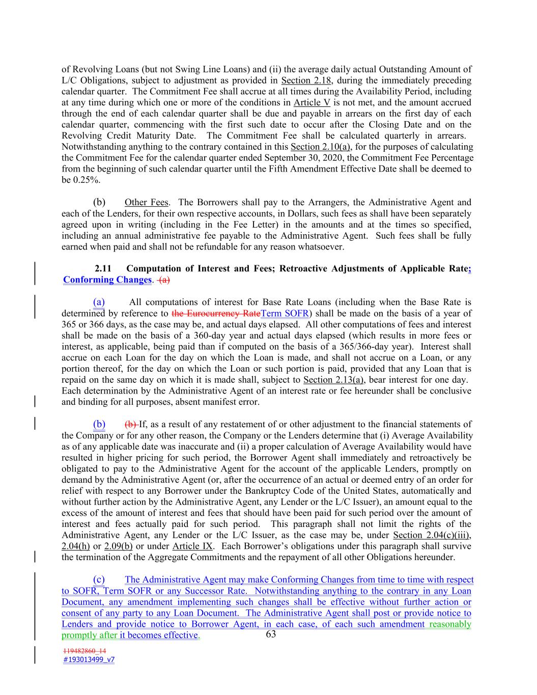 of Revolving Loans (but not Swing Line Loans) and (ii) the average daily actual Outstanding Amount of L/C Obligations, subject to adjustment as provided in Section 2.18, during the immediately preceding calendar quarter. The Commitment Fee shall accrue at all times during the Availability Period, including at any time during which one or more of the conditions in Article V is not met, and the amount accrued through the end of each calendar quarter shall be due and payable in arrears on the first day of each calendar quarter, commencing with the first such date to occur after the Closing Date and on the Revolving Credit Maturity Date. The Commitment Fee shall be calculated quarterly in arrears. Notwithstanding anything to the contrary contained in this Section 2.10(a), for the purposes of calculating the Commitment Fee for the calendar quarter ended September 30, 2020, the Commitment Fee Percentage from the beginning of such calendar quarter until the Fifth Amendment Effective Date shall be deemed to be 0.25%. (b) Other Fees. The Borrowers shall pay to the Arrangers, the Administrative Agent and each of the Lenders, for their own respective accounts, in Dollars, such fees as shall have been separately agreed upon in writing (including in the Fee Letter) in the amounts and at the times so specified, including an annual administrative fee payable to the Administrative Agent. Such fees shall be fully earned when paid and shall not be refundable for any reason whatsoever. 2.11 Computation of Interest and Fees; Retroactive Adjustments of Applicable Rate; Conforming Changes. (a) (a) All computations of interest for Base Rate Loans (including when the Base Rate is determined by reference to the Eurocurrency RateTerm SOFR) shall be made on the basis of a year of 365 or 366 days, as the case may be, and actual days elapsed. All other computations of fees and interest shall be made on the basis of a 360-day year and actual days elapsed (which results in more fees or interest, as applicable, being paid than if computed on the basis of a 365/366-day year). Interest shall accrue on each Loan for the day on which the Loan is made, and shall not accrue on a Loan, or any portion thereof, for the day on which the Loan or such portion is paid, provided that any Loan that is repaid on the same day on which it is made shall, subject to Section 2.13(a), bear interest for one day. Each determination by the Administrative Agent of an interest rate or fee hereunder shall be conclusive and binding for all purposes, absent manifest error. (b) (b) If, as a result of any restatement of or other adjustment to the financial statements of the Company or for any other reason, the Company or the Lenders determine that (i) Average Availability as of any applicable date was inaccurate and (ii) a proper calculation of Average Availability would have resulted in higher pricing for such period, the Borrower Agent shall immediately and retroactively be obligated to pay to the Administrative Agent for the account of the applicable Lenders, promptly on demand by the Administrative Agent (or, after the occurrence of an actual or deemed entry of an order for relief with respect to any Borrower under the Bankruptcy Code of the United States, automatically and without further action by the Administrative Agent, any Lender or the L/C Issuer), an amount equal to the excess of the amount of interest and fees that should have been paid for such period over the amount of interest and fees actually paid for such period. This paragraph shall not limit the rights of the Administrative Agent, any Lender or the L/C Issuer, as the case may be, under Section 2.04(c)(iii), 2.04(h) or 2.09(b) or under Article IX. Each Borrower’s obligations under this paragraph shall survive the termination of the Aggregate Commitments and the repayment of all other Obligations hereunder. (c) The Administrative Agent may make Conforming Changes from time to time with respect to SOFR, Term SOFR or any Successor Rate. Notwithstanding anything to the contrary in any Loan Document, any amendment implementing such changes shall be effective without further action or consent of any party to any Loan Document. The Administrative Agent shall post or provide notice to Lenders and provide notice to Borrower Agent, in each case, of each such amendment reasonably promptly after it becomes effective. 63 119482860_14 #193013499_v7