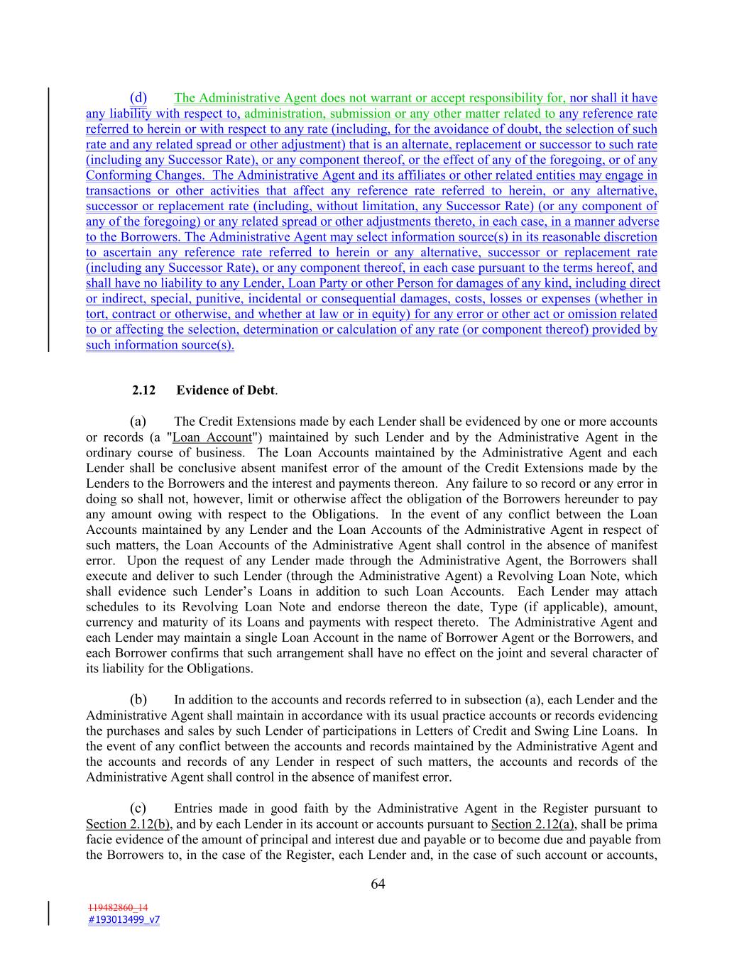 (d) The Administrative Agent does not warrant or accept responsibility for, nor shall it have any liability with respect to, administration, submission or any other matter related to any reference rate referred to herein or with respect to any rate (including, for the avoidance of doubt, the selection of such rate and any related spread or other adjustment) that is an alternate, replacement or successor to such rate (including any Successor Rate), or any component thereof, or the effect of any of the foregoing, or of any Conforming Changes. The Administrative Agent and its affiliates or other related entities may engage in transactions or other activities that affect any reference rate referred to herein, or any alternative, successor or replacement rate (including, without limitation, any Successor Rate) (or any component of any of the foregoing) or any related spread or other adjustments thereto, in each case, in a manner adverse to the Borrowers. The Administrative Agent may select information source(s) in its reasonable discretion to ascertain any reference rate referred to herein or any alternative, successor or replacement rate (including any Successor Rate), or any component thereof, in each case pursuant to the terms hereof, and shall have no liability to any Lender, Loan Party or other Person for damages of any kind, including direct or indirect, special, punitive, incidental or consequential damages, costs, losses or expenses (whether in tort, contract or otherwise, and whether at law or in equity) for any error or other act or omission related to or affecting the selection, determination or calculation of any rate (or component thereof) provided by such information source(s). 2.12 Evidence of Debt. (a) The Credit Extensions made by each Lender shall be evidenced by one or more accounts or records (a "Loan Account") maintained by such Lender and by the Administrative Agent in the ordinary course of business. The Loan Accounts maintained by the Administrative Agent and each Lender shall be conclusive absent manifest error of the amount of the Credit Extensions made by the Lenders to the Borrowers and the interest and payments thereon. Any failure to so record or any error in doing so shall not, however, limit or otherwise affect the obligation of the Borrowers hereunder to pay any amount owing with respect to the Obligations. In the event of any conflict between the Loan Accounts maintained by any Lender and the Loan Accounts of the Administrative Agent in respect of such matters, the Loan Accounts of the Administrative Agent shall control in the absence of manifest error. Upon the request of any Lender made through the Administrative Agent, the Borrowers shall execute and deliver to such Lender (through the Administrative Agent) a Revolving Loan Note, which shall evidence such Lender’s Loans in addition to such Loan Accounts. Each Lender may attach schedules to its Revolving Loan Note and endorse thereon the date, Type (if applicable), amount, currency and maturity of its Loans and payments with respect thereto. The Administrative Agent and each Lender may maintain a single Loan Account in the name of Borrower Agent or the Borrowers, and each Borrower confirms that such arrangement shall have no effect on the joint and several character of its liability for the Obligations. (b) In addition to the accounts and records referred to in subsection (a), each Lender and the Administrative Agent shall maintain in accordance with its usual practice accounts or records evidencing the purchases and sales by such Lender of participations in Letters of Credit and Swing Line Loans. In the event of any conflict between the accounts and records maintained by the Administrative Agent and the accounts and records of any Lender in respect of such matters, the accounts and records of the Administrative Agent shall control in the absence of manifest error. (c) Entries made in good faith by the Administrative Agent in the Register pursuant to Section 2.12(b), and by each Lender in its account or accounts pursuant to Section 2.12(a), shall be prima facie evidence of the amount of principal and interest due and payable or to become due and payable from the Borrowers to, in the case of the Register, each Lender and, in the case of such account or accounts, 64 119482860_14 #193013499_v7