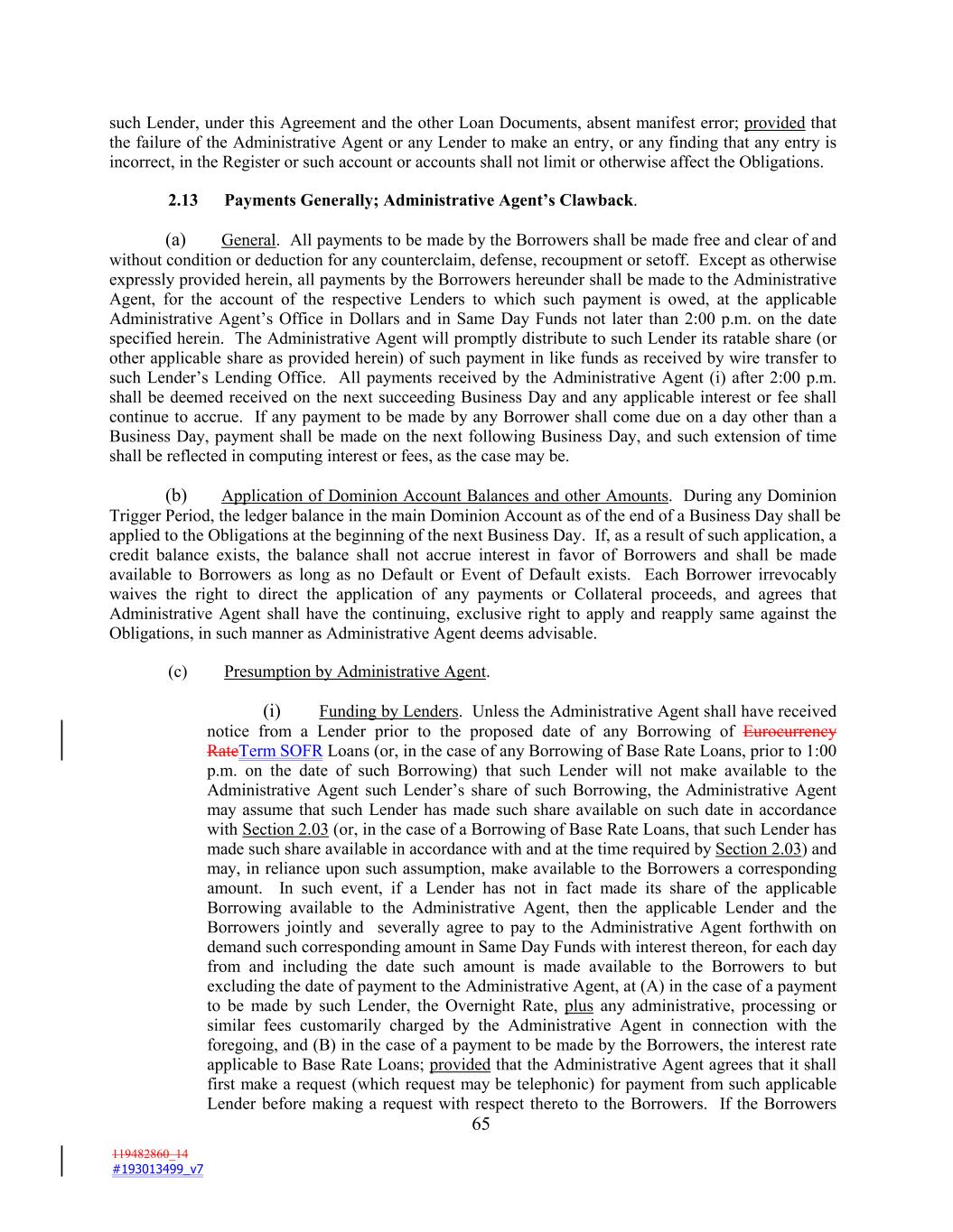 such Lender, under this Agreement and the other Loan Documents, absent manifest error; provided that the failure of the Administrative Agent or any Lender to make an entry, or any finding that any entry is incorrect, in the Register or such account or accounts shall not limit or otherwise affect the Obligations. 2.13 Payments Generally; Administrative Agent’s Clawback. (a) General. All payments to be made by the Borrowers shall be made free and clear of and without condition or deduction for any counterclaim, defense, recoupment or setoff. Except as otherwise expressly provided herein, all payments by the Borrowers hereunder shall be made to the Administrative Agent, for the account of the respective Lenders to which such payment is owed, at the applicable Administrative Agent’s Office in Dollars and in Same Day Funds not later than 2:00 p.m. on the date specified herein. The Administrative Agent will promptly distribute to such Lender its ratable share (or other applicable share as provided herein) of such payment in like funds as received by wire transfer to such Lender’s Lending Office. All payments received by the Administrative Agent (i) after 2:00 p.m. shall be deemed received on the next succeeding Business Day and any applicable interest or fee shall continue to accrue. If any payment to be made by any Borrower shall come due on a day other than a Business Day, payment shall be made on the next following Business Day, and such extension of time shall be reflected in computing interest or fees, as the case may be. (b) Application of Dominion Account Balances and other Amounts. During any Dominion Trigger Period, the ledger balance in the main Dominion Account as of the end of a Business Day shall be applied to the Obligations at the beginning of the next Business Day. If, as a result of such application, a credit balance exists, the balance shall not accrue interest in favor of Borrowers and shall be made available to Borrowers as long as no Default or Event of Default exists. Each Borrower irrevocably waives the right to direct the application of any payments or Collateral proceeds, and agrees that Administrative Agent shall have the continuing, exclusive right to apply and reapply same against the Obligations, in such manner as Administrative Agent deems advisable. (c) Presumption by Administrative Agent. (i) Funding by Lenders. Unless the Administrative Agent shall have received notice from a Lender prior to the proposed date of any Borrowing of Eurocurrency RateTerm SOFR Loans (or, in the case of any Borrowing of Base Rate Loans, prior to 1:00 p.m. on the date of such Borrowing) that such Lender will not make available to the Administrative Agent such Lender’s share of such Borrowing, the Administrative Agent may assume that such Lender has made such share available on such date in accordance with Section 2.03 (or, in the case of a Borrowing of Base Rate Loans, that such Lender has made such share available in accordance with and at the time required by Section 2.03) and may, in reliance upon such assumption, make available to the Borrowers a corresponding amount. In such event, if a Lender has not in fact made its share of the applicable Borrowing available to the Administrative Agent, then the applicable Lender and the Borrowers jointly and severally agree to pay to the Administrative Agent forthwith on demand such corresponding amount in Same Day Funds with interest thereon, for each day from and including the date such amount is made available to the Borrowers to but excluding the date of payment to the Administrative Agent, at (A) in the case of a payment to be made by such Lender, the Overnight Rate, plus any administrative, processing or similar fees customarily charged by the Administrative Agent in connection with the foregoing, and (B) in the case of a payment to be made by the Borrowers, the interest rate applicable to Base Rate Loans; provided that the Administrative Agent agrees that it shall first make a request (which request may be telephonic) for payment from such applicable Lender before making a request with respect thereto to the Borrowers. If the Borrowers 65 119482860_14 #193013499_v7