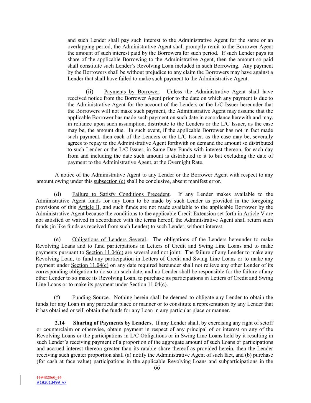 and such Lender shall pay such interest to the Administrative Agent for the same or an overlapping period, the Administrative Agent shall promptly remit to the Borrower Agent the amount of such interest paid by the Borrowers for such period. If such Lender pays its share of the applicable Borrowing to the Administrative Agent, then the amount so paid shall constitute such Lender’s Revolving Loan included in such Borrowing. Any payment by the Borrowers shall be without prejudice to any claim the Borrowers may have against a Lender that shall have failed to make such payment to the Administrative Agent. (ii) Payments by Borrower. Unless the Administrative Agent shall have received notice from the Borrower Agent prior to the date on which any payment is due to the Administrative Agent for the account of the Lenders or the L/C Issuer hereunder that the Borrowers will not make such payment, the Administrative Agent may assume that the applicable Borrower has made such payment on such date in accordance herewith and may, in reliance upon such assumption, distribute to the Lenders or the L/C Issuer, as the case may be, the amount due. In such event, if the applicable Borrower has not in fact made such payment, then each of the Lenders or the L/C Issuer, as the case may be, severally agrees to repay to the Administrative Agent forthwith on demand the amount so distributed to such Lender or the L/C Issuer, in Same Day Funds with interest thereon, for each day from and including the date such amount is distributed to it to but excluding the date of payment to the Administrative Agent, at the Overnight Rate. A notice of the Administrative Agent to any Lender or the Borrower Agent with respect to any amount owing under this subsection (c) shall be conclusive, absent manifest error. (d) Failure to Satisfy Conditions Precedent. If any Lender makes available to the Administrative Agent funds for any Loan to be made by such Lender as provided in the foregoing provisions of this Article II, and such funds are not made available to the applicable Borrower by the Administrative Agent because the conditions to the applicable Credit Extension set forth in Article V are not satisfied or waived in accordance with the terms hereof, the Administrative Agent shall return such funds (in like funds as received from such Lender) to such Lender, without interest. (e) Obligations of Lenders Several. The obligations of the Lenders hereunder to make Revolving Loans and to fund participations in Letters of Credit and Swing Line Loans and to make payments pursuant to Section 11.04(c) are several and not joint. The failure of any Lender to make any Revolving Loan, to fund any participation in Letters of Credit and Swing Line Loans or to make any payment under Section 11.04(c) on any date required hereunder shall not relieve any other Lender of its corresponding obligation to do so on such date, and no Lender shall be responsible for the failure of any other Lender to so make its Revolving Loan, to purchase its participations in Letters of Credit and Swing Line Loans or to make its payment under Section 11.04(c). (f) Funding Source. Nothing herein shall be deemed to obligate any Lender to obtain the funds for any Loan in any particular place or manner or to constitute a representation by any Lender that it has obtained or will obtain the funds for any Loan in any particular place or manner. 2.14 Sharing of Payments by Lenders. If any Lender shall, by exercising any right of setoff or counterclaim or otherwise, obtain payment in respect of any principal of or interest on any of the Revolving Loans or the participations in L/C Obligations or in Swing Line Loans held by it resulting in such Lender’s receiving payment of a proportion of the aggregate amount of such Loans or participations and accrued interest thereon greater than its ratable share thereof as provided herein, then the Lender receiving such greater proportion shall (a) notify the Administrative Agent of such fact, and (b) purchase (for cash at face value) participations in the applicable Revolving Loans and subparticipations in the 66 119482860_14 #193013499_v7