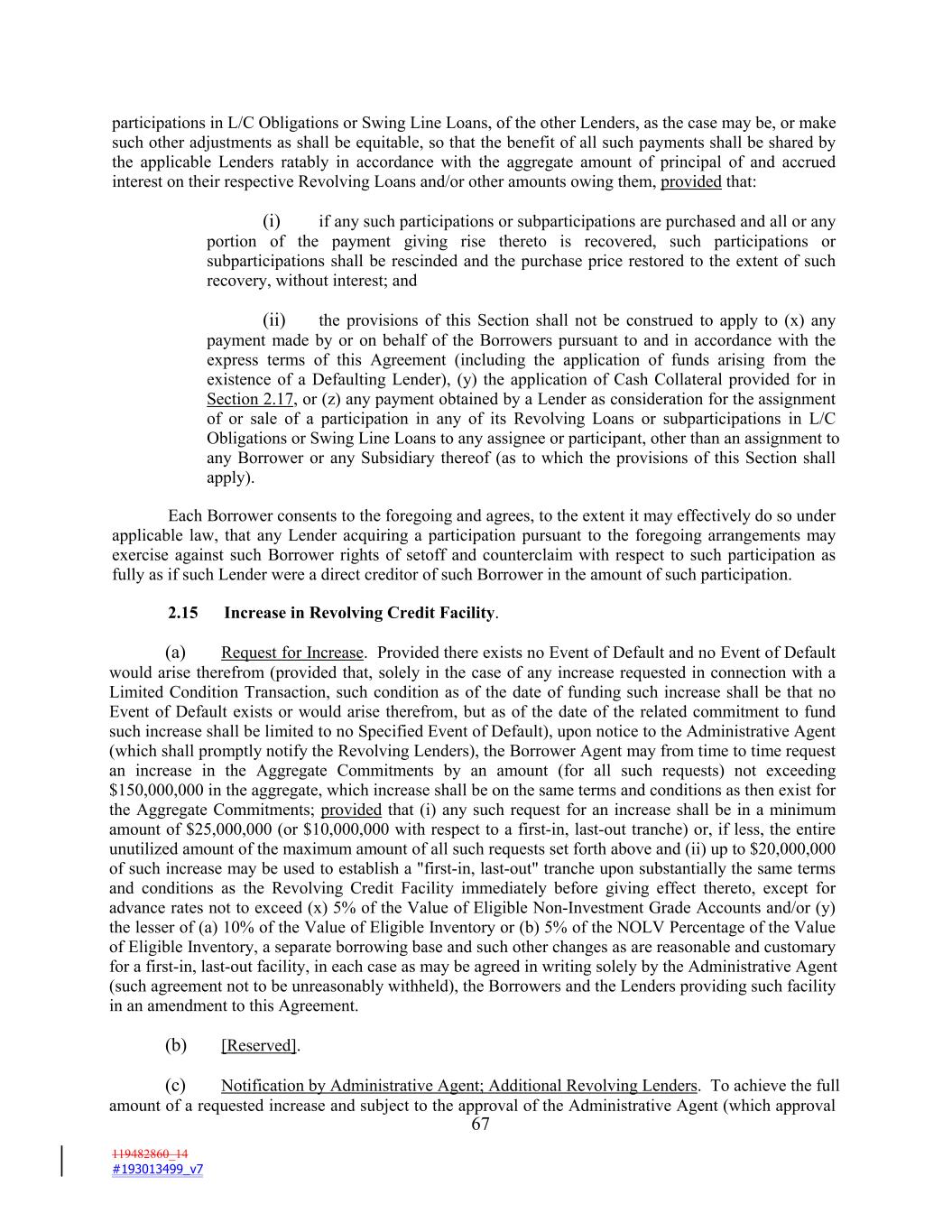 participations in L/C Obligations or Swing Line Loans, of the other Lenders, as the case may be, or make such other adjustments as shall be equitable, so that the benefit of all such payments shall be shared by the applicable Lenders ratably in accordance with the aggregate amount of principal of and accrued interest on their respective Revolving Loans and/or other amounts owing them, provided that: (i) if any such participations or subparticipations are purchased and all or any portion of the payment giving rise thereto is recovered, such participations or subparticipations shall be rescinded and the purchase price restored to the extent of such recovery, without interest; and (ii) the provisions of this Section shall not be construed to apply to (x) any payment made by or on behalf of the Borrowers pursuant to and in accordance with the express terms of this Agreement (including the application of funds arising from the existence of a Defaulting Lender), (y) the application of Cash Collateral provided for in Section 2.17, or (z) any payment obtained by a Lender as consideration for the assignment of or sale of a participation in any of its Revolving Loans or subparticipations in L/C Obligations or Swing Line Loans to any assignee or participant, other than an assignment to any Borrower or any Subsidiary thereof (as to which the provisions of this Section shall apply). Each Borrower consents to the foregoing and agrees, to the extent it may effectively do so under applicable law, that any Lender acquiring a participation pursuant to the foregoing arrangements may exercise against such Borrower rights of setoff and counterclaim with respect to such participation as fully as if such Lender were a direct creditor of such Borrower in the amount of such participation. 2.15 Increase in Revolving Credit Facility. (a) Request for Increase. Provided there exists no Event of Default and no Event of Default would arise therefrom (provided that, solely in the case of any increase requested in connection with a Limited Condition Transaction, such condition as of the date of funding such increase shall be that no Event of Default exists or would arise therefrom, but as of the date of the related commitment to fund such increase shall be limited to no Specified Event of Default), upon notice to the Administrative Agent (which shall promptly notify the Revolving Lenders), the Borrower Agent may from time to time request an increase in the Aggregate Commitments by an amount (for all such requests) not exceeding $150,000,000 in the aggregate, which increase shall be on the same terms and conditions as then exist for the Aggregate Commitments; provided that (i) any such request for an increase shall be in a minimum amount of $25,000,000 (or $10,000,000 with respect to a first-in, last-out tranche) or, if less, the entire unutilized amount of the maximum amount of all such requests set forth above and (ii) up to $20,000,000 of such increase may be used to establish a "first-in, last-out" tranche upon substantially the same terms and conditions as the Revolving Credit Facility immediately before giving effect thereto, except for advance rates not to exceed (x) 5% of the Value of Eligible Non-Investment Grade Accounts and/or (y) the lesser of (a) 10% of the Value of Eligible Inventory or (b) 5% of the NOLV Percentage of the Value of Eligible Inventory, a separate borrowing base and such other changes as are reasonable and customary for a first-in, last-out facility, in each case as may be agreed in writing solely by the Administrative Agent (such agreement not to be unreasonably withheld), the Borrowers and the Lenders providing such facility in an amendment to this Agreement. (b) [Reserved]. (c) Notification by Administrative Agent; Additional Revolving Lenders. To achieve the full amount of a requested increase and subject to the approval of the Administrative Agent (which approval 67 119482860_14 #193013499_v7