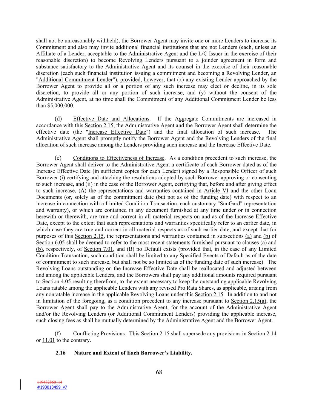 shall not be unreasonably withheld), the Borrower Agent may invite one or more Lenders to increase its Commitment and also may invite additional financial institutions that are not Lenders (each, unless an Affiliate of a Lender, acceptable to the Administrative Agent and the L/C Issuer in the exercise of their reasonable discretion) to become Revolving Lenders pursuant to a joinder agreement in form and substance satisfactory to the Administrative Agent and its counsel in the exercise of their reasonable discretion (each such financial institution issuing a commitment and becoming a Revolving Lender, an "Additional Commitment Lender"), provided, however, that (x) any existing Lender approached by the Borrower Agent to provide all or a portion of any such increase may elect or decline, in its sole discretion, to provide all or any portion of such increase, and (y) without the consent of the Administrative Agent, at no time shall the Commitment of any Additional Commitment Lender be less than $5,000,000. (d) Effective Date and Allocations. If the Aggregate Commitments are increased in accordance with this Section 2.15, the Administrative Agent and the Borrower Agent shall determine the effective date (the "Increase Effective Date") and the final allocation of such increase. The Administrative Agent shall promptly notify the Borrower Agent and the Revolving Lenders of the final allocation of such increase among the Lenders providing such increase and the Increase Effective Date. (e) Conditions to Effectiveness of Increase. As a condition precedent to such increase, the Borrower Agent shall deliver to the Administrative Agent a certificate of each Borrower dated as of the Increase Effective Date (in sufficient copies for each Lender) signed by a Responsible Officer of such Borrower (i) certifying and attaching the resolutions adopted by such Borrower approving or consenting to such increase, and (ii) in the case of the Borrower Agent, certifying that, before and after giving effect to such increase, (A) the representations and warranties contained in Article VI and the other Loan Documents (or, solely as of the commitment date (but not as of the funding date) with respect to an increase in connection with a Limited Condition Transaction, each customary "SunGard" representation and warranty), or which are contained in any document furnished at any time under or in connection herewith or therewith, are true and correct in all material respects on and as of the Increase Effective Date, except to the extent that such representations and warranties specifically refer to an earlier date, in which case they are true and correct in all material respects as of such earlier date, and except that for purposes of this Section 2.15, the representations and warranties contained in subsections (a) and (b) of Section 6.05 shall be deemed to refer to the most recent statements furnished pursuant to clauses (a) and (b), respectively, of Section 7.01, and (B) no Default exists (provided that, in the case of any Limited Condition Transaction, such condition shall be limited to any Specified Events of Default as of the date of commitment to such increase, but shall not be so limited as of the funding date of such increase). The Revolving Loans outstanding on the Increase Effective Date shall be reallocated and adjusted between and among the applicable Lenders, and the Borrowers shall pay any additional amounts required pursuant to Section 4.05 resulting therefrom, to the extent necessary to keep the outstanding applicable Revolving Loans ratable among the applicable Lenders with any revised Pro Rata Shares, as applicable, arising from any nonratable increase in the applicable Revolving Loans under this Section 2.15. In addition to and not in limitation of the foregoing, as a condition precedent to any increase pursuant to Section 2.15(a), the Borrower Agent shall pay to the Administrative Agent, for the account of the Administrative Agent and/or the Revolving Lenders (or Additional Commitment Lenders) providing the applicable increase, such closing fees as shall be mutually determined by the Administrative Agent and the Borrower Agent. (f) Conflicting Provisions. This Section 2.15 shall supersede any provisions in Section 2.14 or 11.01 to the contrary. 2.16 Nature and Extent of Each Borrower’s Liability. 68 119482860_14 #193013499_v7