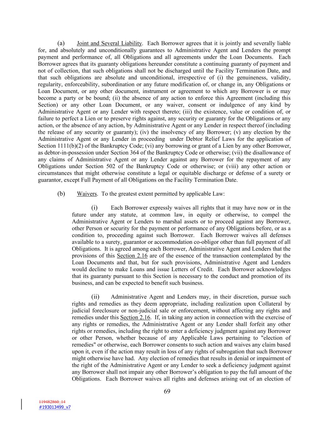 (a) Joint and Several Liability. Each Borrower agrees that it is jointly and severally liable for, and absolutely and unconditionally guarantees to Administrative Agent and Lenders the prompt payment and performance of, all Obligations and all agreements under the Loan Documents. Each Borrower agrees that its guaranty obligations hereunder constitute a continuing guaranty of payment and not of collection, that such obligations shall not be discharged until the Facility Termination Date, and that such obligations are absolute and unconditional, irrespective of (i) the genuineness, validity, regularity, enforceability, subordination or any future modification of, or change in, any Obligations or Loan Document, or any other document, instrument or agreement to which any Borrower is or may become a party or be bound; (ii) the absence of any action to enforce this Agreement (including this Section) or any other Loan Document, or any waiver, consent or indulgence of any kind by Administrative Agent or any Lender with respect thereto; (iii) the existence, value or condition of, or failure to perfect a Lien or to preserve rights against, any security or guaranty for the Obligations or any action, or the absence of any action, by Administrative Agent or any Lender in respect thereof (including the release of any security or guaranty); (iv) the insolvency of any Borrower; (v) any election by the Administrative Agent or any Lender in proceeding under Debtor Relief Laws for the application of Section 1111(b)(2) of the Bankruptcy Code; (vi) any borrowing or grant of a Lien by any other Borrower, as debtor-in-possession under Section 364 of the Bankruptcy Code or otherwise; (vii) the disallowance of any claims of Administrative Agent or any Lender against any Borrower for the repayment of any Obligations under Section 502 of the Bankruptcy Code or otherwise; or (viii) any other action or circumstances that might otherwise constitute a legal or equitable discharge or defense of a surety or guarantor, except Full Payment of all Obligations on the Facility Termination Date. (b) Waivers. To the greatest extent permitted by applicable Law: (i) Each Borrower expressly waives all rights that it may have now or in the future under any statute, at common law, in equity or otherwise, to compel the Administrative Agent or Lenders to marshal assets or to proceed against any Borrower, other Person or security for the payment or performance of any Obligations before, or as a condition to, proceeding against such Borrower. Each Borrower waives all defenses available to a surety, guarantor or accommodation co-obligor other than full payment of all Obligations. It is agreed among each Borrower, Administrative Agent and Lenders that the provisions of this Section 2.16 are of the essence of the transaction contemplated by the Loan Documents and that, but for such provisions, Administrative Agent and Lenders would decline to make Loans and issue Letters of Credit. Each Borrower acknowledges that its guaranty pursuant to this Section is necessary to the conduct and promotion of its business, and can be expected to benefit such business. (ii) Administrative Agent and Lenders may, in their discretion, pursue such rights and remedies as they deem appropriate, including realization upon Collateral by judicial foreclosure or non-judicial sale or enforcement, without affecting any rights and remedies under this Section 2.16. If, in taking any action in connection with the exercise of any rights or remedies, the Administrative Agent or any Lender shall forfeit any other rights or remedies, including the right to enter a deficiency judgment against any Borrower or other Person, whether because of any Applicable Laws pertaining to "election of remedies" or otherwise, each Borrower consents to such action and waives any claim based upon it, even if the action may result in loss of any rights of subrogation that such Borrower might otherwise have had. Any election of remedies that results in denial or impairment of the right of the Administrative Agent or any Lender to seek a deficiency judgment against any Borrower shall not impair any other Borrower’s obligation to pay the full amount of the Obligations. Each Borrower waives all rights and defenses arising out of an election of 69 119482860_14 #193013499_v7