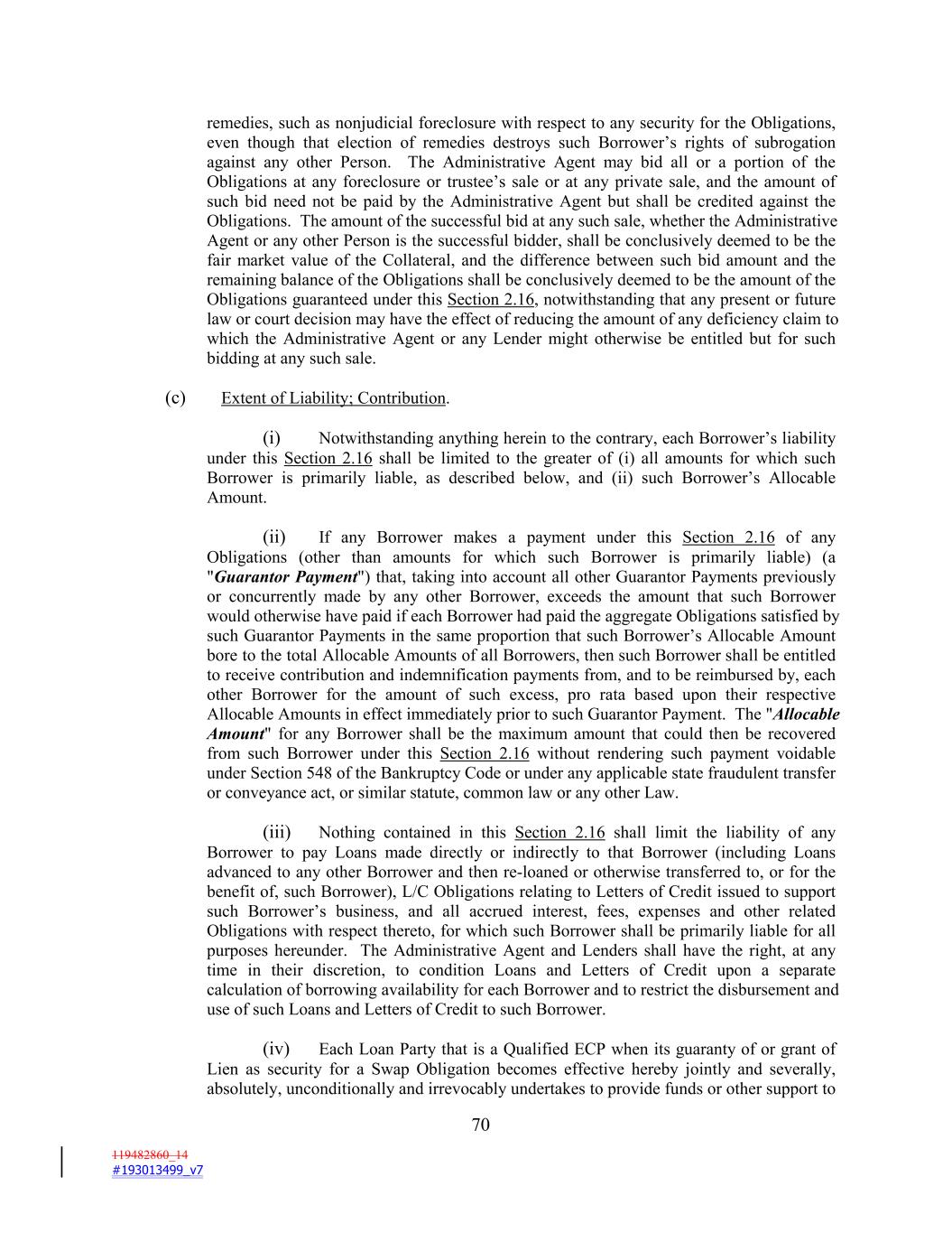 remedies, such as nonjudicial foreclosure with respect to any security for the Obligations, even though that election of remedies destroys such Borrower’s rights of subrogation against any other Person. The Administrative Agent may bid all or a portion of the Obligations at any foreclosure or trustee’s sale or at any private sale, and the amount of such bid need not be paid by the Administrative Agent but shall be credited against the Obligations. The amount of the successful bid at any such sale, whether the Administrative Agent or any other Person is the successful bidder, shall be conclusively deemed to be the fair market value of the Collateral, and the difference between such bid amount and the remaining balance of the Obligations shall be conclusively deemed to be the amount of the Obligations guaranteed under this Section 2.16, notwithstanding that any present or future law or court decision may have the effect of reducing the amount of any deficiency claim to which the Administrative Agent or any Lender might otherwise be entitled but for such bidding at any such sale. (c) Extent of Liability; Contribution. (i) Notwithstanding anything herein to the contrary, each Borrower’s liability under this Section 2.16 shall be limited to the greater of (i) all amounts for which such Borrower is primarily liable, as described below, and (ii) such Borrower’s Allocable Amount. (ii) If any Borrower makes a payment under this Section 2.16 of any Obligations (other than amounts for which such Borrower is primarily liable) (a "Guarantor Payment") that, taking into account all other Guarantor Payments previously or concurrently made by any other Borrower, exceeds the amount that such Borrower would otherwise have paid if each Borrower had paid the aggregate Obligations satisfied by such Guarantor Payments in the same proportion that such Borrower’s Allocable Amount bore to the total Allocable Amounts of all Borrowers, then such Borrower shall be entitled to receive contribution and indemnification payments from, and to be reimbursed by, each other Borrower for the amount of such excess, pro rata based upon their respective Allocable Amounts in effect immediately prior to such Guarantor Payment. The "Allocable Amount" for any Borrower shall be the maximum amount that could then be recovered from such Borrower under this Section 2.16 without rendering such payment voidable under Section 548 of the Bankruptcy Code or under any applicable state fraudulent transfer or conveyance act, or similar statute, common law or any other Law. (iii) Nothing contained in this Section 2.16 shall limit the liability of any Borrower to pay Loans made directly or indirectly to that Borrower (including Loans advanced to any other Borrower and then re-loaned or otherwise transferred to, or for the benefit of, such Borrower), L/C Obligations relating to Letters of Credit issued to support such Borrower’s business, and all accrued interest, fees, expenses and other related Obligations with respect thereto, for which such Borrower shall be primarily liable for all purposes hereunder. The Administrative Agent and Lenders shall have the right, at any time in their discretion, to condition Loans and Letters of Credit upon a separate calculation of borrowing availability for each Borrower and to restrict the disbursement and use of such Loans and Letters of Credit to such Borrower. (iv) Each Loan Party that is a Qualified ECP when its guaranty of or grant of Lien as security for a Swap Obligation becomes effective hereby jointly and severally, absolutely, unconditionally and irrevocably undertakes to provide funds or other support to 70 119482860_14 #193013499_v7
