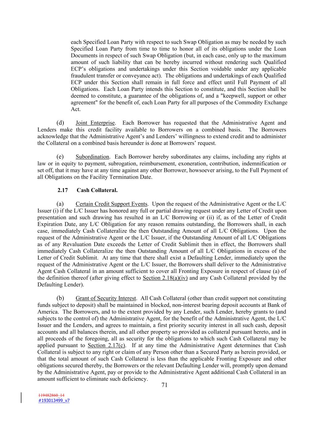 each Specified Loan Party with respect to such Swap Obligation as may be needed by such Specified Loan Party from time to time to honor all of its obligations under the Loan Documents in respect of such Swap Obligation (but, in each case, only up to the maximum amount of such liability that can be hereby incurred without rendering such Qualified ECP’s obligations and undertakings under this Section voidable under any applicable fraudulent transfer or conveyance act). The obligations and undertakings of each Qualified ECP under this Section shall remain in full force and effect until Full Payment of all Obligations. Each Loan Party intends this Section to constitute, and this Section shall be deemed to constitute, a guarantee of the obligations of, and a "keepwell, support or other agreement" for the benefit of, each Loan Party for all purposes of the Commodity Exchange Act. (d) Joint Enterprise. Each Borrower has requested that the Administrative Agent and Lenders make this credit facility available to Borrowers on a combined basis. The Borrowers acknowledge that the Administrative Agent’s and Lenders’ willingness to extend credit and to administer the Collateral on a combined basis hereunder is done at Borrowers’ request. (e) Subordination. Each Borrower hereby subordinates any claims, including any rights at law or in equity to payment, subrogation, reimbursement, exoneration, contribution, indemnification or set off, that it may have at any time against any other Borrower, howsoever arising, to the Full Payment of all Obligations on the Facility Termination Date. 2.17 Cash Collateral. (a) Certain Credit Support Events. Upon the request of the Administrative Agent or the L/C Issuer (i) if the L/C Issuer has honored any full or partial drawing request under any Letter of Credit upon presentation and such drawing has resulted in an L/C Borrowing or (ii) if, as of the Letter of Credit Expiration Date, any L/C Obligation for any reason remains outstanding, the Borrowers shall, in each case, immediately Cash Collateralize the then Outstanding Amount of all L/C Obligations. Upon the request of the Administrative Agent or the L/C Issuer, if the Outstanding Amount of all L/C Obligations as of any Revaluation Date exceeds the Letter of Credit Sublimit then in effect, the Borrowers shall immediately Cash Collateralize the then Outstanding Amount of all L/C Obligations in excess of the Letter of Credit Sublimit. At any time that there shall exist a Defaulting Lender, immediately upon the request of the Administrative Agent or the L/C Issuer, the Borrowers shall deliver to the Administrative Agent Cash Collateral in an amount sufficient to cover all Fronting Exposure in respect of clause (a) of the definition thereof (after giving effect to Section 2.18(a)(iv) and any Cash Collateral provided by the Defaulting Lender). (b) Grant of Security Interest. All Cash Collateral (other than credit support not constituting funds subject to deposit) shall be maintained in blocked, non-interest bearing deposit accounts at Bank of America. The Borrowers, and to the extent provided by any Lender, such Lender, hereby grants to (and subjects to the control of) the Administrative Agent, for the benefit of the Administrative Agent, the L/C Issuer and the Lenders, and agrees to maintain, a first priority security interest in all such cash, deposit accounts and all balances therein, and all other property so provided as collateral pursuant hereto, and in all proceeds of the foregoing, all as security for the obligations to which such Cash Collateral may be applied pursuant to Section 2.17(c). If at any time the Administrative Agent determines that Cash Collateral is subject to any right or claim of any Person other than a Secured Party as herein provided, or that the total amount of such Cash Collateral is less than the applicable Fronting Exposure and other obligations secured thereby, the Borrowers or the relevant Defaulting Lender will, promptly upon demand by the Administrative Agent, pay or provide to the Administrative Agent additional Cash Collateral in an amount sufficient to eliminate such deficiency. 71 119482860_14 #193013499_v7