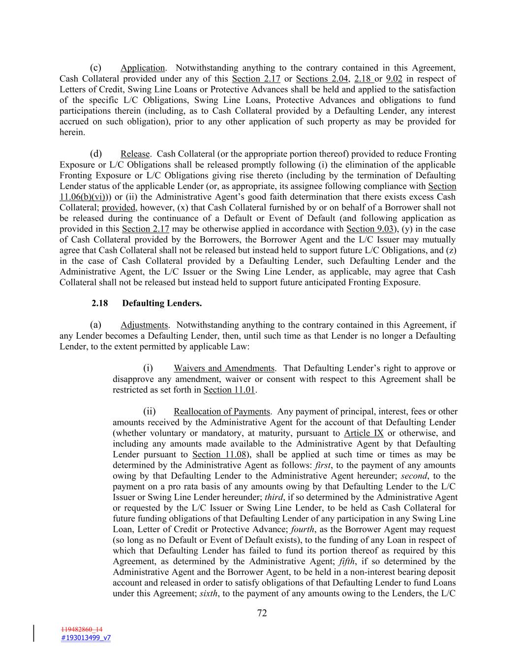 (c) Application. Notwithstanding anything to the contrary contained in this Agreement, Cash Collateral provided under any of this Section 2.17 or Sections 2.04, 2.18 or 9.02 in respect of Letters of Credit, Swing Line Loans or Protective Advances shall be held and applied to the satisfaction of the specific L/C Obligations, Swing Line Loans, Protective Advances and obligations to fund participations therein (including, as to Cash Collateral provided by a Defaulting Lender, any interest accrued on such obligation), prior to any other application of such property as may be provided for herein. (d) Release. Cash Collateral (or the appropriate portion thereof) provided to reduce Fronting Exposure or L/C Obligations shall be released promptly following (i) the elimination of the applicable Fronting Exposure or L/C Obligations giving rise thereto (including by the termination of Defaulting Lender status of the applicable Lender (or, as appropriate, its assignee following compliance with Section 11.06(b)(vi))) or (ii) the Administrative Agent’s good faith determination that there exists excess Cash Collateral; provided, however, (x) that Cash Collateral furnished by or on behalf of a Borrower shall not be released during the continuance of a Default or Event of Default (and following application as provided in this Section 2.17 may be otherwise applied in accordance with Section 9.03), (y) in the case of Cash Collateral provided by the Borrowers, the Borrower Agent and the L/C Issuer may mutually agree that Cash Collateral shall not be released but instead held to support future L/C Obligations, and (z) in the case of Cash Collateral provided by a Defaulting Lender, such Defaulting Lender and the Administrative Agent, the L/C Issuer or the Swing Line Lender, as applicable, may agree that Cash Collateral shall not be released but instead held to support future anticipated Fronting Exposure. 2.18 Defaulting Lenders. (a) Adjustments. Notwithstanding anything to the contrary contained in this Agreement, if any Lender becomes a Defaulting Lender, then, until such time as that Lender is no longer a Defaulting Lender, to the extent permitted by applicable Law: (i) Waivers and Amendments. That Defaulting Lender’s right to approve or disapprove any amendment, waiver or consent with respect to this Agreement shall be restricted as set forth in Section 11.01. (ii) Reallocation of Payments. Any payment of principal, interest, fees or other amounts received by the Administrative Agent for the account of that Defaulting Lender (whether voluntary or mandatory, at maturity, pursuant to Article IX or otherwise, and including any amounts made available to the Administrative Agent by that Defaulting Lender pursuant to Section 11.08), shall be applied at such time or times as may be determined by the Administrative Agent as follows: first, to the payment of any amounts owing by that Defaulting Lender to the Administrative Agent hereunder; second, to the payment on a pro rata basis of any amounts owing by that Defaulting Lender to the L/C Issuer or Swing Line Lender hereunder; third, if so determined by the Administrative Agent or requested by the L/C Issuer or Swing Line Lender, to be held as Cash Collateral for future funding obligations of that Defaulting Lender of any participation in any Swing Line Loan, Letter of Credit or Protective Advance; fourth, as the Borrower Agent may request (so long as no Default or Event of Default exists), to the funding of any Loan in respect of which that Defaulting Lender has failed to fund its portion thereof as required by this Agreement, as determined by the Administrative Agent; fifth, if so determined by the Administrative Agent and the Borrower Agent, to be held in a non-interest bearing deposit account and released in order to satisfy obligations of that Defaulting Lender to fund Loans under this Agreement; sixth, to the payment of any amounts owing to the Lenders, the L/C 72 119482860_14 #193013499_v7