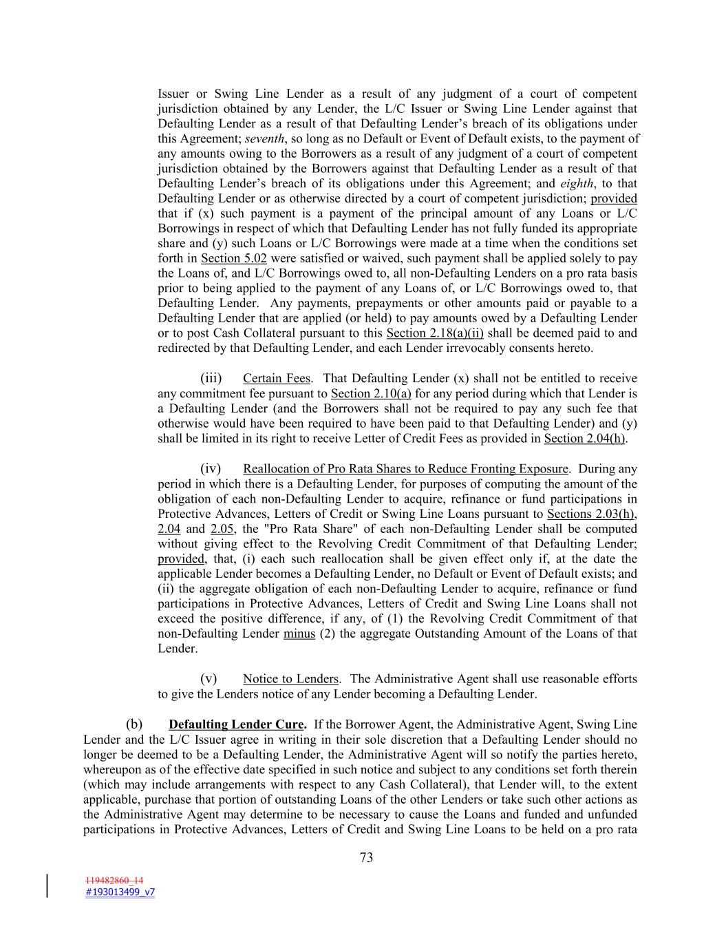 Issuer or Swing Line Lender as a result of any judgment of a court of competent jurisdiction obtained by any Lender, the L/C Issuer or Swing Line Lender against that Defaulting Lender as a result of that Defaulting Lender’s breach of its obligations under this Agreement; seventh, so long as no Default or Event of Default exists, to the payment of any amounts owing to the Borrowers as a result of any judgment of a court of competent jurisdiction obtained by the Borrowers against that Defaulting Lender as a result of that Defaulting Lender’s breach of its obligations under this Agreement; and eighth, to that Defaulting Lender or as otherwise directed by a court of competent jurisdiction; provided that if (x) such payment is a payment of the principal amount of any Loans or L/C Borrowings in respect of which that Defaulting Lender has not fully funded its appropriate share and (y) such Loans or L/C Borrowings were made at a time when the conditions set forth in Section 5.02 were satisfied or waived, such payment shall be applied solely to pay the Loans of, and L/C Borrowings owed to, all non-Defaulting Lenders on a pro rata basis prior to being applied to the payment of any Loans of, or L/C Borrowings owed to, that Defaulting Lender. Any payments, prepayments or other amounts paid or payable to a Defaulting Lender that are applied (or held) to pay amounts owed by a Defaulting Lender or to post Cash Collateral pursuant to this Section 2.18(a)(ii) shall be deemed paid to and redirected by that Defaulting Lender, and each Lender irrevocably consents hereto. (iii) Certain Fees. That Defaulting Lender (x) shall not be entitled to receive any commitment fee pursuant to Section 2.10(a) for any period during which that Lender is a Defaulting Lender (and the Borrowers shall not be required to pay any such fee that otherwise would have been required to have been paid to that Defaulting Lender) and (y) shall be limited in its right to receive Letter of Credit Fees as provided in Section 2.04(h). (iv) Reallocation of Pro Rata Shares to Reduce Fronting Exposure. During any period in which there is a Defaulting Lender, for purposes of computing the amount of the obligation of each non-Defaulting Lender to acquire, refinance or fund participations in Protective Advances, Letters of Credit or Swing Line Loans pursuant to Sections 2.03(h), 2.04 and 2.05, the "Pro Rata Share" of each non-Defaulting Lender shall be computed without giving effect to the Revolving Credit Commitment of that Defaulting Lender; provided, that, (i) each such reallocation shall be given effect only if, at the date the applicable Lender becomes a Defaulting Lender, no Default or Event of Default exists; and (ii) the aggregate obligation of each non-Defaulting Lender to acquire, refinance or fund participations in Protective Advances, Letters of Credit and Swing Line Loans shall not exceed the positive difference, if any, of (1) the Revolving Credit Commitment of that non-Defaulting Lender minus (2) the aggregate Outstanding Amount of the Loans of that Lender. (v) Notice to Lenders. The Administrative Agent shall use reasonable efforts to give the Lenders notice of any Lender becoming a Defaulting Lender. (b) Defaulting Lender Cure. If the Borrower Agent, the Administrative Agent, Swing Line Lender and the L/C Issuer agree in writing in their sole discretion that a Defaulting Lender should no longer be deemed to be a Defaulting Lender, the Administrative Agent will so notify the parties hereto, whereupon as of the effective date specified in such notice and subject to any conditions set forth therein (which may include arrangements with respect to any Cash Collateral), that Lender will, to the extent applicable, purchase that portion of outstanding Loans of the other Lenders or take such other actions as the Administrative Agent may determine to be necessary to cause the Loans and funded and unfunded participations in Protective Advances, Letters of Credit and Swing Line Loans to be held on a pro rata 73 119482860_14 #193013499_v7