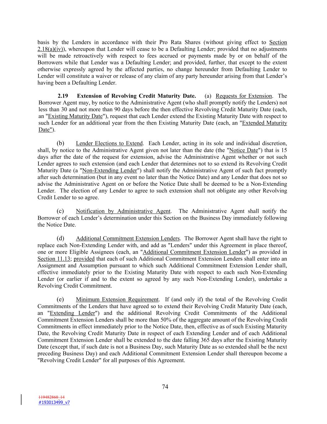 basis by the Lenders in accordance with their Pro Rata Shares (without giving effect to Section 2.18(a)(iv)), whereupon that Lender will cease to be a Defaulting Lender; provided that no adjustments will be made retroactively with respect to fees accrued or payments made by or on behalf of the Borrowers while that Lender was a Defaulting Lender; and provided, further, that except to the extent otherwise expressly agreed by the affected parties, no change hereunder from Defaulting Lender to Lender will constitute a waiver or release of any claim of any party hereunder arising from that Lender’s having been a Defaulting Lender. 2.19 Extension of Revolving Credit Maturity Date. (a) Requests for Extension. The Borrower Agent may, by notice to the Administrative Agent (who shall promptly notify the Lenders) not less than 30 and not more than 90 days before the then effective Revolving Credit Maturity Date (each, an "Existing Maturity Date"), request that each Lender extend the Existing Maturity Date with respect to such Lender for an additional year from the then Existing Maturity Date (each, an "Extended Maturity Date"). (b) Lender Elections to Extend. Each Lender, acting in its sole and individual discretion, shall, by notice to the Administrative Agent given not later than the date (the "Notice Date") that is 15 days after the date of the request for extension, advise the Administrative Agent whether or not such Lender agrees to such extension (and each Lender that determines not to so extend its Revolving Credit Maturity Date (a "Non-Extending Lender") shall notify the Administrative Agent of such fact promptly after such determination (but in any event no later than the Notice Date) and any Lender that does not so advise the Administrative Agent on or before the Notice Date shall be deemed to be a Non-Extending Lender. The election of any Lender to agree to such extension shall not obligate any other Revolving Credit Lender to so agree. (c) Notification by Administrative Agent. The Administrative Agent shall notify the Borrower of each Lender’s determination under this Section on the Business Day immediately following the Notice Date. (d) Additional Commitment Extension Lenders. The Borrower Agent shall have the right to replace each Non-Extending Lender with, and add as "Lenders" under this Agreement in place thereof, one or more Eligible Assignees (each, an "Additional Commitment Extension Lender") as provided in Section 11.13; provided that each of such Additional Commitment Extension Lenders shall enter into an Assignment and Assumption pursuant to which such Additional Commitment Extension Lender shall, effective immediately prior to the Existing Maturity Date with respect to each such Non-Extending Lender (or earlier if and to the extent so agreed by any such Non-Extending Lender), undertake a Revolving Credit Commitment. (e) Minimum Extension Requirement. If (and only if) the total of the Revolving Credit Commitments of the Lenders that have agreed so to extend their Revolving Credit Maturity Date (each, an "Extending Lender") and the additional Revolving Credit Commitments of the Additional Commitment Extension Lenders shall be more than 50% of the aggregate amount of the Revolving Credit Commitments in effect immediately prior to the Notice Date, then, effective as of such Existing Maturity Date, the Revolving Credit Maturity Date in respect of each Extending Lender and of each Additional Commitment Extension Lender shall be extended to the date falling 365 days after the Existing Maturity Date (except that, if such date is not a Business Day, such Maturity Date as so extended shall be the next preceding Business Day) and each Additional Commitment Extension Lender shall thereupon become a "Revolving Credit Lender" for all purposes of this Agreement. 74 119482860_14 #193013499_v7