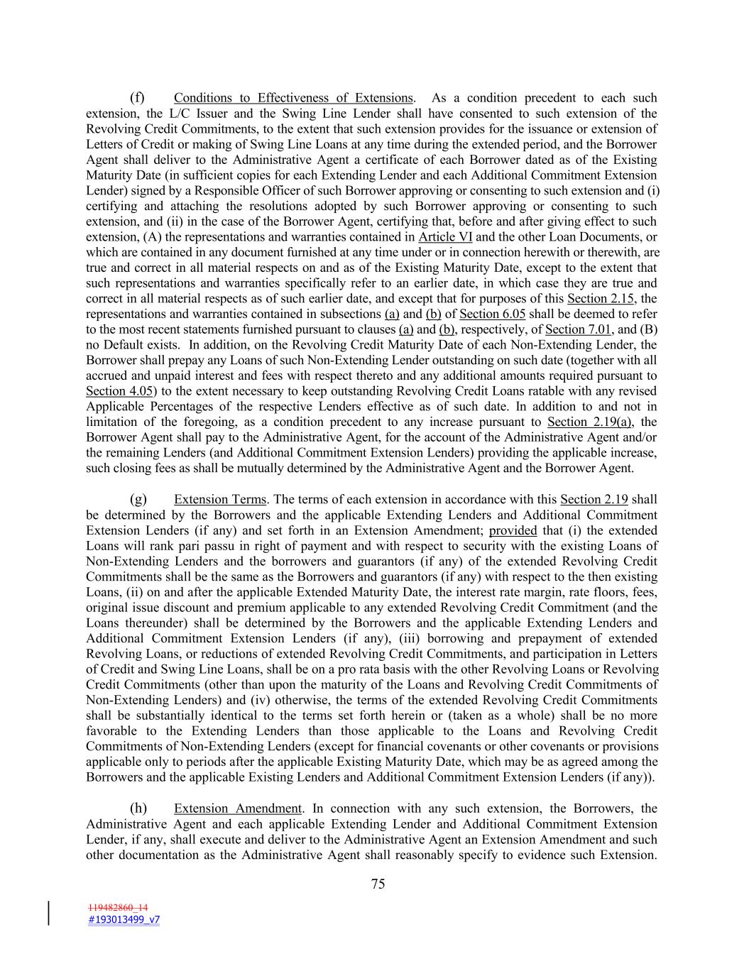 (f) Conditions to Effectiveness of Extensions. As a condition precedent to each such extension, the L/C Issuer and the Swing Line Lender shall have consented to such extension of the Revolving Credit Commitments, to the extent that such extension provides for the issuance or extension of Letters of Credit or making of Swing Line Loans at any time during the extended period, and the Borrower Agent shall deliver to the Administrative Agent a certificate of each Borrower dated as of the Existing Maturity Date (in sufficient copies for each Extending Lender and each Additional Commitment Extension Lender) signed by a Responsible Officer of such Borrower approving or consenting to such extension and (i) certifying and attaching the resolutions adopted by such Borrower approving or consenting to such extension, and (ii) in the case of the Borrower Agent, certifying that, before and after giving effect to such extension, (A) the representations and warranties contained in Article VI and the other Loan Documents, or which are contained in any document furnished at any time under or in connection herewith or therewith, are true and correct in all material respects on and as of the Existing Maturity Date, except to the extent that such representations and warranties specifically refer to an earlier date, in which case they are true and correct in all material respects as of such earlier date, and except that for purposes of this Section 2.15, the representations and warranties contained in subsections (a) and (b) of Section 6.05 shall be deemed to refer to the most recent statements furnished pursuant to clauses (a) and (b), respectively, of Section 7.01, and (B) no Default exists. In addition, on the Revolving Credit Maturity Date of each Non-Extending Lender, the Borrower shall prepay any Loans of such Non-Extending Lender outstanding on such date (together with all accrued and unpaid interest and fees with respect thereto and any additional amounts required pursuant to Section 4.05) to the extent necessary to keep outstanding Revolving Credit Loans ratable with any revised Applicable Percentages of the respective Lenders effective as of such date. In addition to and not in limitation of the foregoing, as a condition precedent to any increase pursuant to Section 2.19(a), the Borrower Agent shall pay to the Administrative Agent, for the account of the Administrative Agent and/or the remaining Lenders (and Additional Commitment Extension Lenders) providing the applicable increase, such closing fees as shall be mutually determined by the Administrative Agent and the Borrower Agent. (g) Extension Terms. The terms of each extension in accordance with this Section 2.19 shall be determined by the Borrowers and the applicable Extending Lenders and Additional Commitment Extension Lenders (if any) and set forth in an Extension Amendment; provided that (i) the extended Loans will rank pari passu in right of payment and with respect to security with the existing Loans of Non-Extending Lenders and the borrowers and guarantors (if any) of the extended Revolving Credit Commitments shall be the same as the Borrowers and guarantors (if any) with respect to the then existing Loans, (ii) on and after the applicable Extended Maturity Date, the interest rate margin, rate floors, fees, original issue discount and premium applicable to any extended Revolving Credit Commitment (and the Loans thereunder) shall be determined by the Borrowers and the applicable Extending Lenders and Additional Commitment Extension Lenders (if any), (iii) borrowing and prepayment of extended Revolving Loans, or reductions of extended Revolving Credit Commitments, and participation in Letters of Credit and Swing Line Loans, shall be on a pro rata basis with the other Revolving Loans or Revolving Credit Commitments (other than upon the maturity of the Loans and Revolving Credit Commitments of Non-Extending Lenders) and (iv) otherwise, the terms of the extended Revolving Credit Commitments shall be substantially identical to the terms set forth herein or (taken as a whole) shall be no more favorable to the Extending Lenders than those applicable to the Loans and Revolving Credit Commitments of Non-Extending Lenders (except for financial covenants or other covenants or provisions applicable only to periods after the applicable Existing Maturity Date, which may be as agreed among the Borrowers and the applicable Existing Lenders and Additional Commitment Extension Lenders (if any)). (h) Extension Amendment. In connection with any such extension, the Borrowers, the Administrative Agent and each applicable Extending Lender and Additional Commitment Extension Lender, if any, shall execute and deliver to the Administrative Agent an Extension Amendment and such other documentation as the Administrative Agent shall reasonably specify to evidence such Extension. 75 119482860_14 #193013499_v7