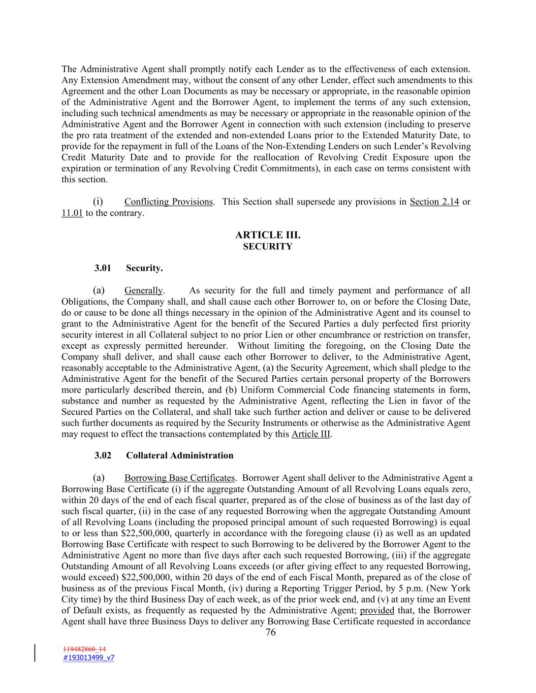 The Administrative Agent shall promptly notify each Lender as to the effectiveness of each extension. Any Extension Amendment may, without the consent of any other Lender, effect such amendments to this Agreement and the other Loan Documents as may be necessary or appropriate, in the reasonable opinion of the Administrative Agent and the Borrower Agent, to implement the terms of any such extension, including such technical amendments as may be necessary or appropriate in the reasonable opinion of the Administrative Agent and the Borrower Agent in connection with such extension (including to preserve the pro rata treatment of the extended and non-extended Loans prior to the Extended Maturity Date, to provide for the repayment in full of the Loans of the Non-Extending Lenders on such Lender’s Revolving Credit Maturity Date and to provide for the reallocation of Revolving Credit Exposure upon the expiration or termination of any Revolving Credit Commitments), in each case on terms consistent with this section. (i) Conflicting Provisions. This Section shall supersede any provisions in Section 2.14 or 11.01 to the contrary. ARTICLE III. SECURITY 3.01 Security. (a) Generally. As security for the full and timely payment and performance of all Obligations, the Company shall, and shall cause each other Borrower to, on or before the Closing Date, do or cause to be done all things necessary in the opinion of the Administrative Agent and its counsel to grant to the Administrative Agent for the benefit of the Secured Parties a duly perfected first priority security interest in all Collateral subject to no prior Lien or other encumbrance or restriction on transfer, except as expressly permitted hereunder. Without limiting the foregoing, on the Closing Date the Company shall deliver, and shall cause each other Borrower to deliver, to the Administrative Agent, reasonably acceptable to the Administrative Agent, (a) the Security Agreement, which shall pledge to the Administrative Agent for the benefit of the Secured Parties certain personal property of the Borrowers more particularly described therein, and (b) Uniform Commercial Code financing statements in form, substance and number as requested by the Administrative Agent, reflecting the Lien in favor of the Secured Parties on the Collateral, and shall take such further action and deliver or cause to be delivered such further documents as required by the Security Instruments or otherwise as the Administrative Agent may request to effect the transactions contemplated by this Article III. 3.02 Collateral Administration (a) Borrowing Base Certificates. Borrower Agent shall deliver to the Administrative Agent a Borrowing Base Certificate (i) if the aggregate Outstanding Amount of all Revolving Loans equals zero, within 20 days of the end of each fiscal quarter, prepared as of the close of business as of the last day of such fiscal quarter, (ii) in the case of any requested Borrowing when the aggregate Outstanding Amount of all Revolving Loans (including the proposed principal amount of such requested Borrowing) is equal to or less than $22,500,000, quarterly in accordance with the foregoing clause (i) as well as an updated Borrowing Base Certificate with respect to such Borrowing to be delivered by the Borrower Agent to the Administrative Agent no more than five days after each such requested Borrowing, (iii) if the aggregate Outstanding Amount of all Revolving Loans exceeds (or after giving effect to any requested Borrowing, would exceed) $22,500,000, within 20 days of the end of each Fiscal Month, prepared as of the close of business as of the previous Fiscal Month, (iv) during a Reporting Trigger Period, by 5 p.m. (New York City time) by the third Business Day of each week, as of the prior week end, and (v) at any time an Event of Default exists, as frequently as requested by the Administrative Agent; provided that, the Borrower Agent shall have three Business Days to deliver any Borrowing Base Certificate requested in accordance 76 119482860_14 #193013499_v7