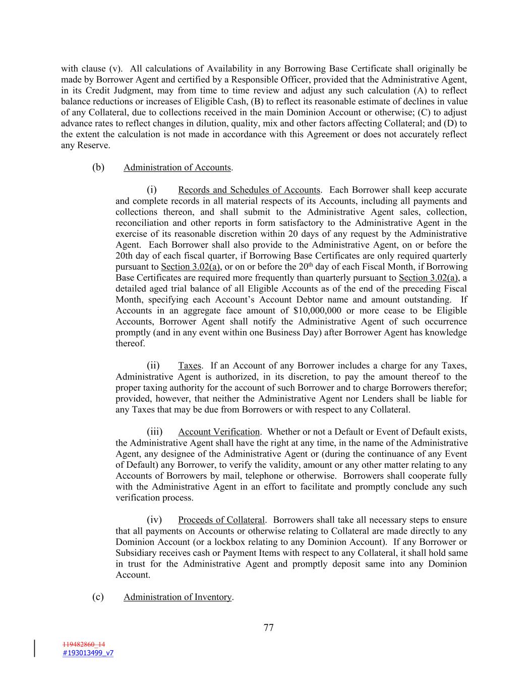with clause (v). All calculations of Availability in any Borrowing Base Certificate shall originally be made by Borrower Agent and certified by a Responsible Officer, provided that the Administrative Agent, in its Credit Judgment, may from time to time review and adjust any such calculation (A) to reflect balance reductions or increases of Eligible Cash, (B) to reflect its reasonable estimate of declines in value of any Collateral, due to collections received in the main Dominion Account or otherwise; (C) to adjust advance rates to reflect changes in dilution, quality, mix and other factors affecting Collateral; and (D) to the extent the calculation is not made in accordance with this Agreement or does not accurately reflect any Reserve. (b) Administration of Accounts. (i) Records and Schedules of Accounts. Each Borrower shall keep accurate and complete records in all material respects of its Accounts, including all payments and collections thereon, and shall submit to the Administrative Agent sales, collection, reconciliation and other reports in form satisfactory to the Administrative Agent in the exercise of its reasonable discretion within 20 days of any request by the Administrative Agent. Each Borrower shall also provide to the Administrative Agent, on or before the 20th day of each fiscal quarter, if Borrowing Base Certificates are only required quarterly pursuant to Section 3.02(a), or on or before the 20th day of each Fiscal Month, if Borrowing Base Certificates are required more frequently than quarterly pursuant to Section 3.02(a), a detailed aged trial balance of all Eligible Accounts as of the end of the preceding Fiscal Month, specifying each Account’s Account Debtor name and amount outstanding. If Accounts in an aggregate face amount of $10,000,000 or more cease to be Eligible Accounts, Borrower Agent shall notify the Administrative Agent of such occurrence promptly (and in any event within one Business Day) after Borrower Agent has knowledge thereof. (ii) Taxes. If an Account of any Borrower includes a charge for any Taxes, Administrative Agent is authorized, in its discretion, to pay the amount thereof to the proper taxing authority for the account of such Borrower and to charge Borrowers therefor; provided, however, that neither the Administrative Agent nor Lenders shall be liable for any Taxes that may be due from Borrowers or with respect to any Collateral. (iii) Account Verification. Whether or not a Default or Event of Default exists, the Administrative Agent shall have the right at any time, in the name of the Administrative Agent, any designee of the Administrative Agent or (during the continuance of any Event of Default) any Borrower, to verify the validity, amount or any other matter relating to any Accounts of Borrowers by mail, telephone or otherwise. Borrowers shall cooperate fully with the Administrative Agent in an effort to facilitate and promptly conclude any such verification process. (iv) Proceeds of Collateral. Borrowers shall take all necessary steps to ensure that all payments on Accounts or otherwise relating to Collateral are made directly to any Dominion Account (or a lockbox relating to any Dominion Account). If any Borrower or Subsidiary receives cash or Payment Items with respect to any Collateral, it shall hold same in trust for the Administrative Agent and promptly deposit same into any Dominion Account. (c) Administration of Inventory. 77 119482860_14 #193013499_v7