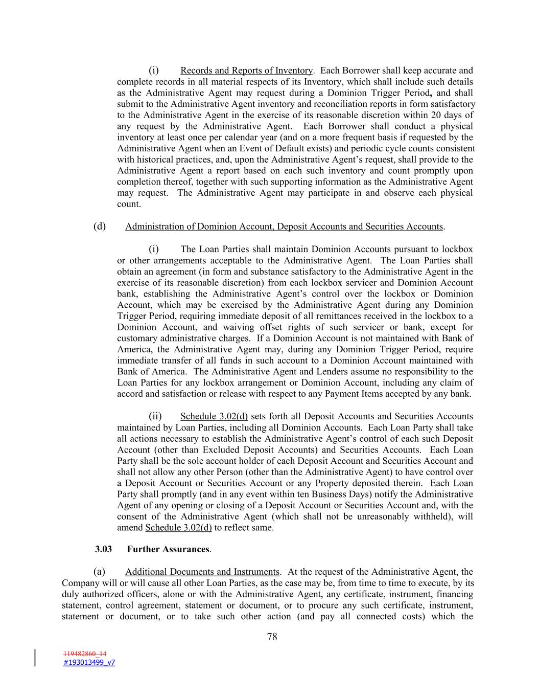 (i) Records and Reports of Inventory. Each Borrower shall keep accurate and complete records in all material respects of its Inventory, which shall include such details as the Administrative Agent may request during a Dominion Trigger Period, and shall submit to the Administrative Agent inventory and reconciliation reports in form satisfactory to the Administrative Agent in the exercise of its reasonable discretion within 20 days of any request by the Administrative Agent. Each Borrower shall conduct a physical inventory at least once per calendar year (and on a more frequent basis if requested by the Administrative Agent when an Event of Default exists) and periodic cycle counts consistent with historical practices, and, upon the Administrative Agent’s request, shall provide to the Administrative Agent a report based on each such inventory and count promptly upon completion thereof, together with such supporting information as the Administrative Agent may request. The Administrative Agent may participate in and observe each physical count. (d) Administration of Dominion Account, Deposit Accounts and Securities Accounts. (i) The Loan Parties shall maintain Dominion Accounts pursuant to lockbox or other arrangements acceptable to the Administrative Agent. The Loan Parties shall obtain an agreement (in form and substance satisfactory to the Administrative Agent in the exercise of its reasonable discretion) from each lockbox servicer and Dominion Account bank, establishing the Administrative Agent’s control over the lockbox or Dominion Account, which may be exercised by the Administrative Agent during any Dominion Trigger Period, requiring immediate deposit of all remittances received in the lockbox to a Dominion Account, and waiving offset rights of such servicer or bank, except for customary administrative charges. If a Dominion Account is not maintained with Bank of America, the Administrative Agent may, during any Dominion Trigger Period, require immediate transfer of all funds in such account to a Dominion Account maintained with Bank of America. The Administrative Agent and Lenders assume no responsibility to the Loan Parties for any lockbox arrangement or Dominion Account, including any claim of accord and satisfaction or release with respect to any Payment Items accepted by any bank. (ii) Schedule 3.02(d) sets forth all Deposit Accounts and Securities Accounts maintained by Loan Parties, including all Dominion Accounts. Each Loan Party shall take all actions necessary to establish the Administrative Agent’s control of each such Deposit Account (other than Excluded Deposit Accounts) and Securities Accounts. Each Loan Party shall be the sole account holder of each Deposit Account and Securities Account and shall not allow any other Person (other than the Administrative Agent) to have control over a Deposit Account or Securities Account or any Property deposited therein. Each Loan Party shall promptly (and in any event within ten Business Days) notify the Administrative Agent of any opening or closing of a Deposit Account or Securities Account and, with the consent of the Administrative Agent (which shall not be unreasonably withheld), will amend Schedule 3.02(d) to reflect same. 3.03 Further Assurances. (a) Additional Documents and Instruments. At the request of the Administrative Agent, the Company will or will cause all other Loan Parties, as the case may be, from time to time to execute, by its duly authorized officers, alone or with the Administrative Agent, any certificate, instrument, financing statement, control agreement, statement or document, or to procure any such certificate, instrument, statement or document, or to take such other action (and pay all connected costs) which the 78 119482860_14 #193013499_v7