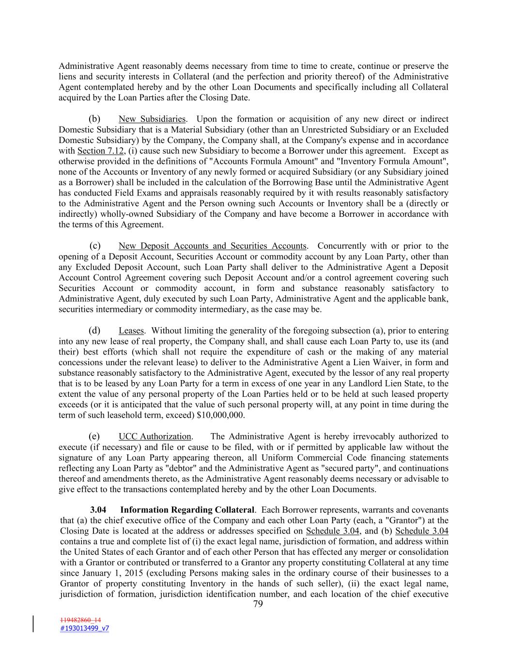 Administrative Agent reasonably deems necessary from time to time to create, continue or preserve the liens and security interests in Collateral (and the perfection and priority thereof) of the Administrative Agent contemplated hereby and by the other Loan Documents and specifically including all Collateral acquired by the Loan Parties after the Closing Date. (b) New Subsidiaries. Upon the formation or acquisition of any new direct or indirect Domestic Subsidiary that is a Material Subsidiary (other than an Unrestricted Subsidiary or an Excluded Domestic Subsidiary) by the Company, the Company shall, at the Company's expense and in accordance with Section 7.12, (i) cause such new Subsidiary to become a Borrower under this agreement. Except as otherwise provided in the definitions of "Accounts Formula Amount" and "Inventory Formula Amount", none of the Accounts or Inventory of any newly formed or acquired Subsidiary (or any Subsidiary joined as a Borrower) shall be included in the calculation of the Borrowing Base until the Administrative Agent has conducted Field Exams and appraisals reasonably required by it with results reasonably satisfactory to the Administrative Agent and the Person owning such Accounts or Inventory shall be a (directly or indirectly) wholly-owned Subsidiary of the Company and have become a Borrower in accordance with the terms of this Agreement. (c) New Deposit Accounts and Securities Accounts. Concurrently with or prior to the opening of a Deposit Account, Securities Account or commodity account by any Loan Party, other than any Excluded Deposit Account, such Loan Party shall deliver to the Administrative Agent a Deposit Account Control Agreement covering such Deposit Account and/or a control agreement covering such Securities Account or commodity account, in form and substance reasonably satisfactory to Administrative Agent, duly executed by such Loan Party, Administrative Agent and the applicable bank, securities intermediary or commodity intermediary, as the case may be. (d) Leases. Without limiting the generality of the foregoing subsection (a), prior to entering into any new lease of real property, the Company shall, and shall cause each Loan Party to, use its (and their) best efforts (which shall not require the expenditure of cash or the making of any material concessions under the relevant lease) to deliver to the Administrative Agent a Lien Waiver, in form and substance reasonably satisfactory to the Administrative Agent, executed by the lessor of any real property that is to be leased by any Loan Party for a term in excess of one year in any Landlord Lien State, to the extent the value of any personal property of the Loan Parties held or to be held at such leased property exceeds (or it is anticipated that the value of such personal property will, at any point in time during the term of such leasehold term, exceed) $10,000,000. (e) UCC Authorization. The Administrative Agent is hereby irrevocably authorized to execute (if necessary) and file or cause to be filed, with or if permitted by applicable law without the signature of any Loan Party appearing thereon, all Uniform Commercial Code financing statements reflecting any Loan Party as "debtor" and the Administrative Agent as "secured party", and continuations thereof and amendments thereto, as the Administrative Agent reasonably deems necessary or advisable to give effect to the transactions contemplated hereby and by the other Loan Documents. 3.04 Information Regarding Collateral. Each Borrower represents, warrants and covenants that (a) the chief executive office of the Company and each other Loan Party (each, a "Grantor") at the Closing Date is located at the address or addresses specified on Schedule 3.04, and (b) Schedule 3.04 contains a true and complete list of (i) the exact legal name, jurisdiction of formation, and address within the United States of each Grantor and of each other Person that has effected any merger or consolidation with a Grantor or contributed or transferred to a Grantor any property constituting Collateral at any time since January 1, 2015 (excluding Persons making sales in the ordinary course of their businesses to a Grantor of property constituting Inventory in the hands of such seller), (ii) the exact legal name, jurisdiction of formation, jurisdiction identification number, and each location of the chief executive 79 119482860_14 #193013499_v7