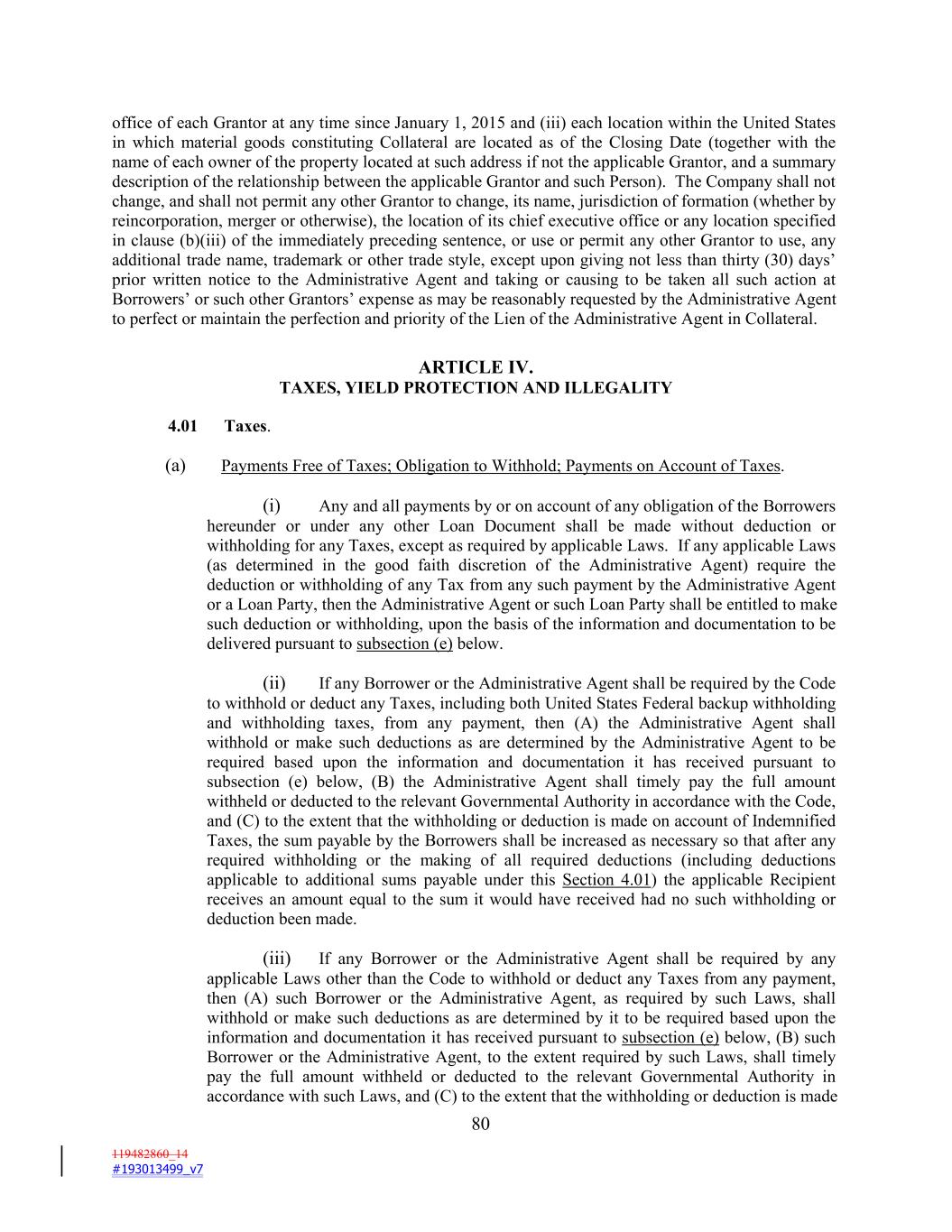 office of each Grantor at any time since January 1, 2015 and (iii) each location within the United States in which material goods constituting Collateral are located as of the Closing Date (together with the name of each owner of the property located at such address if not the applicable Grantor, and a summary description of the relationship between the applicable Grantor and such Person). The Company shall not change, and shall not permit any other Grantor to change, its name, jurisdiction of formation (whether by reincorporation, merger or otherwise), the location of its chief executive office or any location specified in clause (b)(iii) of the immediately preceding sentence, or use or permit any other Grantor to use, any additional trade name, trademark or other trade style, except upon giving not less than thirty (30) days’ prior written notice to the Administrative Agent and taking or causing to be taken all such action at Borrowers’ or such other Grantors’ expense as may be reasonably requested by the Administrative Agent to perfect or maintain the perfection and priority of the Lien of the Administrative Agent in Collateral. ARTICLE IV. TAXES, YIELD PROTECTION AND ILLEGALITY 4.01 Taxes. (a) Payments Free of Taxes; Obligation to Withhold; Payments on Account of Taxes. (i) Any and all payments by or on account of any obligation of the Borrowers hereunder or under any other Loan Document shall be made without deduction or withholding for any Taxes, except as required by applicable Laws. If any applicable Laws (as determined in the good faith discretion of the Administrative Agent) require the deduction or withholding of any Tax from any such payment by the Administrative Agent or a Loan Party, then the Administrative Agent or such Loan Party shall be entitled to make such deduction or withholding, upon the basis of the information and documentation to be delivered pursuant to subsection (e) below. (ii) If any Borrower or the Administrative Agent shall be required by the Code to withhold or deduct any Taxes, including both United States Federal backup withholding and withholding taxes, from any payment, then (A) the Administrative Agent shall withhold or make such deductions as are determined by the Administrative Agent to be required based upon the information and documentation it has received pursuant to subsection (e) below, (B) the Administrative Agent shall timely pay the full amount withheld or deducted to the relevant Governmental Authority in accordance with the Code, and (C) to the extent that the withholding or deduction is made on account of Indemnified Taxes, the sum payable by the Borrowers shall be increased as necessary so that after any required withholding or the making of all required deductions (including deductions applicable to additional sums payable under this Section 4.01) the applicable Recipient receives an amount equal to the sum it would have received had no such withholding or deduction been made. (iii) If any Borrower or the Administrative Agent shall be required by any applicable Laws other than the Code to withhold or deduct any Taxes from any payment, then (A) such Borrower or the Administrative Agent, as required by such Laws, shall withhold or make such deductions as are determined by it to be required based upon the information and documentation it has received pursuant to subsection (e) below, (B) such Borrower or the Administrative Agent, to the extent required by such Laws, shall timely pay the full amount withheld or deducted to the relevant Governmental Authority in accordance with such Laws, and (C) to the extent that the withholding or deduction is made 80 119482860_14 #193013499_v7