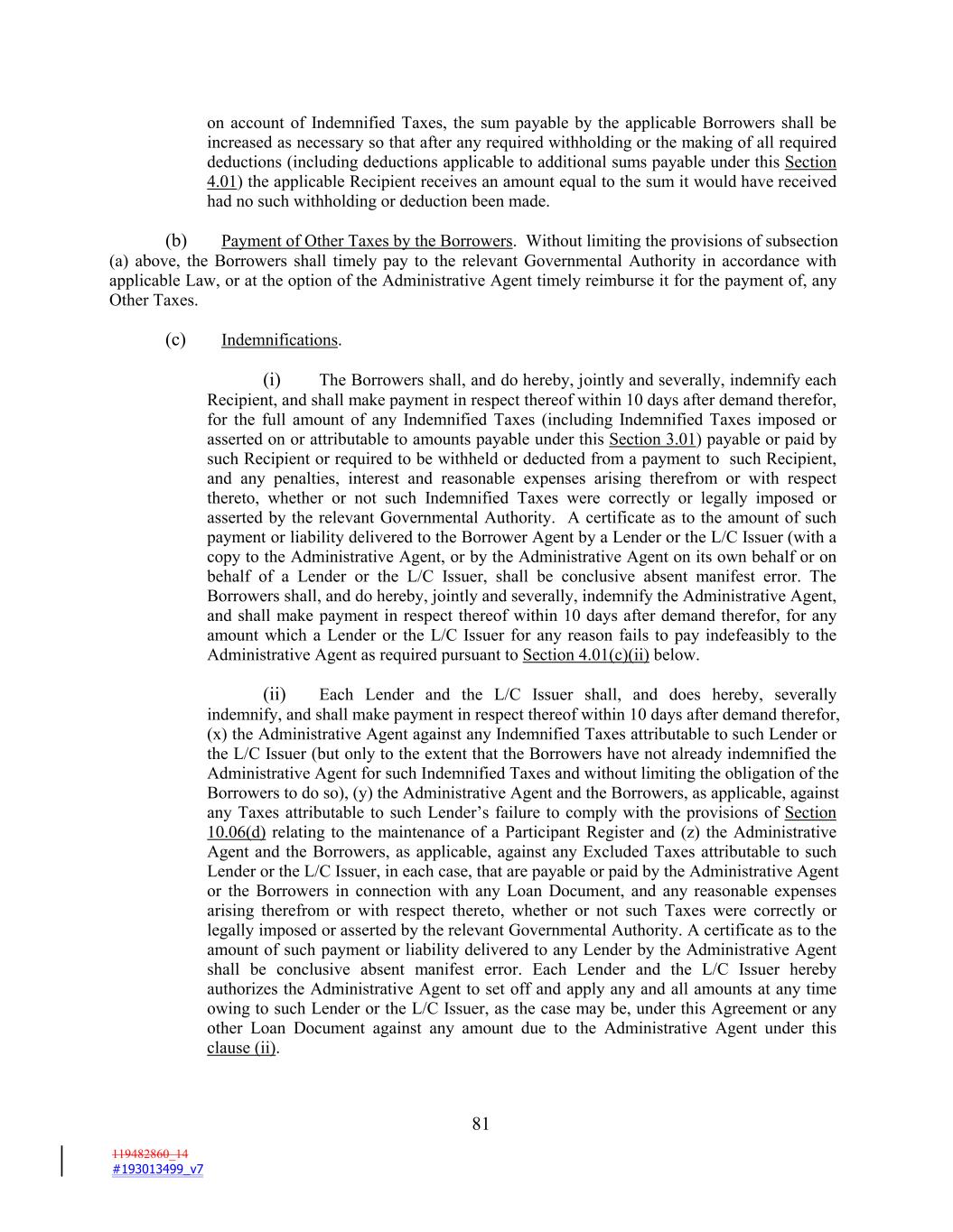 on account of Indemnified Taxes, the sum payable by the applicable Borrowers shall be increased as necessary so that after any required withholding or the making of all required deductions (including deductions applicable to additional sums payable under this Section 4.01) the applicable Recipient receives an amount equal to the sum it would have received had no such withholding or deduction been made. (b) Payment of Other Taxes by the Borrowers. Without limiting the provisions of subsection (a) above, the Borrowers shall timely pay to the relevant Governmental Authority in accordance with applicable Law, or at the option of the Administrative Agent timely reimburse it for the payment of, any Other Taxes. (c) Indemnifications. (i) The Borrowers shall, and do hereby, jointly and severally, indemnify each Recipient, and shall make payment in respect thereof within 10 days after demand therefor, for the full amount of any Indemnified Taxes (including Indemnified Taxes imposed or asserted on or attributable to amounts payable under this Section 3.01) payable or paid by such Recipient or required to be withheld or deducted from a payment to such Recipient, and any penalties, interest and reasonable expenses arising therefrom or with respect thereto, whether or not such Indemnified Taxes were correctly or legally imposed or asserted by the relevant Governmental Authority. A certificate as to the amount of such payment or liability delivered to the Borrower Agent by a Lender or the L/C Issuer (with a copy to the Administrative Agent, or by the Administrative Agent on its own behalf or on behalf of a Lender or the L/C Issuer, shall be conclusive absent manifest error. The Borrowers shall, and do hereby, jointly and severally, indemnify the Administrative Agent, and shall make payment in respect thereof within 10 days after demand therefor, for any amount which a Lender or the L/C Issuer for any reason fails to pay indefeasibly to the Administrative Agent as required pursuant to Section 4.01(c)(ii) below. (ii) Each Lender and the L/C Issuer shall, and does hereby, severally indemnify, and shall make payment in respect thereof within 10 days after demand therefor, (x) the Administrative Agent against any Indemnified Taxes attributable to such Lender or the L/C Issuer (but only to the extent that the Borrowers have not already indemnified the Administrative Agent for such Indemnified Taxes and without limiting the obligation of the Borrowers to do so), (y) the Administrative Agent and the Borrowers, as applicable, against any Taxes attributable to such Lender’s failure to comply with the provisions of Section 10.06(d) relating to the maintenance of a Participant Register and (z) the Administrative Agent and the Borrowers, as applicable, against any Excluded Taxes attributable to such Lender or the L/C Issuer, in each case, that are payable or paid by the Administrative Agent or the Borrowers in connection with any Loan Document, and any reasonable expenses arising therefrom or with respect thereto, whether or not such Taxes were correctly or legally imposed or asserted by the relevant Governmental Authority. A certificate as to the amount of such payment or liability delivered to any Lender by the Administrative Agent shall be conclusive absent manifest error. Each Lender and the L/C Issuer hereby authorizes the Administrative Agent to set off and apply any and all amounts at any time owing to such Lender or the L/C Issuer, as the case may be, under this Agreement or any other Loan Document against any amount due to the Administrative Agent under this clause (ii). 81 119482860_14 #193013499_v7