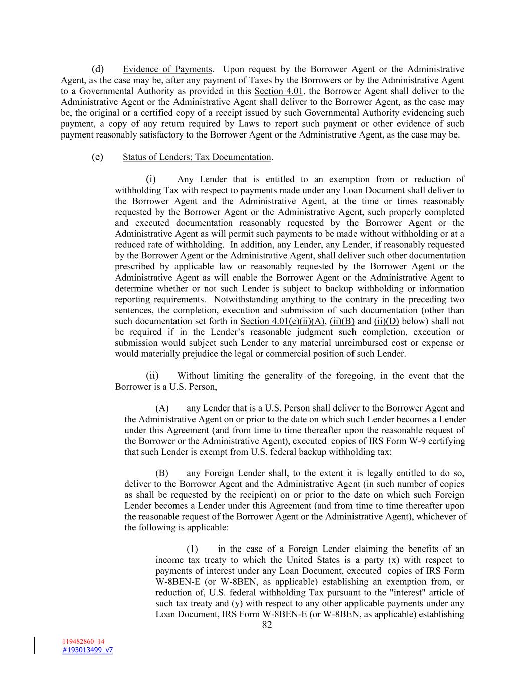 (d) Evidence of Payments. Upon request by the Borrower Agent or the Administrative Agent, as the case may be, after any payment of Taxes by the Borrowers or by the Administrative Agent to a Governmental Authority as provided in this Section 4.01, the Borrower Agent shall deliver to the Administrative Agent or the Administrative Agent shall deliver to the Borrower Agent, as the case may be, the original or a certified copy of a receipt issued by such Governmental Authority evidencing such payment, a copy of any return required by Laws to report such payment or other evidence of such payment reasonably satisfactory to the Borrower Agent or the Administrative Agent, as the case may be. (e) Status of Lenders; Tax Documentation. (i) Any Lender that is entitled to an exemption from or reduction of withholding Tax with respect to payments made under any Loan Document shall deliver to the Borrower Agent and the Administrative Agent, at the time or times reasonably requested by the Borrower Agent or the Administrative Agent, such properly completed and executed documentation reasonably requested by the Borrower Agent or the Administrative Agent as will permit such payments to be made without withholding or at a reduced rate of withholding. In addition, any Lender, any Lender, if reasonably requested by the Borrower Agent or the Administrative Agent, shall deliver such other documentation prescribed by applicable law or reasonably requested by the Borrower Agent or the Administrative Agent as will enable the Borrower Agent or the Administrative Agent to determine whether or not such Lender is subject to backup withholding or information reporting requirements. Notwithstanding anything to the contrary in the preceding two sentences, the completion, execution and submission of such documentation (other than such documentation set forth in Section 4.01(e)(ii)(A), (ii)(B) and (ii)(D) below) shall not be required if in the Lender’s reasonable judgment such completion, execution or submission would subject such Lender to any material unreimbursed cost or expense or would materially prejudice the legal or commercial position of such Lender. (ii) Without limiting the generality of the foregoing, in the event that the Borrower is a U.S. Person, (A) any Lender that is a U.S. Person shall deliver to the Borrower Agent and the Administrative Agent on or prior to the date on which such Lender becomes a Lender under this Agreement (and from time to time thereafter upon the reasonable request of the Borrower or the Administrative Agent), executed copies of IRS Form W-9 certifying that such Lender is exempt from U.S. federal backup withholding tax; (B) any Foreign Lender shall, to the extent it is legally entitled to do so, deliver to the Borrower Agent and the Administrative Agent (in such number of copies as shall be requested by the recipient) on or prior to the date on which such Foreign Lender becomes a Lender under this Agreement (and from time to time thereafter upon the reasonable request of the Borrower Agent or the Administrative Agent), whichever of the following is applicable: (1) in the case of a Foreign Lender claiming the benefits of an income tax treaty to which the United States is a party (x) with respect to payments of interest under any Loan Document, executed copies of IRS Form W-8BEN-E (or W-8BEN, as applicable) establishing an exemption from, or reduction of, U.S. federal withholding Tax pursuant to the "interest" article of such tax treaty and (y) with respect to any other applicable payments under any Loan Document, IRS Form W-8BEN-E (or W-8BEN, as applicable) establishing 82 119482860_14 #193013499_v7