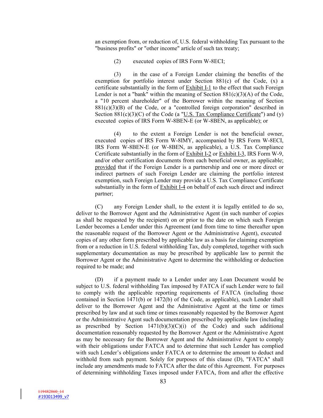 an exemption from, or reduction of, U.S. federal withholding Tax pursuant to the "business profits" or "other income" article of such tax treaty; (2) executed copies of IRS Form W-8ECI; (3) in the case of a Foreign Lender claiming the benefits of the exemption for portfolio interest under Section 881(c) of the Code, (x) a certificate substantially in the form of Exhibit I-1 to the effect that such Foreign Lender is not a "bank" within the meaning of Section 881(c)(3)(A) of the Code, a "10 percent shareholder" of the Borrower within the meaning of Section 881(c)(3)(B) of the Code, or a "controlled foreign corporation" described in Section 881(c)(3)(C) of the Code (a "U.S. Tax Compliance Certificate") and (y) executed copies of IRS Form W-8BEN-E (or W-8BEN, as applicable); or (4) to the extent a Foreign Lender is not the beneficial owner, executed copies of IRS Form W-8IMY, accompanied by IRS Form W-8ECI, IRS Form W-8BEN-E (or W-8BEN, as applicable), a U.S. Tax Compliance Certificate substantially in the form of Exhibit I-2 or Exhibit I-3, IRS Form W-9, and/or other certification documents from each beneficial owner, as applicable; provided that if the Foreign Lender is a partnership and one or more direct or indirect partners of such Foreign Lender are claiming the portfolio interest exemption, such Foreign Lender may provide a U.S. Tax Compliance Certificate substantially in the form of Exhibit I-4 on behalf of each such direct and indirect partner; (C) any Foreign Lender shall, to the extent it is legally entitled to do so, deliver to the Borrower Agent and the Administrative Agent (in such number of copies as shall be requested by the recipient) on or prior to the date on which such Foreign Lender becomes a Lender under this Agreement (and from time to time thereafter upon the reasonable request of the Borrower Agent or the Administrative Agent), executed copies of any other form prescribed by applicable law as a basis for claiming exemption from or a reduction in U.S. federal withholding Tax, duly completed, together with such supplementary documentation as may be prescribed by applicable law to permit the Borrower Agent or the Administrative Agent to determine the withholding or deduction required to be made; and (D) if a payment made to a Lender under any Loan Document would be subject to U.S. federal withholding Tax imposed by FATCA if such Lender were to fail to comply with the applicable reporting requirements of FATCA (including those contained in Section 1471(b) or 1472(b) of the Code, as applicable), such Lender shall deliver to the Borrower Agent and the Administrative Agent at the time or times prescribed by law and at such time or times reasonably requested by the Borrower Agent or the Administrative Agent such documentation prescribed by applicable law (including as prescribed by Section 1471(b)(3)(C)(i) of the Code) and such additional documentation reasonably requested by the Borrower Agent or the Administrative Agent as may be necessary for the Borrower Agent and the Administrative Agent to comply with their obligations under FATCA and to determine that such Lender has complied with such Lender’s obligations under FATCA or to determine the amount to deduct and withhold from such payment. Solely for purposes of this clause (D), "FATCA" shall include any amendments made to FATCA after the date of this Agreement. For purposes of determining withholding Taxes imposed under FATCA, from and after the effective 83 119482860_14 #193013499_v7