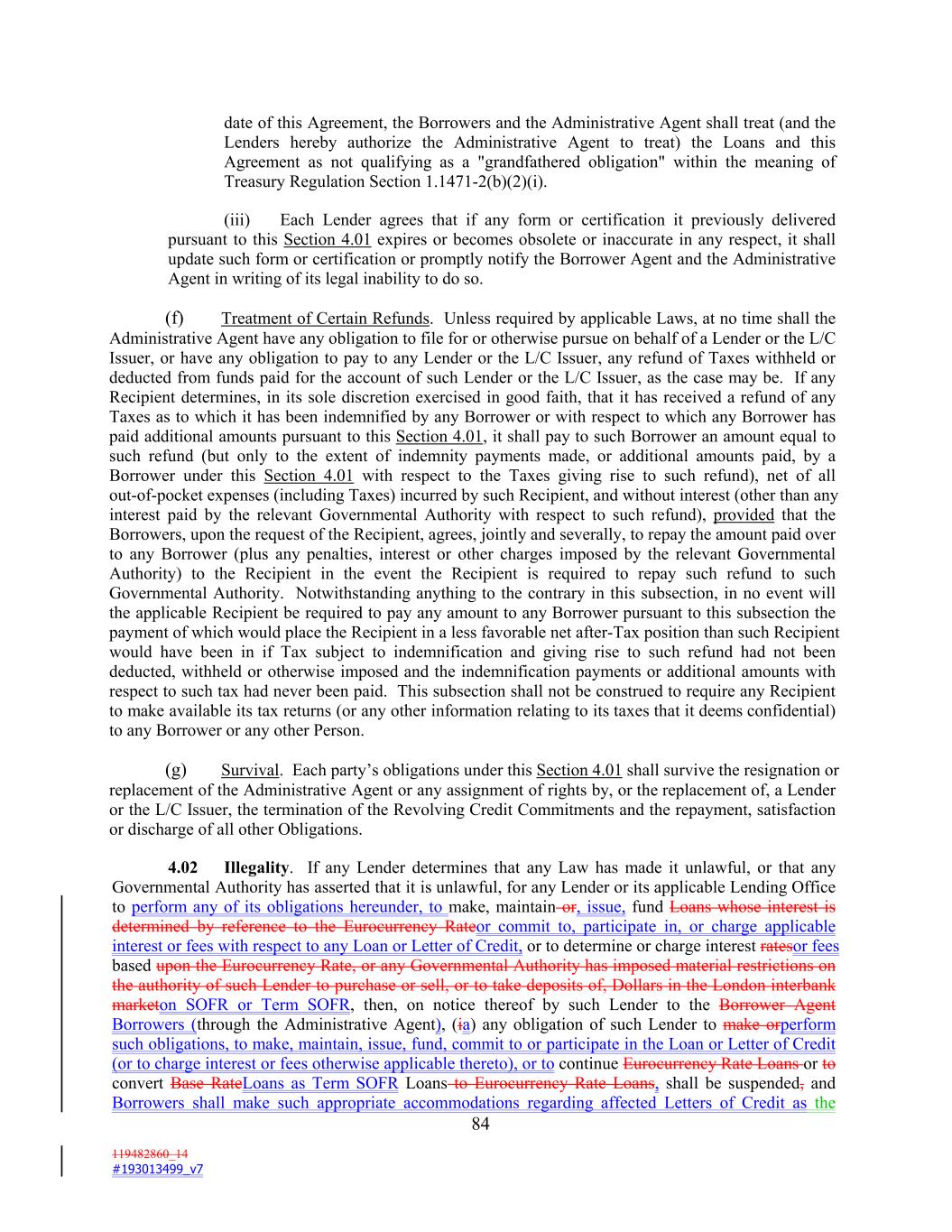 date of this Agreement, the Borrowers and the Administrative Agent shall treat (and the Lenders hereby authorize the Administrative Agent to treat) the Loans and this Agreement as not qualifying as a "grandfathered obligation" within the meaning of Treasury Regulation Section 1.1471-2(b)(2)(i). (iii) Each Lender agrees that if any form or certification it previously delivered pursuant to this Section 4.01 expires or becomes obsolete or inaccurate in any respect, it shall update such form or certification or promptly notify the Borrower Agent and the Administrative Agent in writing of its legal inability to do so. (f) Treatment of Certain Refunds. Unless required by applicable Laws, at no time shall the Administrative Agent have any obligation to file for or otherwise pursue on behalf of a Lender or the L/C Issuer, or have any obligation to pay to any Lender or the L/C Issuer, any refund of Taxes withheld or deducted from funds paid for the account of such Lender or the L/C Issuer, as the case may be. If any Recipient determines, in its sole discretion exercised in good faith, that it has received a refund of any Taxes as to which it has been indemnified by any Borrower or with respect to which any Borrower has paid additional amounts pursuant to this Section 4.01, it shall pay to such Borrower an amount equal to such refund (but only to the extent of indemnity payments made, or additional amounts paid, by a Borrower under this Section 4.01 with respect to the Taxes giving rise to such refund), net of all out-of-pocket expenses (including Taxes) incurred by such Recipient, and without interest (other than any interest paid by the relevant Governmental Authority with respect to such refund), provided that the Borrowers, upon the request of the Recipient, agrees, jointly and severally, to repay the amount paid over to any Borrower (plus any penalties, interest or other charges imposed by the relevant Governmental Authority) to the Recipient in the event the Recipient is required to repay such refund to such Governmental Authority. Notwithstanding anything to the contrary in this subsection, in no event will the applicable Recipient be required to pay any amount to any Borrower pursuant to this subsection the payment of which would place the Recipient in a less favorable net after-Tax position than such Recipient would have been in if Tax subject to indemnification and giving rise to such refund had not been deducted, withheld or otherwise imposed and the indemnification payments or additional amounts with respect to such tax had never been paid. This subsection shall not be construed to require any Recipient to make available its tax returns (or any other information relating to its taxes that it deems confidential) to any Borrower or any other Person. (g) Survival. Each party’s obligations under this Section 4.01 shall survive the resignation or replacement of the Administrative Agent or any assignment of rights by, or the replacement of, a Lender or the L/C Issuer, the termination of the Revolving Credit Commitments and the repayment, satisfaction or discharge of all other Obligations. 4.02 Illegality. If any Lender determines that any Law has made it unlawful, or that any Governmental Authority has asserted that it is unlawful, for any Lender or its applicable Lending Office to perform any of its obligations hereunder, to make, maintain or, issue, fund Loans whose interest is determined by reference to the Eurocurrency Rateor commit to, participate in, or charge applicable interest or fees with respect to any Loan or Letter of Credit, or to determine or charge interest ratesor fees based upon the Eurocurrency Rate, or any Governmental Authority has imposed material restrictions on the authority of such Lender to purchase or sell, or to take deposits of, Dollars in the London interbank marketon SOFR or Term SOFR, then, on notice thereof by such Lender to the Borrower Agent Borrowers (through the Administrative Agent), (ia) any obligation of such Lender to make orperform such obligations, to make, maintain, issue, fund, commit to or participate in the Loan or Letter of Credit (or to charge interest or fees otherwise applicable thereto), or to continue Eurocurrency Rate Loans or to convert Base RateLoans as Term SOFR Loans to Eurocurrency Rate Loans, shall be suspended, and Borrowers shall make such appropriate accommodations regarding affected Letters of Credit as the 84 119482860_14 #193013499_v7