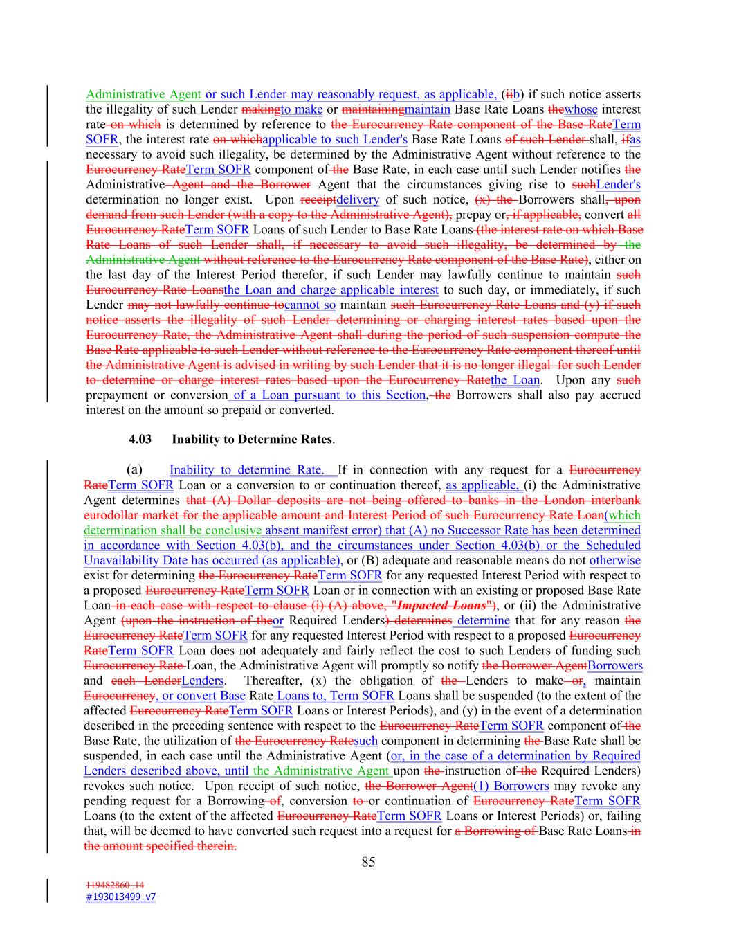 Administrative Agent or such Lender may reasonably request, as applicable, (iib) if such notice asserts the illegality of such Lender makingto make or maintainingmaintain Base Rate Loans thewhose interest rate on which is determined by reference to the Eurocurrency Rate component of the Base RateTerm SOFR, the interest rate on whichapplicable to such Lender's Base Rate Loans of such Lender shall, ifas necessary to avoid such illegality, be determined by the Administrative Agent without reference to the Eurocurrency RateTerm SOFR component of the Base Rate, in each case until such Lender notifies the Administrative Agent and the Borrower Agent that the circumstances giving rise to suchLender's determination no longer exist. Upon receiptdelivery of such notice, (x) the Borrowers shall, upon demand from such Lender (with a copy to the Administrative Agent), prepay or, if applicable, convert all Eurocurrency RateTerm SOFR Loans of such Lender to Base Rate Loans (the interest rate on which Base Rate Loans of such Lender shall, if necessary to avoid such illegality, be determined by the Administrative Agent without reference to the Eurocurrency Rate component of the Base Rate), either on the last day of the Interest Period therefor, if such Lender may lawfully continue to maintain such Eurocurrency Rate Loansthe Loan and charge applicable interest to such day, or immediately, if such Lender may not lawfully continue tocannot so maintain such Eurocurrency Rate Loans and (y) if such notice asserts the illegality of such Lender determining or charging interest rates based upon the Eurocurrency Rate, the Administrative Agent shall during the period of such suspension compute the Base Rate applicable to such Lender without reference to the Eurocurrency Rate component thereof until the Administrative Agent is advised in writing by such Lender that it is no longer illegal for such Lender to determine or charge interest rates based upon the Eurocurrency Ratethe Loan. Upon any such prepayment or conversion of a Loan pursuant to this Section, the Borrowers shall also pay accrued interest on the amount so prepaid or converted. 4.03 Inability to Determine Rates. (a) Inability to determine Rate. If in connection with any request for a Eurocurrency RateTerm SOFR Loan or a conversion to or continuation thereof, as applicable, (i) the Administrative Agent determines that (A) Dollar deposits are not being offered to banks in the London interbank eurodollar market for the applicable amount and Interest Period of such Eurocurrency Rate Loan(which determination shall be conclusive absent manifest error) that (A) no Successor Rate has been determined in accordance with Section 4.03(b), and the circumstances under Section 4.03(b) or the Scheduled Unavailability Date has occurred (as applicable), or (B) adequate and reasonable means do not otherwise exist for determining the Eurocurrency RateTerm SOFR for any requested Interest Period with respect to a proposed Eurocurrency RateTerm SOFR Loan or in connection with an existing or proposed Base Rate Loan in each case with respect to clause (i) (A) above, "Impacted Loans"), or (ii) the Administrative Agent (upon the instruction of theor Required Lenders) determines determine that for any reason the Eurocurrency RateTerm SOFR for any requested Interest Period with respect to a proposed Eurocurrency RateTerm SOFR Loan does not adequately and fairly reflect the cost to such Lenders of funding such Eurocurrency Rate Loan, the Administrative Agent will promptly so notify the Borrower AgentBorrowers and each LenderLenders. Thereafter, (x) the obligation of the Lenders to make or, maintain Eurocurrency, or convert Base Rate Loans to, Term SOFR Loans shall be suspended (to the extent of the affected Eurocurrency RateTerm SOFR Loans or Interest Periods), and (y) in the event of a determination described in the preceding sentence with respect to the Eurocurrency RateTerm SOFR component of the Base Rate, the utilization of the Eurocurrency Ratesuch component in determining the Base Rate shall be suspended, in each case until the Administrative Agent (or, in the case of a determination by Required Lenders described above, until the Administrative Agent upon the instruction of the Required Lenders) revokes such notice. Upon receipt of such notice, the Borrower Agent(1) Borrowers may revoke any pending request for a Borrowing of, conversion to or continuation of Eurocurrency RateTerm SOFR Loans (to the extent of the affected Eurocurrency RateTerm SOFR Loans or Interest Periods) or, failing that, will be deemed to have converted such request into a request for a Borrowing of Base Rate Loans in the amount specified therein. 85 119482860_14 #193013499_v7