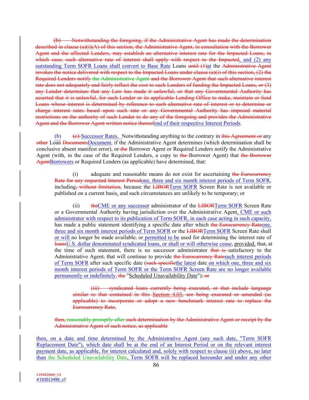 (b) Notwithstanding the foregoing, if the Administrative Agent has made the determination described in clause (a)(i)(A) of this section, the Administrative Agent, in consultation with the Borrower Agent and the affected Lenders, may establish an alternative interest rate for the Impacted Loans, in which case, such alternative rate of interest shall apply with respect to the Impacted, and (2) any outstanding Term SOFR Loans shall convert to Base Rate Loans until (1)at the Administrative Agent revokes the notice delivered with respect to the Impacted Loans under clause (a)(i) of this section, (2) the Required Lenders notify the Administrative Agent and the Borrower Agent that such alternative interest rate does not adequately and fairly reflect the cost to such Lenders of funding the Impacted Loans, or (3) any Lender determines that any Law has made it unlawful, or that any Governmental Authority has asserted that it is unlawful, for such Lender or its applicable Lending Office to make, maintain or fund Loans whose interest is determined by reference to such alternative rate of interest or to determine or charge interest rates based upon such rate or any Governmental Authority has imposed material restrictions on the authority of such Lender to do any of the foregoing and provides the Administrative Agent and the Borrower Agent written notice thereofend of their respective Interest Periods. (b) (c) Successor Rates. Notwithstanding anything to the contrary in this Agreement or any other Loan DocumentsDocument, if the Administrative Agent determines (which determination shall be conclusive absent manifest error), or the Borrower Agent or Required Lenders notify the Administrative Agent (with, in the case of the Required Lenders, a copy to the Borrower Agent) that the Borrower AgentBorrowers or Required Lenders (as applicable) have determined, that: (i) adequate and reasonable means do not exist for ascertaining the Eurocurrency Rate for any requested Interest Periodone, three and six month interest periods of Term SOFR, including, without limitation, because the LIBORTerm SOFR Screen Rate is not available or published on a current basis, and such circumstances are unlikely to be temporary; or (ii) theCME or any successor administrator of the LIBORTerm SOFR Screen Rate or a Governmental Authority having jurisdiction over the Administrative Agent, CME or such administrator with respect to its publication of Term SOFR, in each case acting in such capacity, has made a public statement identifying a specific date after which the Eurocurrency Rateone, three and six month interest periods of Term SOFR or the LIBORTerm SOFR Screen Rate shall or will no longer be made available, or permitted to be used for determining the interest rate of loansU.S. dollar denominated syndicated loans, or shall or will otherwise cease, provided, that, at the time of such statement, there is no successor administrator that is satisfactory to the Administrative Agent, that will continue to provide the Eurocurrency Ratesuch interest periods of Term SOFR after such specific date (such specificthe latest date on which one, three and six month interest periods of Term SOFR or the Term SOFR Screen Rate are no longer available permanently or indefinitely, the "Scheduled Unavailability Date"); or (iii) syndicated loans currently being executed, or that include language similar to that contained in this Section 4.03, are being executed or amended (as applicable) to incorporate or adopt a new benchmark interest rate to replace the Eurocurrency Rate, then, reasonably promptly after such determination by the Administrative Agent or receipt by the Administrative Agent of such notice, as applicable then, on a date and time determined by the Administrative Agent (any such date, "Term SOFR Replacement Date"), which date shall be at the end of an Interest Period or on the relevant interest payment date, as applicable, for interest calculated and, solely with respect to clause (ii) above, no later than the Scheduled Unavailability Date, Term SOFR will be replaced hereunder and under any other 86 119482860_14 #193013499_v7