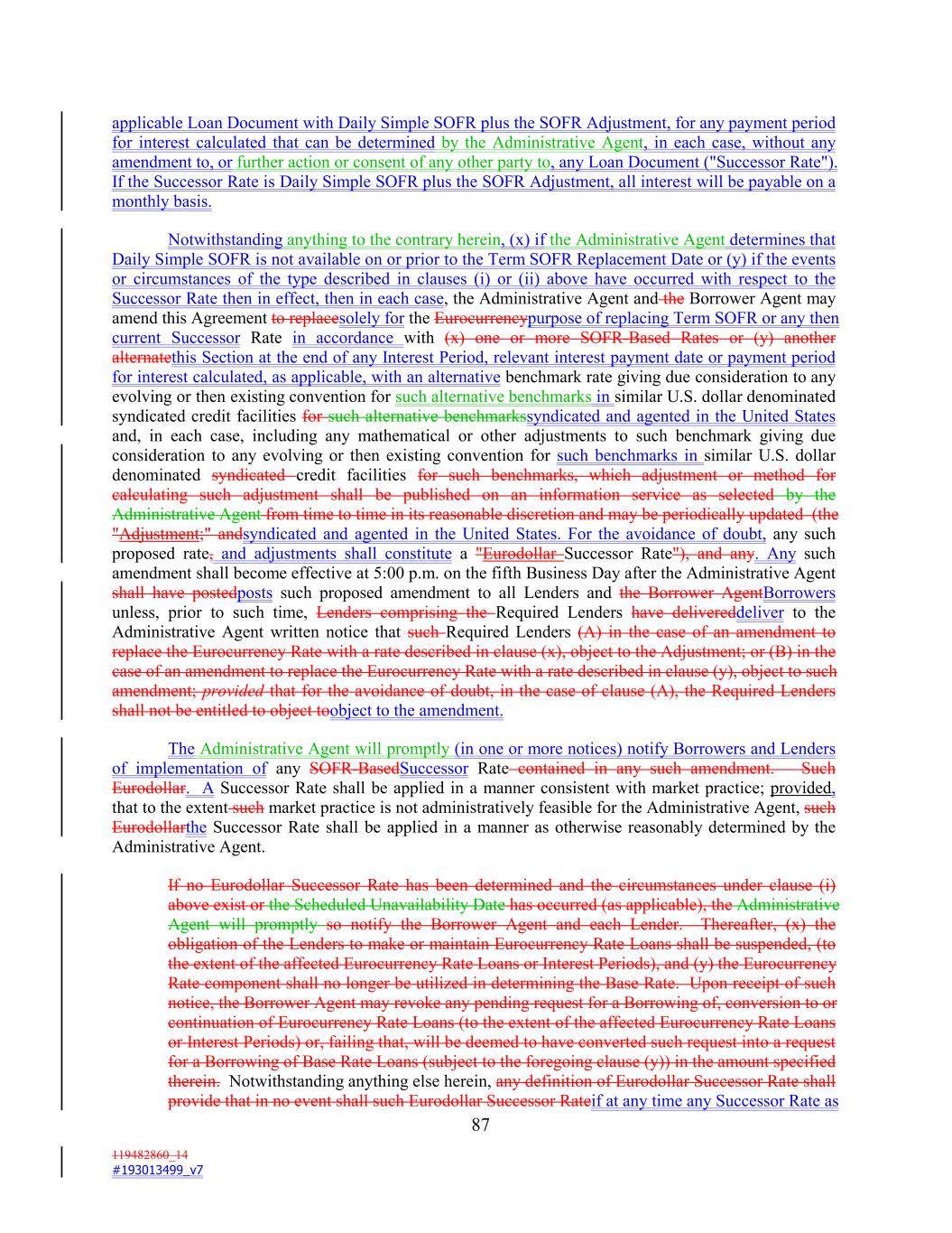 applicable Loan Document with Daily Simple SOFR plus the SOFR Adjustment, for any payment period for interest calculated that can be determined by the Administrative Agent, in each case, without any amendment to, or further action or consent of any other party to, any Loan Document ("Successor Rate"). If the Successor Rate is Daily Simple SOFR plus the SOFR Adjustment, all interest will be payable on a monthly basis. Notwithstanding anything to the contrary herein, (x) if the Administrative Agent determines that Daily Simple SOFR is not available on or prior to the Term SOFR Replacement Date or (y) if the events or circumstances of the type described in clauses (i) or (ii) above have occurred with respect to the Successor Rate then in effect, then in each case, the Administrative Agent and the Borrower Agent may amend this Agreement to replacesolely for the Eurocurrencypurpose of replacing Term SOFR or any then current Successor Rate in accordance with (x) one or more SOFR-Based Rates or (y) another alternatethis Section at the end of any Interest Period, relevant interest payment date or payment period for interest calculated, as applicable, with an alternative benchmark rate giving due consideration to any evolving or then existing convention for such alternative benchmarks in similar U.S. dollar denominated syndicated credit facilities for such alternative benchmarkssyndicated and agented in the United States and, in each case, including any mathematical or other adjustments to such benchmark giving due consideration to any evolving or then existing convention for such benchmarks in similar U.S. dollar denominated syndicated credit facilities for such benchmarks, which adjustment or method for calculating such adjustment shall be published on an information service as selected by the Administrative Agent from time to time in its reasonable discretion and may be periodically updated (the "Adjustment;" andsyndicated and agented in the United States. For the avoidance of doubt, any such proposed rate, and adjustments shall constitute a "Eurodollar Successor Rate"), and any. Any such amendment shall become effective at 5:00 p.m. on the fifth Business Day after the Administrative Agent shall have postedposts such proposed amendment to all Lenders and the Borrower AgentBorrowers unless, prior to such time, Lenders comprising the Required Lenders have delivereddeliver to the Administrative Agent written notice that such Required Lenders (A) in the case of an amendment to replace the Eurocurrency Rate with a rate described in clause (x), object to the Adjustment; or (B) in the case of an amendment to replace the Eurocurrency Rate with a rate described in clause (y), object to such amendment; provided that for the avoidance of doubt, in the case of clause (A), the Required Lenders shall not be entitled to object toobject to the amendment. The Administrative Agent will promptly (in one or more notices) notify Borrowers and Lenders of implementation of any SOFR-BasedSuccessor Rate contained in any such amendment. Such Eurodollar. A Successor Rate shall be applied in a manner consistent with market practice; provided, that to the extent such market practice is not administratively feasible for the Administrative Agent, such Eurodollarthe Successor Rate shall be applied in a manner as otherwise reasonably determined by the Administrative Agent. If no Eurodollar Successor Rate has been determined and the circumstances under clause (i) above exist or the Scheduled Unavailability Date has occurred (as applicable), the Administrative Agent will promptly so notify the Borrower Agent and each Lender. Thereafter, (x) the obligation of the Lenders to make or maintain Eurocurrency Rate Loans shall be suspended, (to the extent of the affected Eurocurrency Rate Loans or Interest Periods), and (y) the Eurocurrency Rate component shall no longer be utilized in determining the Base Rate. Upon receipt of such notice, the Borrower Agent may revoke any pending request for a Borrowing of, conversion to or continuation of Eurocurrency Rate Loans (to the extent of the affected Eurocurrency Rate Loans or Interest Periods) or, failing that, will be deemed to have converted such request into a request for a Borrowing of Base Rate Loans (subject to the foregoing clause (y)) in the amount specified therein. Notwithstanding anything else herein, any definition of Eurodollar Successor Rate shall provide that in no event shall such Eurodollar Successor Rateif at any time any Successor Rate as 87 119482860_14 #193013499_v7