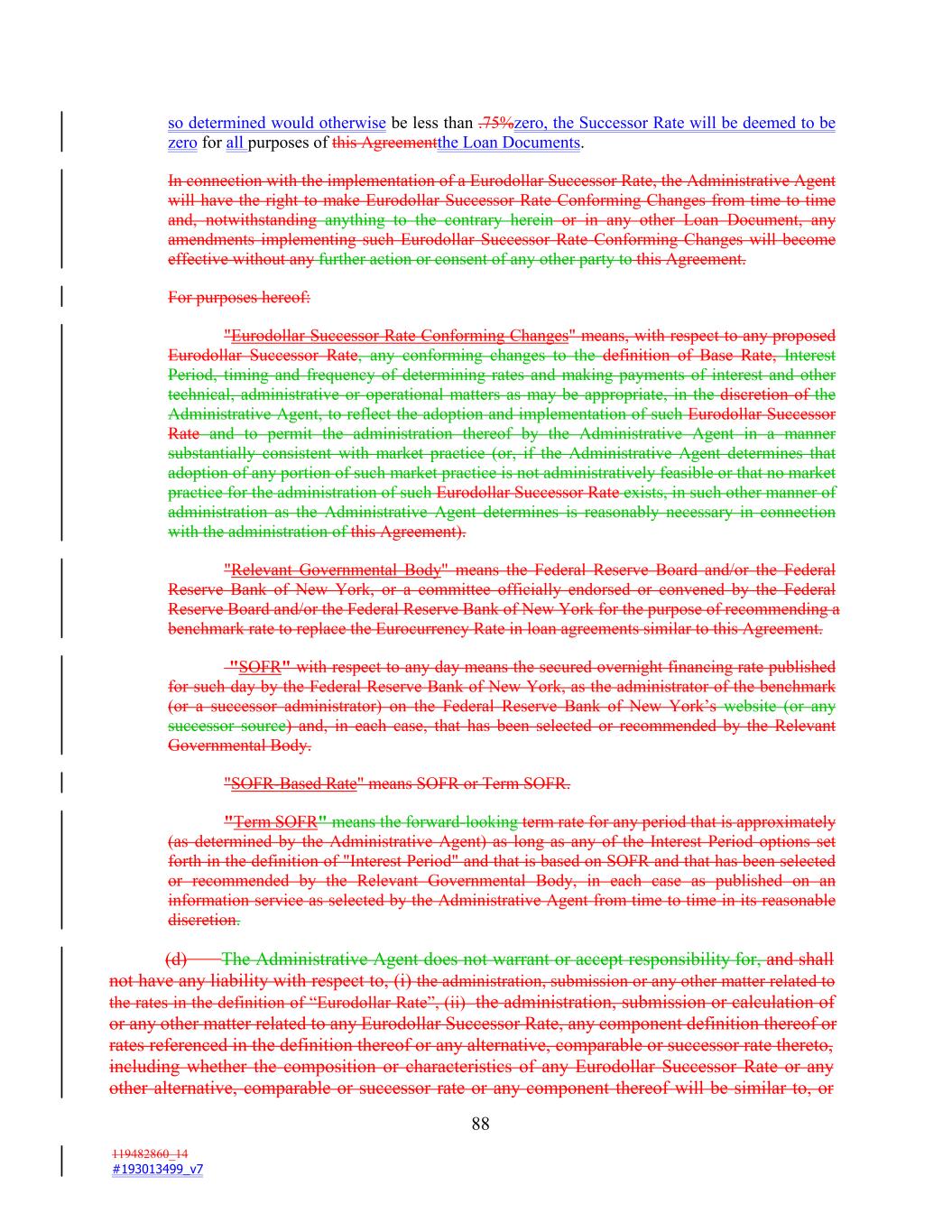 so determined would otherwise be less than .75%zero, the Successor Rate will be deemed to be zero for all purposes of this Agreementthe Loan Documents. In connection with the implementation of a Eurodollar Successor Rate, the Administrative Agent will have the right to make Eurodollar Successor Rate Conforming Changes from time to time and, notwithstanding anything to the contrary herein or in any other Loan Document, any amendments implementing such Eurodollar Successor Rate Conforming Changes will become effective without any further action or consent of any other party to this Agreement. For purposes hereof: "Eurodollar Successor Rate Conforming Changes" means, with respect to any proposed Eurodollar Successor Rate, any conforming changes to the definition of Base Rate, Interest Period, timing and frequency of determining rates and making payments of interest and other technical, administrative or operational matters as may be appropriate, in the discretion of the Administrative Agent, to reflect the adoption and implementation of such Eurodollar Successor Rate and to permit the administration thereof by the Administrative Agent in a manner substantially consistent with market practice (or, if the Administrative Agent determines that adoption of any portion of such market practice is not administratively feasible or that no market practice for the administration of such Eurodollar Successor Rate exists, in such other manner of administration as the Administrative Agent determines is reasonably necessary in connection with the administration of this Agreement). "Relevant Governmental Body" means the Federal Reserve Board and/or the Federal Reserve Bank of New York, or a committee officially endorsed or convened by the Federal Reserve Board and/or the Federal Reserve Bank of New York for the purpose of recommending a benchmark rate to replace the Eurocurrency Rate in loan agreements similar to this Agreement. "SOFR" with respect to any day means the secured overnight financing rate published for such day by the Federal Reserve Bank of New York, as the administrator of the benchmark (or a successor administrator) on the Federal Reserve Bank of New York’s website (or any successor source) and, in each case, that has been selected or recommended by the Relevant Governmental Body. "SOFR-Based Rate" means SOFR or Term SOFR. "Term SOFR" means the forward-looking term rate for any period that is approximately (as determined by the Administrative Agent) as long as any of the Interest Period options set forth in the definition of "Interest Period" and that is based on SOFR and that has been selected or recommended by the Relevant Governmental Body, in each case as published on an information service as selected by the Administrative Agent from time to time in its reasonable discretion. (d) The Administrative Agent does not warrant or accept responsibility for, and shall not have any liability with respect to, (i) the administration, submission or any other matter related to the rates in the definition of “Eurodollar Rate”, (ii) the administration, submission or calculation of or any other matter related to any Eurodollar Successor Rate, any component definition thereof or rates referenced in the definition thereof or any alternative, comparable or successor rate thereto, including whether the composition or characteristics of any Eurodollar Successor Rate or any other alternative, comparable or successor rate or any component thereof will be similar to, or 88 119482860_14 #193013499_v7