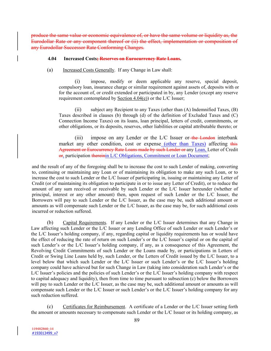 produce the same value or economic equivalence of, or have the same volume or liquidity as, the Eurodollar Rate or any component thereof or (ii) the effect, implementation or composition of any Eurodollar Successor Rate Conforming Changes. 4.04 Increased Costs; Reserves on Eurocurrency Rate Loans. (a) Increased Costs Generally. If any Change in Law shall: (i) impose, modify or deem applicable any reserve, special deposit, compulsory loan, insurance charge or similar requirement against assets of, deposits with or for the account of, or credit extended or participated in by, any Lender (except any reserve requirement contemplated by Section 4.04(e)) or the L/C Issuer; (ii) subject any Recipient to any Taxes (other than (A) Indemnified Taxes, (B) Taxes described in clauses (b) through (d) of the definition of Excluded Taxes and (C) Connection Income Taxes) on its loans, loan principal, letters of credit, commitments, or other obligations, or its deposits, reserves, other liabilities or capital attributable thereto; or (iii) impose on any Lender or the L/C Issuer or the London interbank market any other condition, cost or expense (other than Taxes) affecting this Agreement or Eurocurrency Rate Loans made by such Lender or any Loan, Letter of Credit or, participation thereinin L/C Obligations, Commitment or Loan Document; and the result of any of the foregoing shall be to increase the cost to such Lender of making, converting to, continuing or maintaining any Loan or of maintaining its obligation to make any such Loan, or to increase the cost to such Lender or the L/C Issuer of participating in, issuing or maintaining any Letter of Credit (or of maintaining its obligation to participate in or to issue any Letter of Credit), or to reduce the amount of any sum received or receivable by such Lender or the L/C Issuer hereunder (whether of principal, interest or any other amount) then, upon request of such Lender or the L/C Issuer, the Borrowers will pay to such Lender or the L/C Issuer, as the case may be, such additional amount or amounts as will compensate such Lender or the L/C Issuer, as the case may be, for such additional costs incurred or reduction suffered. (b) Capital Requirements. If any Lender or the L/C Issuer determines that any Change in Law affecting such Lender or the L/C Issuer or any Lending Office of such Lender or such Lender’s or the L/C Issuer’s holding company, if any, regarding capital or liquidity requirements has or would have the effect of reducing the rate of return on such Lender’s or the L/C Issuer’s capital or on the capital of such Lender’s or the L/C Issuer’s holding company, if any, as a consequence of this Agreement, the Revolving Credit Commitments of such Lender or the Loans made by, or participations in Letters of Credit or Swing Line Loans held by, such Lender, or the Letters of Credit issued by the L/C Issuer, to a level below that which such Lender or the L/C Issuer or such Lender’s or the L/C Issuer’s holding company could have achieved but for such Change in Law (taking into consideration such Lender’s or the L/C Issuer’s policies and the policies of such Lender’s or the L/C Issuer’s holding company with respect to capital adequacy and liquidity), then from time to time pursuant to subsection (c) below the Borrowers will pay to such Lender or the L/C Issuer, as the case may be, such additional amount or amounts as will compensate such Lender or the L/C Issuer or such Lender’s or the L/C Issuer’s holding company for any such reduction suffered. (c) Certificates for Reimbursement. A certificate of a Lender or the L/C Issuer setting forth the amount or amounts necessary to compensate such Lender or the L/C Issuer or its holding company, as 89 119482860_14 #193013499_v7