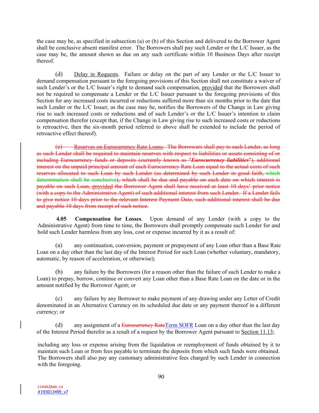 the case may be, as specified in subsection (a) or (b) of this Section and delivered to the Borrower Agent shall be conclusive absent manifest error. The Borrowers shall pay such Lender or the L/C Issuer, as the case may be, the amount shown as due on any such certificate within 10 Business Days after receipt thereof. (d) Delay in Requests. Failure or delay on the part of any Lender or the L/C Issuer to demand compensation pursuant to the foregoing provisions of this Section shall not constitute a waiver of such Lender’s or the L/C Issuer’s right to demand such compensation, provided that the Borrowers shall not be required to compensate a Lender or the L/C Issuer pursuant to the foregoing provisions of this Section for any increased costs incurred or reductions suffered more than six months prior to the date that such Lender or the L/C Issuer, as the case may be, notifies the Borrowers of the Change in Law giving rise to such increased costs or reductions and of such Lender’s or the L/C Issuer’s intention to claim compensation therefor (except that, if the Change in Law giving rise to such increased costs or reductions is retroactive, then the six-month period referred to above shall be extended to include the period of retroactive effect thereof). (e) Reserves on Eurocurrency Rate Loans. The Borrowers shall pay to each Lender, as long as such Lender shall be required to maintain reserves with respect to liabilities or assets consisting of or including Eurocurrency funds or deposits (currently known as "Eurocurrency liabilities"), additional interest on the unpaid principal amount of each Eurocurrency Rate Loan equal to the actual costs of such reserves allocated to such Loan by such Lender (as determined by such Lender in good faith, which determination shall be conclusive), which shall be due and payable on each date on which interest is payable on such Loan, provided the Borrower Agent shall have received at least 10 days’ prior notice (with a copy to the Administrative Agent) of such additional interest from such Lender. If a Lender fails to give notice 10 days prior to the relevant Interest Payment Date, such additional interest shall be due and payable 10 days from receipt of such notice. 4.05 Compensation for Losses. Upon demand of any Lender (with a copy to the Administrative Agent) from time to time, the Borrowers shall promptly compensate such Lender for and hold such Lender harmless from any loss, cost or expense incurred by it as a result of: (a) any continuation, conversion, payment or prepayment of any Loan other than a Base Rate Loan on a day other than the last day of the Interest Period for such Loan (whether voluntary, mandatory, automatic, by reason of acceleration, or otherwise); (b) any failure by the Borrowers (for a reason other than the failure of such Lender to make a Loan) to prepay, borrow, continue or convert any Loan other than a Base Rate Loan on the date or in the amount notified by the Borrower Agent; or (c) any failure by any Borrower to make payment of any drawing under any Letter of Credit denominated in an Alternative Currency on its scheduled due date or any payment thereof in a different currency; or (d) any assignment of a Eurocurrency RateTerm SOFR Loan on a day other than the last day of the Interest Period therefor as a result of a request by the Borrower Agent pursuant to Section 11.13; including any loss or expense arising from the liquidation or reemployment of funds obtained by it to maintain such Loan or from fees payable to terminate the deposits from which such funds were obtained. The Borrowers shall also pay any customary administrative fees charged by such Lender in connection with the foregoing. 90 119482860_14 #193013499_v7