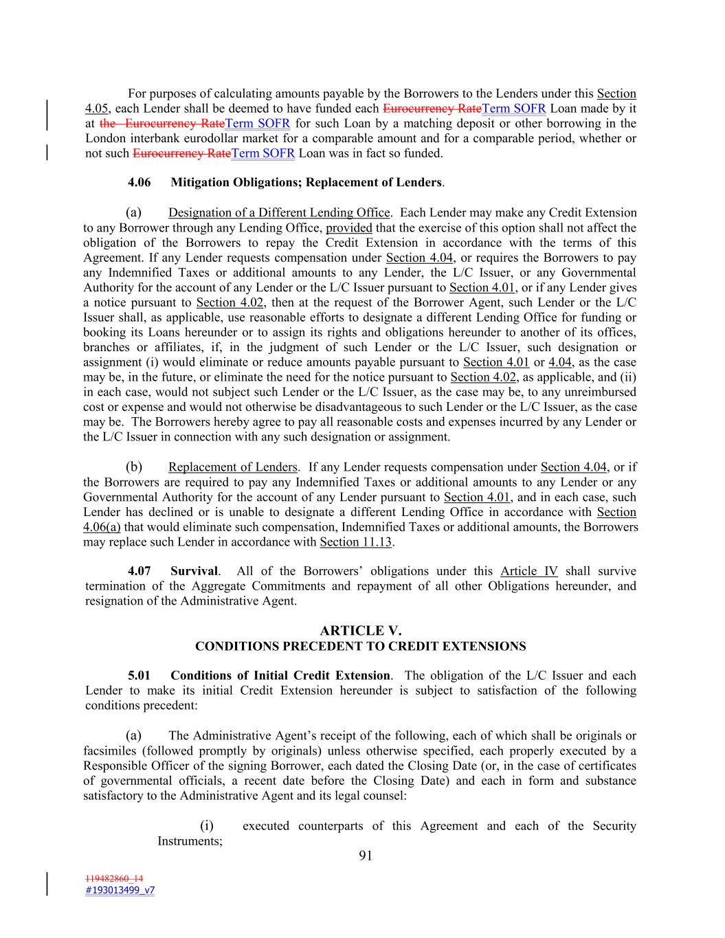 For purposes of calculating amounts payable by the Borrowers to the Lenders under this Section 4.05, each Lender shall be deemed to have funded each Eurocurrency RateTerm SOFR Loan made by it at the Eurocurrency RateTerm SOFR for such Loan by a matching deposit or other borrowing in the London interbank eurodollar market for a comparable amount and for a comparable period, whether or not such Eurocurrency RateTerm SOFR Loan was in fact so funded. 4.06 Mitigation Obligations; Replacement of Lenders. (a) Designation of a Different Lending Office. Each Lender may make any Credit Extension to any Borrower through any Lending Office, provided that the exercise of this option shall not affect the obligation of the Borrowers to repay the Credit Extension in accordance with the terms of this Agreement. If any Lender requests compensation under Section 4.04, or requires the Borrowers to pay any Indemnified Taxes or additional amounts to any Lender, the L/C Issuer, or any Governmental Authority for the account of any Lender or the L/C Issuer pursuant to Section 4.01, or if any Lender gives a notice pursuant to Section 4.02, then at the request of the Borrower Agent, such Lender or the L/C Issuer shall, as applicable, use reasonable efforts to designate a different Lending Office for funding or booking its Loans hereunder or to assign its rights and obligations hereunder to another of its offices, branches or affiliates, if, in the judgment of such Lender or the L/C Issuer, such designation or assignment (i) would eliminate or reduce amounts payable pursuant to Section 4.01 or 4.04, as the case may be, in the future, or eliminate the need for the notice pursuant to Section 4.02, as applicable, and (ii) in each case, would not subject such Lender or the L/C Issuer, as the case may be, to any unreimbursed cost or expense and would not otherwise be disadvantageous to such Lender or the L/C Issuer, as the case may be. The Borrowers hereby agree to pay all reasonable costs and expenses incurred by any Lender or the L/C Issuer in connection with any such designation or assignment. (b) Replacement of Lenders. If any Lender requests compensation under Section 4.04, or if the Borrowers are required to pay any Indemnified Taxes or additional amounts to any Lender or any Governmental Authority for the account of any Lender pursuant to Section 4.01, and in each case, such Lender has declined or is unable to designate a different Lending Office in accordance with Section 4.06(a) that would eliminate such compensation, Indemnified Taxes or additional amounts, the Borrowers may replace such Lender in accordance with Section 11.13. 4.07 Survival. All of the Borrowers’ obligations under this Article IV shall survive termination of the Aggregate Commitments and repayment of all other Obligations hereunder, and resignation of the Administrative Agent. ARTICLE V. CONDITIONS PRECEDENT TO CREDIT EXTENSIONS 5.01 Conditions of Initial Credit Extension. The obligation of the L/C Issuer and each Lender to make its initial Credit Extension hereunder is subject to satisfaction of the following conditions precedent: (a) The Administrative Agent’s receipt of the following, each of which shall be originals or facsimiles (followed promptly by originals) unless otherwise specified, each properly executed by a Responsible Officer of the signing Borrower, each dated the Closing Date (or, in the case of certificates of governmental officials, a recent date before the Closing Date) and each in form and substance satisfactory to the Administrative Agent and its legal counsel: (i) executed counterparts of this Agreement and each of the Security Instruments; 91 119482860_14 #193013499_v7
