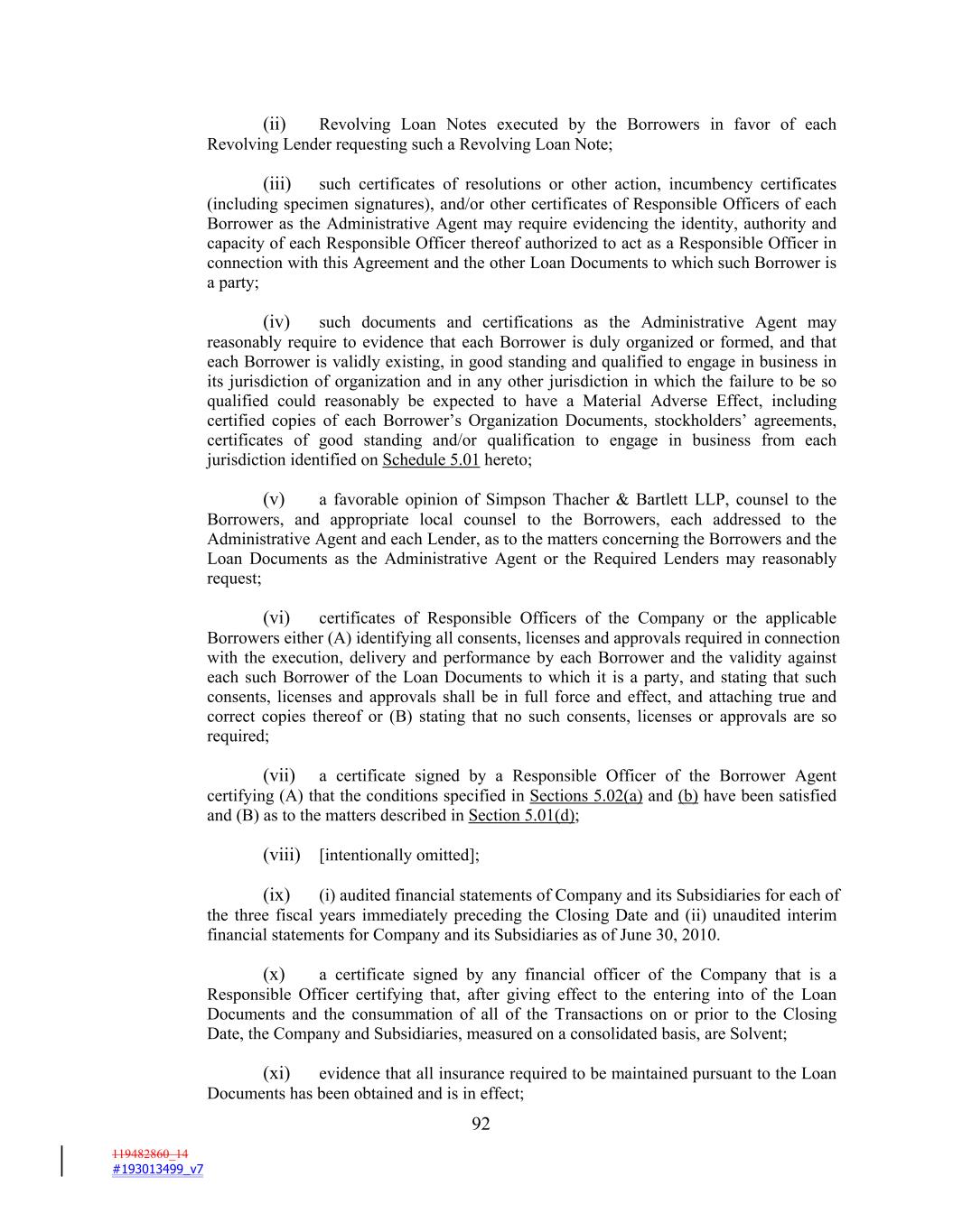 (ii) Revolving Loan Notes executed by the Borrowers in favor of each Revolving Lender requesting such a Revolving Loan Note; (iii) such certificates of resolutions or other action, incumbency certificates (including specimen signatures), and/or other certificates of Responsible Officers of each Borrower as the Administrative Agent may require evidencing the identity, authority and capacity of each Responsible Officer thereof authorized to act as a Responsible Officer in connection with this Agreement and the other Loan Documents to which such Borrower is a party; (iv) such documents and certifications as the Administrative Agent may reasonably require to evidence that each Borrower is duly organized or formed, and that each Borrower is validly existing, in good standing and qualified to engage in business in its jurisdiction of organization and in any other jurisdiction in which the failure to be so qualified could reasonably be expected to have a Material Adverse Effect, including certified copies of each Borrower’s Organization Documents, stockholders’ agreements, certificates of good standing and/or qualification to engage in business from each jurisdiction identified on Schedule 5.01 hereto; (v) a favorable opinion of Simpson Thacher & Bartlett LLP, counsel to the Borrowers, and appropriate local counsel to the Borrowers, each addressed to the Administrative Agent and each Lender, as to the matters concerning the Borrowers and the Loan Documents as the Administrative Agent or the Required Lenders may reasonably request; (vi) certificates of Responsible Officers of the Company or the applicable Borrowers either (A) identifying all consents, licenses and approvals required in connection with the execution, delivery and performance by each Borrower and the validity against each such Borrower of the Loan Documents to which it is a party, and stating that such consents, licenses and approvals shall be in full force and effect, and attaching true and correct copies thereof or (B) stating that no such consents, licenses or approvals are so required; (vii) a certificate signed by a Responsible Officer of the Borrower Agent certifying (A) that the conditions specified in Sections 5.02(a) and (b) have been satisfied and (B) as to the matters described in Section 5.01(d); (viii) [intentionally omitted]; (ix) (i) audited financial statements of Company and its Subsidiaries for each of the three fiscal years immediately preceding the Closing Date and (ii) unaudited interim financial statements for Company and its Subsidiaries as of June 30, 2010. (x) a certificate signed by any financial officer of the Company that is a Responsible Officer certifying that, after giving effect to the entering into of the Loan Documents and the consummation of all of the Transactions on or prior to the Closing Date, the Company and Subsidiaries, measured on a consolidated basis, are Solvent; (xi) evidence that all insurance required to be maintained pursuant to the Loan Documents has been obtained and is in effect; 92 119482860_14 #193013499_v7