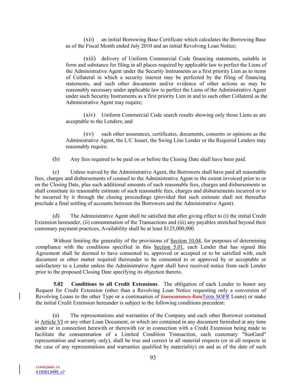 (xii) an initial Borrowing Base Certificate which calculates the Borrowing Base as of the Fiscal Month ended July 2010 and an initial Revolving Loan Notice; (xiii) delivery of Uniform Commercial Code financing statements, suitable in form and substance for filing in all places required by applicable law to perfect the Liens of the Administrative Agent under the Security Instruments as a first priority Lien as to items of Collateral in which a security interest may be perfected by the filing of financing statements, and such other documents and/or evidence of other actions as may be reasonably necessary under applicable law to perfect the Liens of the Administrative Agent under such Security Instruments as a first priority Lien in and to such other Collateral as the Administrative Agent may require; (xiv) Uniform Commercial Code search results showing only those Liens as are acceptable to the Lenders; and (xv) such other assurances, certificates, documents, consents or opinions as the Administrative Agent, the L/C Issuer, the Swing Line Lender or the Required Lenders may reasonably require. (b) Any fees required to be paid on or before the Closing Date shall have been paid. (c) Unless waived by the Administrative Agent, the Borrowers shall have paid all reasonable fees, charges and disbursements of counsel to the Administrative Agent to the extent invoiced prior to or on the Closing Date, plus such additional amounts of such reasonable fees, charges and disbursements as shall constitute its reasonable estimate of such reasonable fees, charges and disbursements incurred or to be incurred by it through the closing proceedings (provided that such estimate shall not thereafter preclude a final settling of accounts between the Borrowers and the Administrative Agent). (d) The Administrative Agent shall be satisfied that after giving effect to (i) the initial Credit Extension hereunder, (ii) consummation of the Transactions and (iii) any payables stretched beyond their customary payment practices, Availability shall be at least $125,000,000. Without limiting the generality of the provisions of Section 10.04, for purposes of determining compliance with the conditions specified in this Section 5.01, each Lender that has signed this Agreement shall be deemed to have consented to, approved or accepted or to be satisfied with, each document or other matter required thereunder to be consented to or approved by or acceptable or satisfactory to a Lender unless the Administrative Agent shall have received notice from such Lender prior to the proposed Closing Date specifying its objection thereto. 5.02 Conditions to all Credit Extensions. The obligation of each Lender to honor any Request for Credit Extension (other than a Revolving Loan Notice requesting only a conversion of Revolving Loans to the other Type or a continuation of Eurocurrency RateTerm SOFR Loans) or make the initial Credit Extension hereunder is subject to the following conditions precedent: (a) The representations and warranties of the Company and each other Borrower contained in Article VI or any other Loan Document, or which are contained in any document furnished at any time under or in connection herewith or therewith (or in connection with a Credit Extension being made to facilitate the consummation of a Limited Condition Transaction, each customary "SunGard" representation and warranty only), shall be true and correct in all material respects (or in all respects in the case of any representations and warranties qualified by materiality) on and as of the date of such 93 119482860_14 #193013499_v7