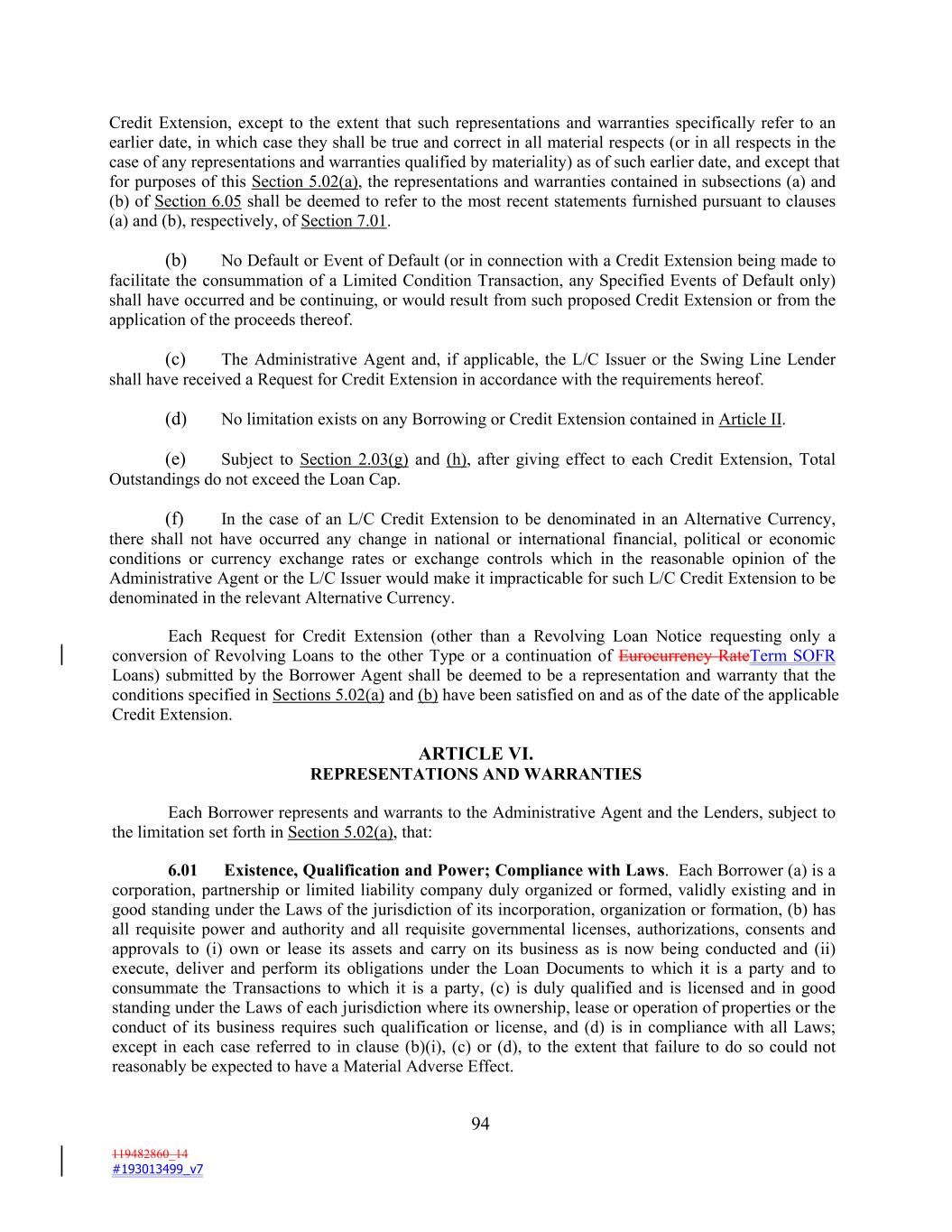 Credit Extension, except to the extent that such representations and warranties specifically refer to an earlier date, in which case they shall be true and correct in all material respects (or in all respects in the case of any representations and warranties qualified by materiality) as of such earlier date, and except that for purposes of this Section 5.02(a), the representations and warranties contained in subsections (a) and (b) of Section 6.05 shall be deemed to refer to the most recent statements furnished pursuant to clauses (a) and (b), respectively, of Section 7.01. (b) No Default or Event of Default (or in connection with a Credit Extension being made to facilitate the consummation of a Limited Condition Transaction, any Specified Events of Default only) shall have occurred and be continuing, or would result from such proposed Credit Extension or from the application of the proceeds thereof. (c) The Administrative Agent and, if applicable, the L/C Issuer or the Swing Line Lender shall have received a Request for Credit Extension in accordance with the requirements hereof. (d) No limitation exists on any Borrowing or Credit Extension contained in Article II. (e) Subject to Section 2.03(g) and (h), after giving effect to each Credit Extension, Total Outstandings do not exceed the Loan Cap. (f) In the case of an L/C Credit Extension to be denominated in an Alternative Currency, there shall not have occurred any change in national or international financial, political or economic conditions or currency exchange rates or exchange controls which in the reasonable opinion of the Administrative Agent or the L/C Issuer would make it impracticable for such L/C Credit Extension to be denominated in the relevant Alternative Currency. Each Request for Credit Extension (other than a Revolving Loan Notice requesting only a conversion of Revolving Loans to the other Type or a continuation of Eurocurrency RateTerm SOFR Loans) submitted by the Borrower Agent shall be deemed to be a representation and warranty that the conditions specified in Sections 5.02(a) and (b) have been satisfied on and as of the date of the applicable Credit Extension. ARTICLE VI. REPRESENTATIONS AND WARRANTIES Each Borrower represents and warrants to the Administrative Agent and the Lenders, subject to the limitation set forth in Section 5.02(a), that: 6.01 Existence, Qualification and Power; Compliance with Laws. Each Borrower (a) is a corporation, partnership or limited liability company duly organized or formed, validly existing and in good standing under the Laws of the jurisdiction of its incorporation, organization or formation, (b) has all requisite power and authority and all requisite governmental licenses, authorizations, consents and approvals to (i) own or lease its assets and carry on its business as is now being conducted and (ii) execute, deliver and perform its obligations under the Loan Documents to which it is a party and to consummate the Transactions to which it is a party, (c) is duly qualified and is licensed and in good standing under the Laws of each jurisdiction where its ownership, lease or operation of properties or the conduct of its business requires such qualification or license, and (d) is in compliance with all Laws; except in each case referred to in clause (b)(i), (c) or (d), to the extent that failure to do so could not reasonably be expected to have a Material Adverse Effect. 94 119482860_14 #193013499_v7