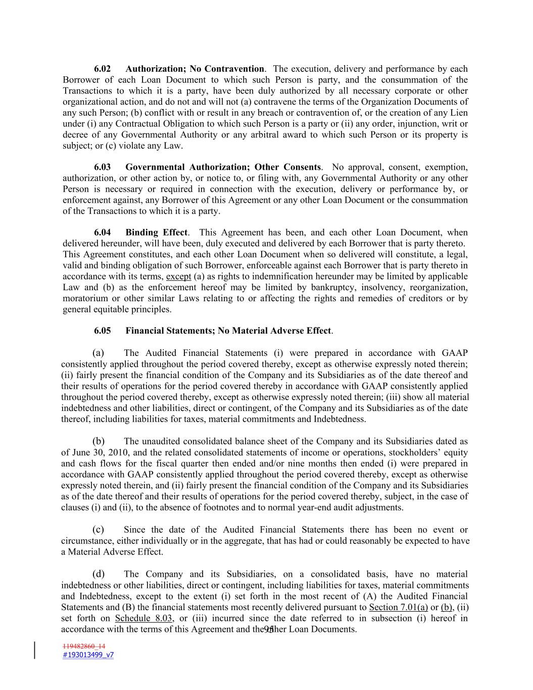 6.02 Authorization; No Contravention. The execution, delivery and performance by each Borrower of each Loan Document to which such Person is party, and the consummation of the Transactions to which it is a party, have been duly authorized by all necessary corporate or other organizational action, and do not and will not (a) contravene the terms of the Organization Documents of any such Person; (b) conflict with or result in any breach or contravention of, or the creation of any Lien under (i) any Contractual Obligation to which such Person is a party or (ii) any order, injunction, writ or decree of any Governmental Authority or any arbitral award to which such Person or its property is subject; or (c) violate any Law. 6.03 Governmental Authorization; Other Consents. No approval, consent, exemption, authorization, or other action by, or notice to, or filing with, any Governmental Authority or any other Person is necessary or required in connection with the execution, delivery or performance by, or enforcement against, any Borrower of this Agreement or any other Loan Document or the consummation of the Transactions to which it is a party. 6.04 Binding Effect. This Agreement has been, and each other Loan Document, when delivered hereunder, will have been, duly executed and delivered by each Borrower that is party thereto. This Agreement constitutes, and each other Loan Document when so delivered will constitute, a legal, valid and binding obligation of such Borrower, enforceable against each Borrower that is party thereto in accordance with its terms, except (a) as rights to indemnification hereunder may be limited by applicable Law and (b) as the enforcement hereof may be limited by bankruptcy, insolvency, reorganization, moratorium or other similar Laws relating to or affecting the rights and remedies of creditors or by general equitable principles. 6.05 Financial Statements; No Material Adverse Effect. (a) The Audited Financial Statements (i) were prepared in accordance with GAAP consistently applied throughout the period covered thereby, except as otherwise expressly noted therein; (ii) fairly present the financial condition of the Company and its Subsidiaries as of the date thereof and their results of operations for the period covered thereby in accordance with GAAP consistently applied throughout the period covered thereby, except as otherwise expressly noted therein; (iii) show all material indebtedness and other liabilities, direct or contingent, of the Company and its Subsidiaries as of the date thereof, including liabilities for taxes, material commitments and Indebtedness. (b) The unaudited consolidated balance sheet of the Company and its Subsidiaries dated as of June 30, 2010, and the related consolidated statements of income or operations, stockholders’ equity and cash flows for the fiscal quarter then ended and/or nine months then ended (i) were prepared in accordance with GAAP consistently applied throughout the period covered thereby, except as otherwise expressly noted therein, and (ii) fairly present the financial condition of the Company and its Subsidiaries as of the date thereof and their results of operations for the period covered thereby, subject, in the case of clauses (i) and (ii), to the absence of footnotes and to normal year-end audit adjustments. (c) Since the date of the Audited Financial Statements there has been no event or circumstance, either individually or in the aggregate, that has had or could reasonably be expected to have a Material Adverse Effect. (d) The Company and its Subsidiaries, on a consolidated basis, have no material indebtedness or other liabilities, direct or contingent, including liabilities for taxes, material commitments and Indebtedness, except to the extent (i) set forth in the most recent of (A) the Audited Financial Statements and (B) the financial statements most recently delivered pursuant to Section 7.01(a) or (b), (ii) set forth on Schedule 8.03, or (iii) incurred since the date referred to in subsection (i) hereof in accordance with the terms of this Agreement and the other Loan Documents.95 119482860_14 #193013499_v7