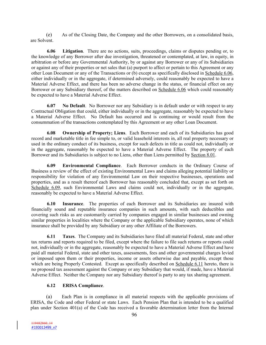 (e) As of the Closing Date, the Company and the other Borrowers, on a consolidated basis, are Solvent. 6.06 Litigation. There are no actions, suits, proceedings, claims or disputes pending or, to the knowledge of any Borrower after due investigation, threatened or contemplated, at law, in equity, in arbitration or before any Governmental Authority, by or against any Borrower or any of its Subsidiaries or against any of their properties or net sales that (a) purport to affect or pertain to this Agreement or any other Loan Document or any of the Transactions or (b) except as specifically disclosed in Schedule 6.06, either individually or in the aggregate, if determined adversely, could reasonably be expected to have a Material Adverse Effect, and there has been no adverse change in the status, or financial effect on any Borrower or any Subsidiary thereof, of the matters described on Schedule 6.06 which could reasonably be expected to have a Material Adverse Effect. 6.07 No Default. No Borrower nor any Subsidiary is in default under or with respect to any Contractual Obligation that could, either individually or in the aggregate, reasonably be expected to have a Material Adverse Effect. No Default has occurred and is continuing or would result from the consummation of the transactions contemplated by this Agreement or any other Loan Document. 6.08 Ownership of Property; Liens. Each Borrower and each of its Subsidiaries has good record and marketable title in fee simple to, or valid leasehold interests in, all real property necessary or used in the ordinary conduct of its business, except for such defects in title as could not, individually or in the aggregate, reasonably be expected to have a Material Adverse Effect. The property of each Borrower and its Subsidiaries is subject to no Liens, other than Liens permitted by Section 8.01. 6.09 Environmental Compliance. Each Borrower conducts in the Ordinary Course of Business a review of the effect of existing Environmental Laws and claims alleging potential liability or responsibility for violation of any Environmental Law on their respective businesses, operations and properties, and as a result thereof each Borrower has reasonably concluded that, except as set forth on Schedule 6.09, such Environmental Laws and claims could not, individually or in the aggregate, reasonably be expected to have a Material Adverse Effect. 6.10 Insurance. The properties of each Borrower and its Subsidiaries are insured with financially sound and reputable insurance companies in such amounts, with such deductibles and covering such risks as are customarily carried by companies engaged in similar businesses and owning similar properties in localities where the Company or the applicable Subsidiary operates, none of which insurance shall be provided by any Subsidiary or any other Affiliate of the Borrowers. 6.11 Taxes. The Company and its Subsidiaries have filed all material Federal, state and other tax returns and reports required to be filed, except where the failure to file such returns or reports could not, individually or in the aggregate, reasonably be expected to have a Material Adverse Effect and have paid all material Federal, state and other taxes, assessments, fees and other governmental charges levied or imposed upon them or their properties, income or assets otherwise due and payable, except those which are being Properly Contested. Except as specifically described on Schedule 6.11 hereto, there is no proposed tax assessment against the Company or any Subsidiary that would, if made, have a Material Adverse Effect. Neither the Company nor any Subsidiary thereof is party to any tax sharing agreement. 6.12 ERISA Compliance. (a) Each Plan is in compliance in all material respects with the applicable provisions of ERISA, the Code and other Federal or state Laws. Each Pension Plan that is intended to be a qualified plan under Section 401(a) of the Code has received a favorable determination letter from the Internal 96 119482860_14 #193013499_v7