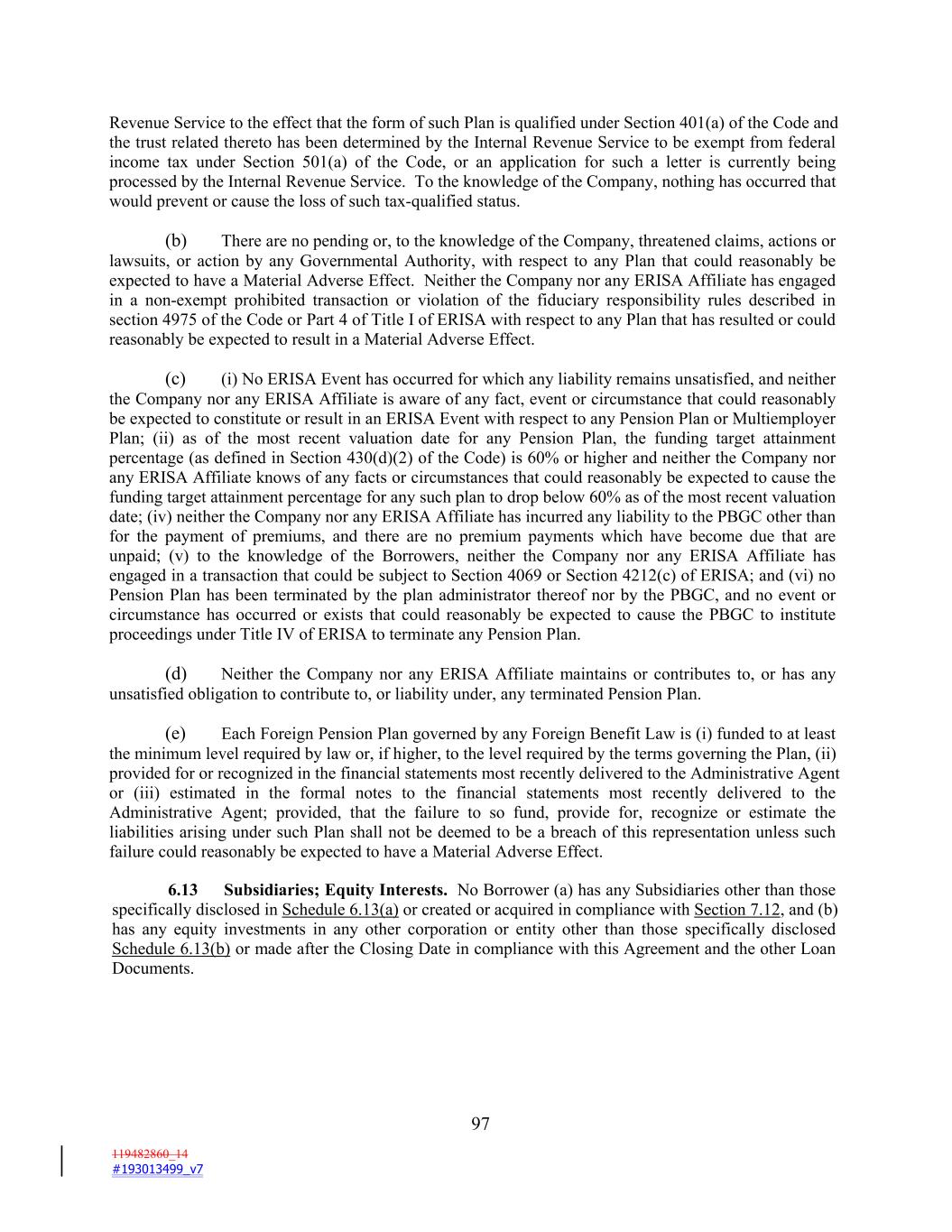 Revenue Service to the effect that the form of such Plan is qualified under Section 401(a) of the Code and the trust related thereto has been determined by the Internal Revenue Service to be exempt from federal income tax under Section 501(a) of the Code, or an application for such a letter is currently being processed by the Internal Revenue Service. To the knowledge of the Company, nothing has occurred that would prevent or cause the loss of such tax-qualified status. (b) There are no pending or, to the knowledge of the Company, threatened claims, actions or lawsuits, or action by any Governmental Authority, with respect to any Plan that could reasonably be expected to have a Material Adverse Effect. Neither the Company nor any ERISA Affiliate has engaged in a non-exempt prohibited transaction or violation of the fiduciary responsibility rules described in section 4975 of the Code or Part 4 of Title I of ERISA with respect to any Plan that has resulted or could reasonably be expected to result in a Material Adverse Effect. (c) (i) No ERISA Event has occurred for which any liability remains unsatisfied, and neither the Company nor any ERISA Affiliate is aware of any fact, event or circumstance that could reasonably be expected to constitute or result in an ERISA Event with respect to any Pension Plan or Multiemployer Plan; (ii) as of the most recent valuation date for any Pension Plan, the funding target attainment percentage (as defined in Section 430(d)(2) of the Code) is 60% or higher and neither the Company nor any ERISA Affiliate knows of any facts or circumstances that could reasonably be expected to cause the funding target attainment percentage for any such plan to drop below 60% as of the most recent valuation date; (iv) neither the Company nor any ERISA Affiliate has incurred any liability to the PBGC other than for the payment of premiums, and there are no premium payments which have become due that are unpaid; (v) to the knowledge of the Borrowers, neither the Company nor any ERISA Affiliate has engaged in a transaction that could be subject to Section 4069 or Section 4212(c) of ERISA; and (vi) no Pension Plan has been terminated by the plan administrator thereof nor by the PBGC, and no event or circumstance has occurred or exists that could reasonably be expected to cause the PBGC to institute proceedings under Title IV of ERISA to terminate any Pension Plan. (d) Neither the Company nor any ERISA Affiliate maintains or contributes to, or has any unsatisfied obligation to contribute to, or liability under, any terminated Pension Plan. (e) Each Foreign Pension Plan governed by any Foreign Benefit Law is (i) funded to at least the minimum level required by law or, if higher, to the level required by the terms governing the Plan, (ii) provided for or recognized in the financial statements most recently delivered to the Administrative Agent or (iii) estimated in the formal notes to the financial statements most recently delivered to the Administrative Agent; provided, that the failure to so fund, provide for, recognize or estimate the liabilities arising under such Plan shall not be deemed to be a breach of this representation unless such failure could reasonably be expected to have a Material Adverse Effect. 6.13 Subsidiaries; Equity Interests. No Borrower (a) has any Subsidiaries other than those specifically disclosed in Schedule 6.13(a) or created or acquired in compliance with Section 7.12, and (b) has any equity investments in any other corporation or entity other than those specifically disclosed Schedule 6.13(b) or made after the Closing Date in compliance with this Agreement and the other Loan Documents. 97 119482860_14 #193013499_v7