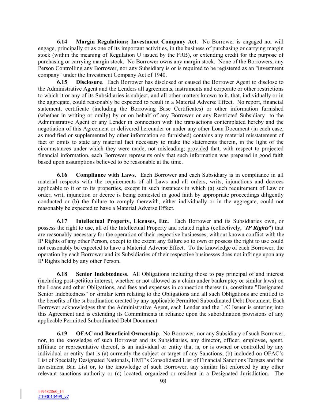 6.14 Margin Regulations; Investment Company Act. No Borrower is engaged nor will engage, principally or as one of its important activities, in the business of purchasing or carrying margin stock (within the meaning of Regulation U issued by the FRB), or extending credit for the purpose of purchasing or carrying margin stock. No Borrower owns any margin stock. None of the Borrowers, any Person Controlling any Borrower, nor any Subsidiary is or is required to be registered as an "investment company" under the Investment Company Act of 1940. 6.15 Disclosure. Each Borrower has disclosed or caused the Borrower Agent to disclose to the Administrative Agent and the Lenders all agreements, instruments and corporate or other restrictions to which it or any of its Subsidiaries is subject, and all other matters known to it, that, individually or in the aggregate, could reasonably be expected to result in a Material Adverse Effect. No report, financial statement, certificate (including the Borrowing Base Certificates) or other information furnished (whether in writing or orally) by or on behalf of any Borrower or any Restricted Subsidiary to the Administrative Agent or any Lender in connection with the transactions contemplated hereby and the negotiation of this Agreement or delivered hereunder or under any other Loan Document (in each case, as modified or supplemented by other information so furnished) contains any material misstatement of fact or omits to state any material fact necessary to make the statements therein, in the light of the circumstances under which they were made, not misleading; provided that, with respect to projected financial information, each Borrower represents only that such information was prepared in good faith based upon assumptions believed to be reasonable at the time. 6.16 Compliance with Laws. Each Borrower and each Subsidiary is in compliance in all material respects with the requirements of all Laws and all orders, writs, injunctions and decrees applicable to it or to its properties, except in such instances in which (a) such requirement of Law or order, writ, injunction or decree is being contested in good faith by appropriate proceedings diligently conducted or (b) the failure to comply therewith, either individually or in the aggregate, could not reasonably be expected to have a Material Adverse Effect. 6.17 Intellectual Property, Licenses, Etc. Each Borrower and its Subsidiaries own, or possess the right to use, all of the Intellectual Property and related rights (collectively, "IP Rights") that are reasonably necessary for the operation of their respective businesses, without known conflict with the IP Rights of any other Person, except to the extent any failure so to own or possess the right to use could not reasonably be expected to have a Material Adverse Effect. To the knowledge of each Borrower, the operation by each Borrower and its Subsidiaries of their respective businesses does not infringe upon any IP Rights held by any other Person. 6.18 Senior Indebtedness. All Obligations including those to pay principal of and interest (including post-petition interest, whether or not allowed as a claim under bankruptcy or similar laws) on the Loans and other Obligations, and fees and expenses in connection therewith, constitute "Designated Senior Indebtedness" or similar term relating to the Obligations and all such Obligations are entitled to the benefits of the subordination created by any applicable Permitted Subordinated Debt Document. Each Borrower acknowledges that the Administrative Agent, each Lender and the L/C Issuer is entering into this Agreement and is extending its Commitments in reliance upon the subordination provisions of any applicable Permitted Subordinated Debt Document. 6.19 OFAC and Beneficial Ownership. No Borrower, nor any Subsidiary of such Borrower, nor, to the knowledge of such Borrower and its Subsidiaries, any director, officer, employee, agent, affiliate or representative thereof, is an individual or entity that is, or is owned or controlled by any individual or entity that is (a) currently the subject or target of any Sanctions, (b) included on OFAC’s List of Specially Designated Nationals, HMT’s Consolidated List of Financial Sanctions Targets and the Investment Ban List or, to the knowledge of such Borrower, any similar list enforced by any other relevant sanctions authority or (c) located, organized or resident in a Designated Jurisdiction. The 98 119482860_14 #193013499_v7