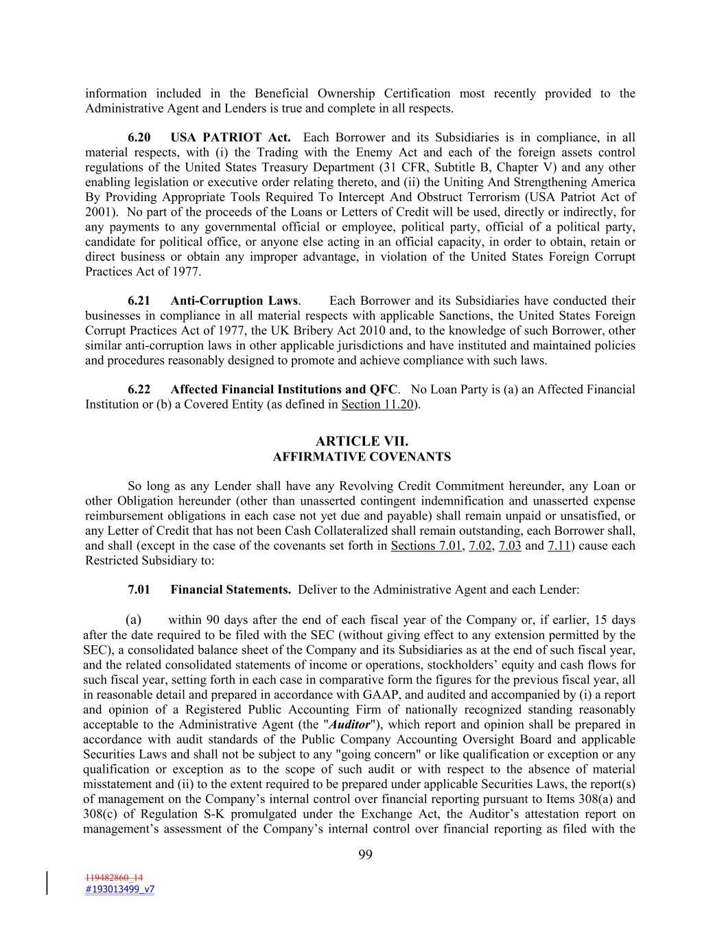 information included in the Beneficial Ownership Certification most recently provided to the Administrative Agent and Lenders is true and complete in all respects. 6.20 USA PATRIOT Act. Each Borrower and its Subsidiaries is in compliance, in all material respects, with (i) the Trading with the Enemy Act and each of the foreign assets control regulations of the United States Treasury Department (31 CFR, Subtitle B, Chapter V) and any other enabling legislation or executive order relating thereto, and (ii) the Uniting And Strengthening America By Providing Appropriate Tools Required To Intercept And Obstruct Terrorism (USA Patriot Act of 2001). No part of the proceeds of the Loans or Letters of Credit will be used, directly or indirectly, for any payments to any governmental official or employee, political party, official of a political party, candidate for political office, or anyone else acting in an official capacity, in order to obtain, retain or direct business or obtain any improper advantage, in violation of the United States Foreign Corrupt Practices Act of 1977. 6.21 Anti-Corruption Laws. Each Borrower and its Subsidiaries have conducted their businesses in compliance in all material respects with applicable Sanctions, the United States Foreign Corrupt Practices Act of 1977, the UK Bribery Act 2010 and, to the knowledge of such Borrower, other similar anti-corruption laws in other applicable jurisdictions and have instituted and maintained policies and procedures reasonably designed to promote and achieve compliance with such laws. 6.22 Affected Financial Institutions and QFC. No Loan Party is (a) an Affected Financial Institution or (b) a Covered Entity (as defined in Section 11.20). ARTICLE VII. AFFIRMATIVE COVENANTS So long as any Lender shall have any Revolving Credit Commitment hereunder, any Loan or other Obligation hereunder (other than unasserted contingent indemnification and unasserted expense reimbursement obligations in each case not yet due and payable) shall remain unpaid or unsatisfied, or any Letter of Credit that has not been Cash Collateralized shall remain outstanding, each Borrower shall, and shall (except in the case of the covenants set forth in Sections 7.01, 7.02, 7.03 and 7.11) cause each Restricted Subsidiary to: 7.01 Financial Statements. Deliver to the Administrative Agent and each Lender: (a) within 90 days after the end of each fiscal year of the Company or, if earlier, 15 days after the date required to be filed with the SEC (without giving effect to any extension permitted by the SEC), a consolidated balance sheet of the Company and its Subsidiaries as at the end of such fiscal year, and the related consolidated statements of income or operations, stockholders’ equity and cash flows for such fiscal year, setting forth in each case in comparative form the figures for the previous fiscal year, all in reasonable detail and prepared in accordance with GAAP, and audited and accompanied by (i) a report and opinion of a Registered Public Accounting Firm of nationally recognized standing reasonably acceptable to the Administrative Agent (the "Auditor"), which report and opinion shall be prepared in accordance with audit standards of the Public Company Accounting Oversight Board and applicable Securities Laws and shall not be subject to any "going concern" or like qualification or exception or any qualification or exception as to the scope of such audit or with respect to the absence of material misstatement and (ii) to the extent required to be prepared under applicable Securities Laws, the report(s) of management on the Company’s internal control over financial reporting pursuant to Items 308(a) and 308(c) of Regulation S-K promulgated under the Exchange Act, the Auditor’s attestation report on management’s assessment of the Company’s internal control over financial reporting as filed with the 99 119482860_14 #193013499_v7