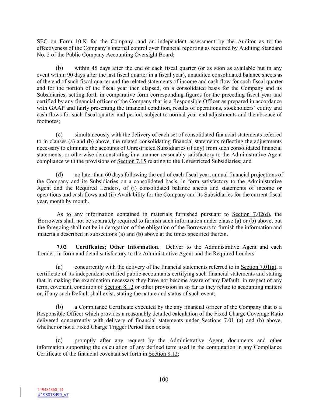 SEC on Form 10-K for the Company, and an independent assessment by the Auditor as to the effectiveness of the Company’s internal control over financial reporting as required by Auditing Standard No. 2 of the Public Company Accounting Oversight Board; (b) within 45 days after the end of each fiscal quarter (or as soon as available but in any event within 90 days after the last fiscal quarter in a fiscal year), unaudited consolidated balance sheets as of the end of such fiscal quarter and the related statements of income and cash flow for such fiscal quarter and for the portion of the fiscal year then elapsed, on a consolidated basis for the Company and its Subsidiaries, setting forth in comparative form corresponding figures for the preceding fiscal year and certified by any financial officer of the Company that is a Responsible Officer as prepared in accordance with GAAP and fairly presenting the financial condition, results of operations, stockholders’ equity and cash flows for such fiscal quarter and period, subject to normal year end adjustments and the absence of footnotes; (c) simultaneously with the delivery of each set of consolidated financial statements referred to in clauses (a) and (b) above, the related consolidating financial statements reflecting the adjustments necessary to eliminate the accounts of Unrestricted Subsidiaries (if any) from such consolidated financial statements, or otherwise demonstrating in a manner reasonably satisfactory to the Administrative Agent compliance with the provisions of Section 7.15 relating to the Unrestricted Subsidiaries; and (d) no later than 60 days following the end of each fiscal year, annual financial projections of the Company and its Subsidiaries on a consolidated basis, in form satisfactory to the Administrative Agent and the Required Lenders, of (i) consolidated balance sheets and statements of income or operations and cash flows and (ii) Availability for the Company and its Subsidiaries for the current fiscal year, month by month. As to any information contained in materials furnished pursuant to Section 7.02(d), the Borrowers shall not be separately required to furnish such information under clause (a) or (b) above, but the foregoing shall not be in derogation of the obligation of the Borrowers to furnish the information and materials described in subsections (a) and (b) above at the times specified therein. 7.02 Certificates; Other Information. Deliver to the Administrative Agent and each Lender, in form and detail satisfactory to the Administrative Agent and the Required Lenders: (a) concurrently with the delivery of the financial statements referred to in Section 7.01(a), a certificate of its independent certified public accountants certifying such financial statements and stating that in making the examination necessary they have not become aware of any Default in respect of any term, covenant, condition of Section 8.12 or other provision in so far as they relate to accounting matters or, if any such Default shall exist, stating the nature and status of such event; (b) a Compliance Certificate executed by the any financial officer of the Company that is a Responsible Officer which provides a reasonably detailed calculation of the Fixed Charge Coverage Ratio delivered concurrently with delivery of financial statements under Sections 7.01 (a) and (b) above, whether or not a Fixed Charge Trigger Period then exists; (c) promptly after any request by the Administrative Agent, documents and other information supporting the calculation of any defined term used in the computation in any Compliance Certificate of the financial covenant set forth in Section 8.12; 100 119482860_14 #193013499_v7