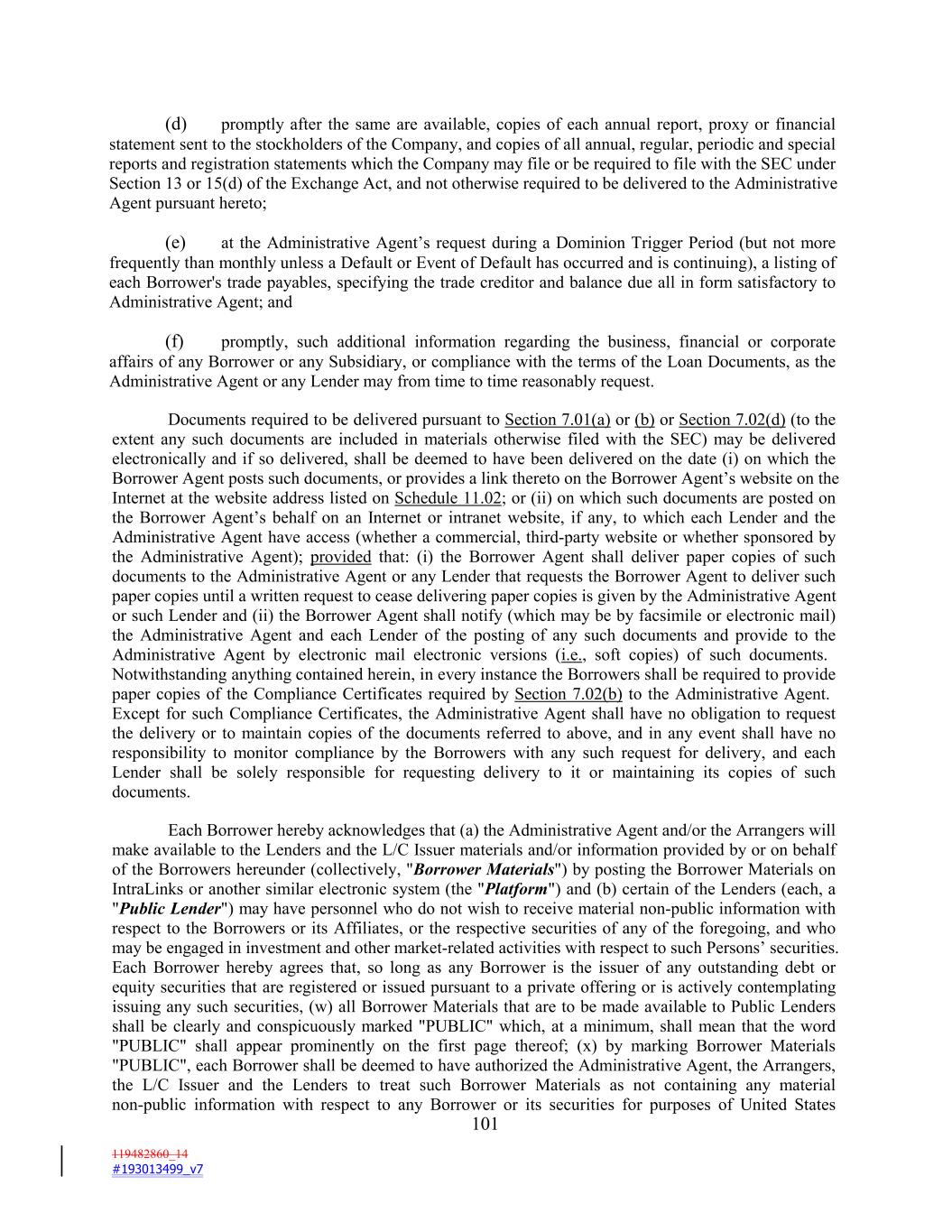 (d) promptly after the same are available, copies of each annual report, proxy or financial statement sent to the stockholders of the Company, and copies of all annual, regular, periodic and special reports and registration statements which the Company may file or be required to file with the SEC under Section 13 or 15(d) of the Exchange Act, and not otherwise required to be delivered to the Administrative Agent pursuant hereto; (e) at the Administrative Agent’s request during a Dominion Trigger Period (but not more frequently than monthly unless a Default or Event of Default has occurred and is continuing), a listing of each Borrower's trade payables, specifying the trade creditor and balance due all in form satisfactory to Administrative Agent; and (f) promptly, such additional information regarding the business, financial or corporate affairs of any Borrower or any Subsidiary, or compliance with the terms of the Loan Documents, as the Administrative Agent or any Lender may from time to time reasonably request. Documents required to be delivered pursuant to Section 7.01(a) or (b) or Section 7.02(d) (to the extent any such documents are included in materials otherwise filed with the SEC) may be delivered electronically and if so delivered, shall be deemed to have been delivered on the date (i) on which the Borrower Agent posts such documents, or provides a link thereto on the Borrower Agent’s website on the Internet at the website address listed on Schedule 11.02; or (ii) on which such documents are posted on the Borrower Agent’s behalf on an Internet or intranet website, if any, to which each Lender and the Administrative Agent have access (whether a commercial, third-party website or whether sponsored by the Administrative Agent); provided that: (i) the Borrower Agent shall deliver paper copies of such documents to the Administrative Agent or any Lender that requests the Borrower Agent to deliver such paper copies until a written request to cease delivering paper copies is given by the Administrative Agent or such Lender and (ii) the Borrower Agent shall notify (which may be by facsimile or electronic mail) the Administrative Agent and each Lender of the posting of any such documents and provide to the Administrative Agent by electronic mail electronic versions (i.e., soft copies) of such documents. Notwithstanding anything contained herein, in every instance the Borrowers shall be required to provide paper copies of the Compliance Certificates required by Section 7.02(b) to the Administrative Agent. Except for such Compliance Certificates, the Administrative Agent shall have no obligation to request the delivery or to maintain copies of the documents referred to above, and in any event shall have no responsibility to monitor compliance by the Borrowers with any such request for delivery, and each Lender shall be solely responsible for requesting delivery to it or maintaining its copies of such documents. Each Borrower hereby acknowledges that (a) the Administrative Agent and/or the Arrangers will make available to the Lenders and the L/C Issuer materials and/or information provided by or on behalf of the Borrowers hereunder (collectively, "Borrower Materials") by posting the Borrower Materials on IntraLinks or another similar electronic system (the "Platform") and (b) certain of the Lenders (each, a "Public Lender") may have personnel who do not wish to receive material non-public information with respect to the Borrowers or its Affiliates, or the respective securities of any of the foregoing, and who may be engaged in investment and other market-related activities with respect to such Persons’ securities. Each Borrower hereby agrees that, so long as any Borrower is the issuer of any outstanding debt or equity securities that are registered or issued pursuant to a private offering or is actively contemplating issuing any such securities, (w) all Borrower Materials that are to be made available to Public Lenders shall be clearly and conspicuously marked "PUBLIC" which, at a minimum, shall mean that the word "PUBLIC" shall appear prominently on the first page thereof; (x) by marking Borrower Materials "PUBLIC", each Borrower shall be deemed to have authorized the Administrative Agent, the Arrangers, the L/C Issuer and the Lenders to treat such Borrower Materials as not containing any material non-public information with respect to any Borrower or its securities for purposes of United States 101 119482860_14 #193013499_v7