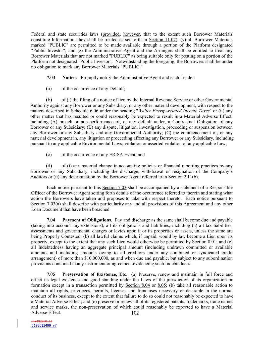Federal and state securities laws (provided, however, that to the extent such Borrower Materials constitute Information, they shall be treated as set forth in Section 11.07); (y) all Borrower Materials marked "PUBLIC" are permitted to be made available through a portion of the Platform designated "Public Investor"; and (z) the Administrative Agent and the Arrangers shall be entitled to treat any Borrower Materials that are not marked "PUBLIC" as being suitable only for posting on a portion of the Platform not designated "Public Investor". Notwithstanding the foregoing, the Borrowers shall be under no obligation to mark any Borrower Materials "PUBLIC." 7.03 Notices. Promptly notify the Administrative Agent and each Lender: (a) of the occurrence of any Default; (b) of (i) the filing of a notice of lien by the Internal Revenue Service or other Governmental Authority against any Borrower or any Subsidiary, or any other material development, with respect to the matters described in Schedule 6.06 under the heading "Walter Energy-related Income Taxes" or (ii) any other matter that has resulted or could reasonably be expected to result in a Material Adverse Effect, including (A) breach or non-performance of, or any default under, a Contractual Obligation of any Borrower or any Subsidiary; (B) any dispute, litigation, investigation, proceeding or suspension between any Borrower or any Subsidiary and any Governmental Authority; (C) the commencement of, or any material development in, any litigation or proceeding affecting any Borrower or any Subsidiary, including pursuant to any applicable Environmental Laws; violation or asserted violation of any applicable Law; (c) of the occurrence of any ERISA Event; and (d) of (i) any material change in accounting policies or financial reporting practices by any Borrower or any Subsidiary, including the discharge, withdrawal or resignation of the Company’s Auditors or (ii) any determination by the Borrower Agent referred to in Section 2.11(b). Each notice pursuant to this Section 7.03 shall be accompanied by a statement of a Responsible Officer of the Borrower Agent setting forth details of the occurrence referred to therein and stating what action the Borrowers have taken and proposes to take with respect thereto. Each notice pursuant to Section 7.03(a) shall describe with particularity any and all provisions of this Agreement and any other Loan Document that have been breached. 7.04 Payment of Obligations. Pay and discharge as the same shall become due and payable (taking into account any extensions), all its obligations and liabilities, including (a) all tax liabilities, assessments and governmental charges or levies upon it or its properties or assets, unless the same are being Properly Contested; (b) all lawful claims which, if unpaid, would by law become a Lien upon its property, except to the extent that any such Lien would otherwise be permitted by Section 8.01; and (c) all Indebtedness having an aggregate principal amount (including undrawn committed or available amounts and including amounts owing to all creditors under any combined or syndicated credit arrangement) of more than $10,000,000, as and when due and payable, but subject to any subordination provisions contained in any instrument or agreement evidencing such Indebtedness. 7.05 Preservation of Existence, Etc. (a) Preserve, renew and maintain in full force and effect its legal existence and good standing under the Laws of the jurisdiction of its organization or formation except in a transaction permitted by Section 8.04 or 8.05; (b) take all reasonable action to maintain all rights, privileges, permits, licenses and franchises necessary or desirable in the normal conduct of its business, except to the extent that failure to do so could not reasonably be expected to have a Material Adverse Effect; and (c) preserve or renew all of its registered patents, trademarks, trade names and service marks, the non-preservation of which could reasonably be expected to have a Material Adverse Effect. 102 119482860_14 #193013499_v7