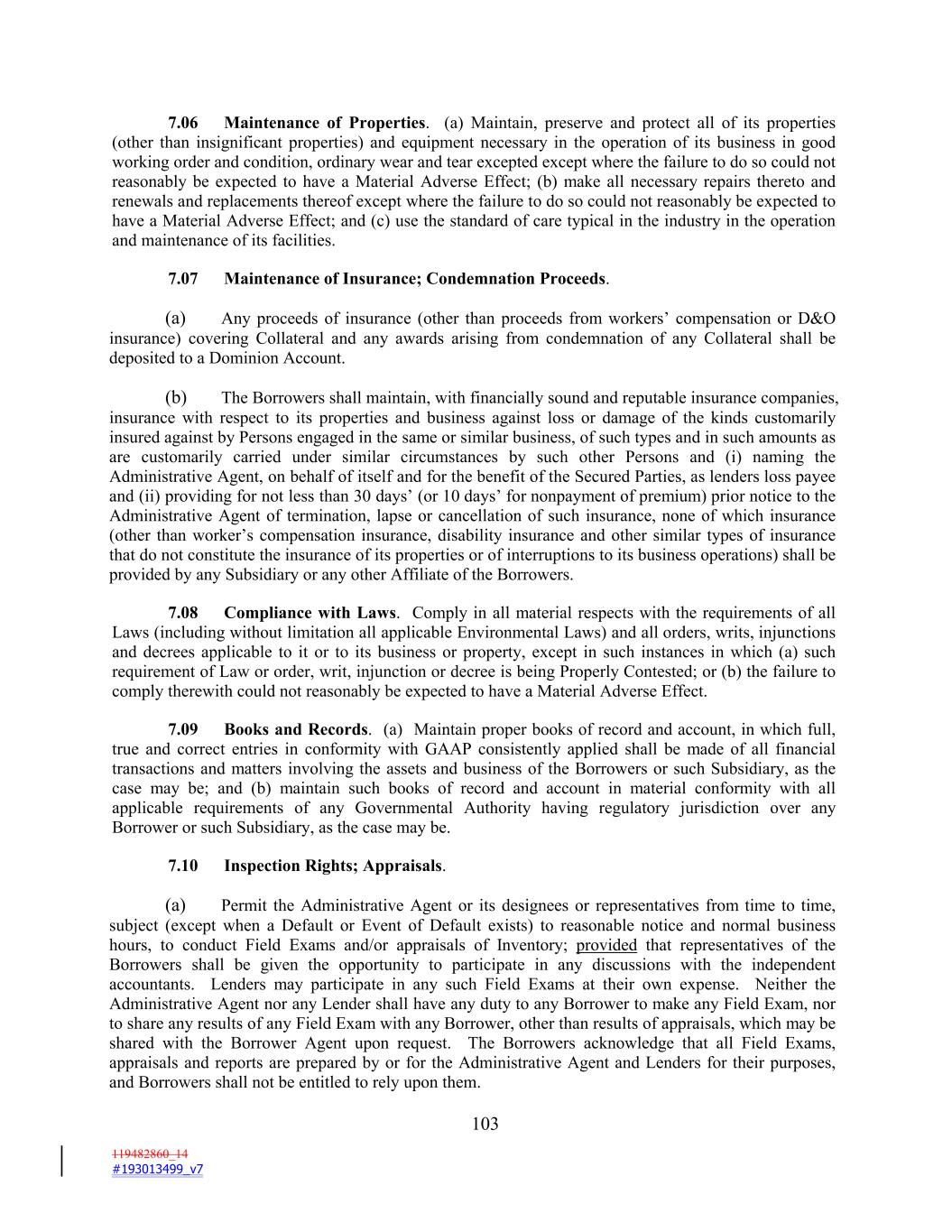 7.06 Maintenance of Properties. (a) Maintain, preserve and protect all of its properties (other than insignificant properties) and equipment necessary in the operation of its business in good working order and condition, ordinary wear and tear excepted except where the failure to do so could not reasonably be expected to have a Material Adverse Effect; (b) make all necessary repairs thereto and renewals and replacements thereof except where the failure to do so could not reasonably be expected to have a Material Adverse Effect; and (c) use the standard of care typical in the industry in the operation and maintenance of its facilities. 7.07 Maintenance of Insurance; Condemnation Proceeds. (a) Any proceeds of insurance (other than proceeds from workers’ compensation or D&O insurance) covering Collateral and any awards arising from condemnation of any Collateral shall be deposited to a Dominion Account. (b) The Borrowers shall maintain, with financially sound and reputable insurance companies, insurance with respect to its properties and business against loss or damage of the kinds customarily insured against by Persons engaged in the same or similar business, of such types and in such amounts as are customarily carried under similar circumstances by such other Persons and (i) naming the Administrative Agent, on behalf of itself and for the benefit of the Secured Parties, as lenders loss payee and (ii) providing for not less than 30 days’ (or 10 days’ for nonpayment of premium) prior notice to the Administrative Agent of termination, lapse or cancellation of such insurance, none of which insurance (other than worker’s compensation insurance, disability insurance and other similar types of insurance that do not constitute the insurance of its properties or of interruptions to its business operations) shall be provided by any Subsidiary or any other Affiliate of the Borrowers. 7.08 Compliance with Laws. Comply in all material respects with the requirements of all Laws (including without limitation all applicable Environmental Laws) and all orders, writs, injunctions and decrees applicable to it or to its business or property, except in such instances in which (a) such requirement of Law or order, writ, injunction or decree is being Properly Contested; or (b) the failure to comply therewith could not reasonably be expected to have a Material Adverse Effect. 7.09 Books and Records. (a) Maintain proper books of record and account, in which full, true and correct entries in conformity with GAAP consistently applied shall be made of all financial transactions and matters involving the assets and business of the Borrowers or such Subsidiary, as the case may be; and (b) maintain such books of record and account in material conformity with all applicable requirements of any Governmental Authority having regulatory jurisdiction over any Borrower or such Subsidiary, as the case may be. 7.10 Inspection Rights; Appraisals. (a) Permit the Administrative Agent or its designees or representatives from time to time, subject (except when a Default or Event of Default exists) to reasonable notice and normal business hours, to conduct Field Exams and/or appraisals of Inventory; provided that representatives of the Borrowers shall be given the opportunity to participate in any discussions with the independent accountants. Lenders may participate in any such Field Exams at their own expense. Neither the Administrative Agent nor any Lender shall have any duty to any Borrower to make any Field Exam, nor to share any results of any Field Exam with any Borrower, other than results of appraisals, which may be shared with the Borrower Agent upon request. The Borrowers acknowledge that all Field Exams, appraisals and reports are prepared by or for the Administrative Agent and Lenders for their purposes, and Borrowers shall not be entitled to rely upon them. 103 119482860_14 #193013499_v7