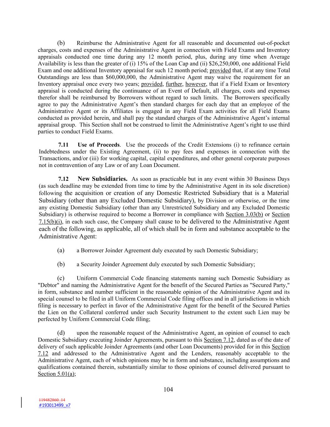 (b) Reimburse the Administrative Agent for all reasonable and documented out-of-pocket charges, costs and expenses of the Administrative Agent in connection with Field Exams and Inventory appraisals conducted one time during any 12 month period, plus, during any time when Average Availability is less than the greater of (i) 15% of the Loan Cap and (ii) $26,250,000, one additional Field Exam and one additional Inventory appraisal for such 12 month period; provided that, if at any time Total Outstandings are less than $60,000,000, the Administrative Agent may waive the requirement for an Inventory appraisal once every two years; provided, further, however, that if a Field Exam or Inventory appraisal is conducted during the continuance of an Event of Default, all charges, costs and expenses therefor shall be reimbursed by Borrowers without regard to such limits. The Borrowers specifically agree to pay the Administrative Agent’s then standard charges for each day that an employee of the Administrative Agent or its Affiliates is engaged in any Field Exam activities for all Field Exams conducted as provided herein, and shall pay the standard charges of the Administrative Agent’s internal appraisal group. This Section shall not be construed to limit the Administrative Agent’s right to use third parties to conduct Field Exams. 7.11 Use of Proceeds. Use the proceeds of the Credit Extensions (i) to refinance certain Indebtedness under the Existing Agreement, (ii) to pay fees and expenses in connection with the Transactions, and/or (iii) for working capital, capital expenditures, and other general corporate purposes not in contravention of any Law or of any Loan Document. 7.12 New Subsidiaries. As soon as practicable but in any event within 30 Business Days (as such deadline may be extended from time to time by the Administrative Agent in its sole discretion) following the acquisition or creation of any Domestic Restricted Subsidiary that is a Material Subsidiary (other than any Excluded Domestic Subsidiary), by Division or otherwise, or the time any existing Domestic Subsidiary (other than any Unrestricted Subsidiary and any Excluded Domestic Subsidiary) is otherwise required to become a Borrower in compliance with Section 3.03(b) or Section 7.15(b)(i), in each such case, the Company shall cause to be delivered to the Administrative Agent each of the following, as applicable, all of which shall be in form and substance acceptable to the Administrative Agent: (a) a Borrower Joinder Agreement duly executed by such Domestic Subsidiary; (b) a Security Joinder Agreement duly executed by such Domestic Subsidiary; (c) Uniform Commercial Code financing statements naming such Domestic Subsidiary as "Debtor" and naming the Administrative Agent for the benefit of the Secured Parties as "Secured Party," in form, substance and number sufficient in the reasonable opinion of the Administrative Agent and its special counsel to be filed in all Uniform Commercial Code filing offices and in all jurisdictions in which filing is necessary to perfect in favor of the Administrative Agent for the benefit of the Secured Parties the Lien on the Collateral conferred under such Security Instrument to the extent such Lien may be perfected by Uniform Commercial Code filing; (d) upon the reasonable request of the Administrative Agent, an opinion of counsel to each Domestic Subsidiary executing Joinder Agreements, pursuant to this Section 7.12, dated as of the date of delivery of such applicable Joinder Agreements (and other Loan Documents) provided for in this Section 7.12 and addressed to the Administrative Agent and the Lenders, reasonably acceptable to the Administrative Agent, each of which opinions may be in form and substance, including assumptions and qualifications contained therein, substantially similar to those opinions of counsel delivered pursuant to Section 5.01(a); 104 119482860_14 #193013499_v7