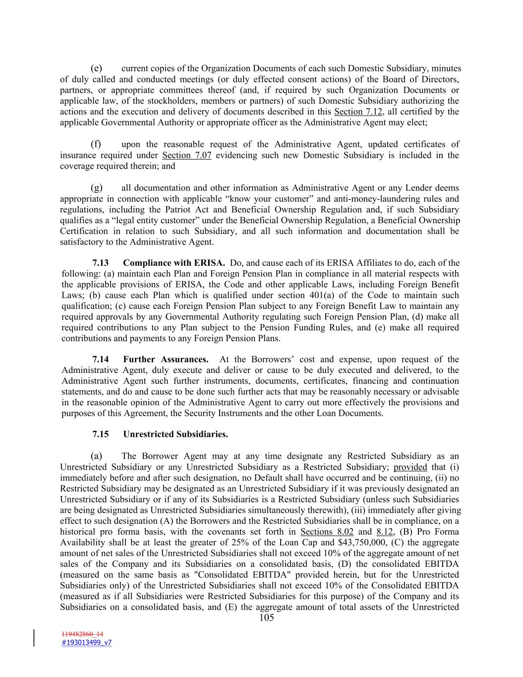 (e) current copies of the Organization Documents of each such Domestic Subsidiary, minutes of duly called and conducted meetings (or duly effected consent actions) of the Board of Directors, partners, or appropriate committees thereof (and, if required by such Organization Documents or applicable law, of the stockholders, members or partners) of such Domestic Subsidiary authorizing the actions and the execution and delivery of documents described in this Section 7.12, all certified by the applicable Governmental Authority or appropriate officer as the Administrative Agent may elect; (f) upon the reasonable request of the Administrative Agent, updated certificates of insurance required under Section 7.07 evidencing such new Domestic Subsidiary is included in the coverage required therein; and (g) all documentation and other information as Administrative Agent or any Lender deems appropriate in connection with applicable “know your customer” and anti-money-laundering rules and regulations, including the Patriot Act and Beneficial Ownership Regulation and, if such Subsidiary qualifies as a “legal entity customer” under the Beneficial Ownership Regulation, a Beneficial Ownership Certification in relation to such Subsidiary, and all such information and documentation shall be satisfactory to the Administrative Agent. 7.13 Compliance with ERISA. Do, and cause each of its ERISA Affiliates to do, each of the following: (a) maintain each Plan and Foreign Pension Plan in compliance in all material respects with the applicable provisions of ERISA, the Code and other applicable Laws, including Foreign Benefit Laws; (b) cause each Plan which is qualified under section 401(a) of the Code to maintain such qualification; (c) cause each Foreign Pension Plan subject to any Foreign Benefit Law to maintain any required approvals by any Governmental Authority regulating such Foreign Pension Plan, (d) make all required contributions to any Plan subject to the Pension Funding Rules, and (e) make all required contributions and payments to any Foreign Pension Plans. 7.14 Further Assurances. At the Borrowers’ cost and expense, upon request of the Administrative Agent, duly execute and deliver or cause to be duly executed and delivered, to the Administrative Agent such further instruments, documents, certificates, financing and continuation statements, and do and cause to be done such further acts that may be reasonably necessary or advisable in the reasonable opinion of the Administrative Agent to carry out more effectively the provisions and purposes of this Agreement, the Security Instruments and the other Loan Documents. 7.15 Unrestricted Subsidiaries. (a) The Borrower Agent may at any time designate any Restricted Subsidiary as an Unrestricted Subsidiary or any Unrestricted Subsidiary as a Restricted Subsidiary; provided that (i) immediately before and after such designation, no Default shall have occurred and be continuing, (ii) no Restricted Subsidiary may be designated as an Unrestricted Subsidiary if it was previously designated an Unrestricted Subsidiary or if any of its Subsidiaries is a Restricted Subsidiary (unless such Subsidiaries are being designated as Unrestricted Subsidiaries simultaneously therewith), (iii) immediately after giving effect to such designation (A) the Borrowers and the Restricted Subsidiaries shall be in compliance, on a historical pro forma basis, with the covenants set forth in Sections 8.02 and 8.12, (B) Pro Forma Availability shall be at least the greater of 25% of the Loan Cap and $43,750,000, (C) the aggregate amount of net sales of the Unrestricted Subsidiaries shall not exceed 10% of the aggregate amount of net sales of the Company and its Subsidiaries on a consolidated basis, (D) the consolidated EBITDA (measured on the same basis as "Consolidated EBITDA" provided herein, but for the Unrestricted Subsidiaries only) of the Unrestricted Subsidiaries shall not exceed 10% of the Consolidated EBITDA (measured as if all Subsidiaries were Restricted Subsidiaries for this purpose) of the Company and its Subsidiaries on a consolidated basis, and (E) the aggregate amount of total assets of the Unrestricted 105 119482860_14 #193013499_v7
