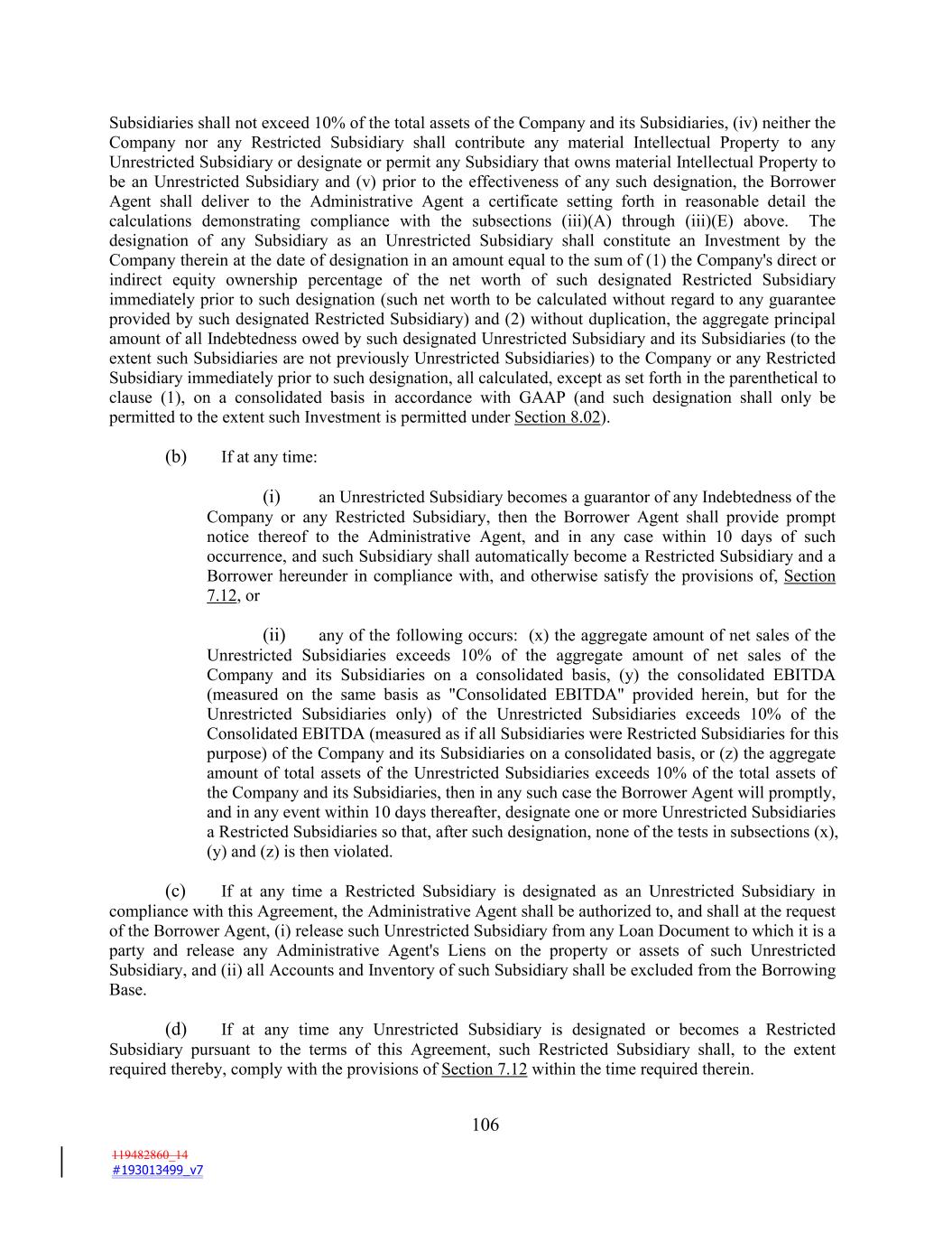 Subsidiaries shall not exceed 10% of the total assets of the Company and its Subsidiaries, (iv) neither the Company nor any Restricted Subsidiary shall contribute any material Intellectual Property to any Unrestricted Subsidiary or designate or permit any Subsidiary that owns material Intellectual Property to be an Unrestricted Subsidiary and (v) prior to the effectiveness of any such designation, the Borrower Agent shall deliver to the Administrative Agent a certificate setting forth in reasonable detail the calculations demonstrating compliance with the subsections (iii)(A) through (iii)(E) above. The designation of any Subsidiary as an Unrestricted Subsidiary shall constitute an Investment by the Company therein at the date of designation in an amount equal to the sum of (1) the Company's direct or indirect equity ownership percentage of the net worth of such designated Restricted Subsidiary immediately prior to such designation (such net worth to be calculated without regard to any guarantee provided by such designated Restricted Subsidiary) and (2) without duplication, the aggregate principal amount of all Indebtedness owed by such designated Unrestricted Subsidiary and its Subsidiaries (to the extent such Subsidiaries are not previously Unrestricted Subsidiaries) to the Company or any Restricted Subsidiary immediately prior to such designation, all calculated, except as set forth in the parenthetical to clause (1), on a consolidated basis in accordance with GAAP (and such designation shall only be permitted to the extent such Investment is permitted under Section 8.02). (b) If at any time: (i) an Unrestricted Subsidiary becomes a guarantor of any Indebtedness of the Company or any Restricted Subsidiary, then the Borrower Agent shall provide prompt notice thereof to the Administrative Agent, and in any case within 10 days of such occurrence, and such Subsidiary shall automatically become a Restricted Subsidiary and a Borrower hereunder in compliance with, and otherwise satisfy the provisions of, Section 7.12, or (ii) any of the following occurs: (x) the aggregate amount of net sales of the Unrestricted Subsidiaries exceeds 10% of the aggregate amount of net sales of the Company and its Subsidiaries on a consolidated basis, (y) the consolidated EBITDA (measured on the same basis as "Consolidated EBITDA" provided herein, but for the Unrestricted Subsidiaries only) of the Unrestricted Subsidiaries exceeds 10% of the Consolidated EBITDA (measured as if all Subsidiaries were Restricted Subsidiaries for this purpose) of the Company and its Subsidiaries on a consolidated basis, or (z) the aggregate amount of total assets of the Unrestricted Subsidiaries exceeds 10% of the total assets of the Company and its Subsidiaries, then in any such case the Borrower Agent will promptly, and in any event within 10 days thereafter, designate one or more Unrestricted Subsidiaries a Restricted Subsidiaries so that, after such designation, none of the tests in subsections (x), (y) and (z) is then violated. (c) If at any time a Restricted Subsidiary is designated as an Unrestricted Subsidiary in compliance with this Agreement, the Administrative Agent shall be authorized to, and shall at the request of the Borrower Agent, (i) release such Unrestricted Subsidiary from any Loan Document to which it is a party and release any Administrative Agent's Liens on the property or assets of such Unrestricted Subsidiary, and (ii) all Accounts and Inventory of such Subsidiary shall be excluded from the Borrowing Base. (d) If at any time any Unrestricted Subsidiary is designated or becomes a Restricted Subsidiary pursuant to the terms of this Agreement, such Restricted Subsidiary shall, to the extent required thereby, comply with the provisions of Section 7.12 within the time required therein. 106 119482860_14 #193013499_v7