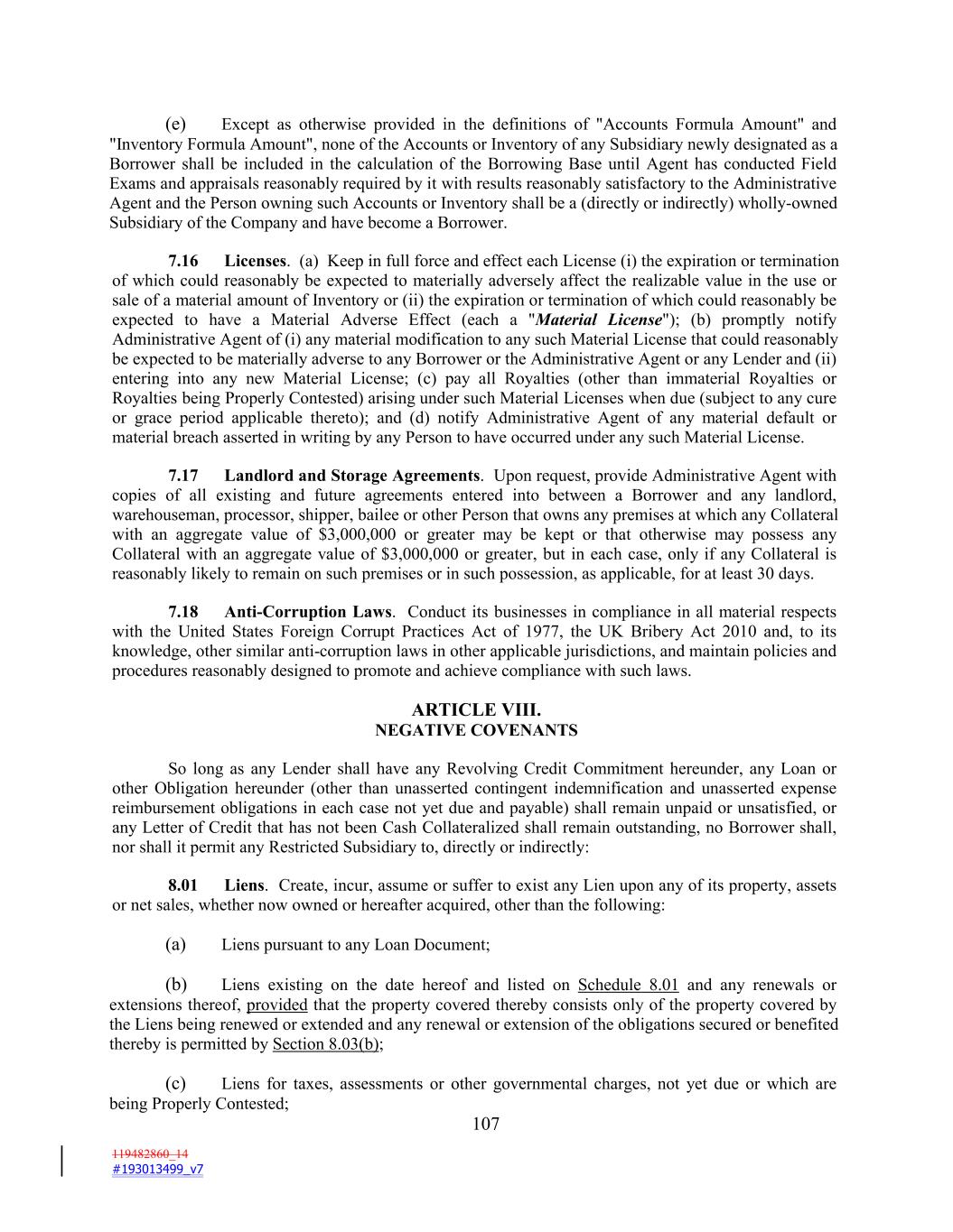 (e) Except as otherwise provided in the definitions of "Accounts Formula Amount" and "Inventory Formula Amount", none of the Accounts or Inventory of any Subsidiary newly designated as a Borrower shall be included in the calculation of the Borrowing Base until Agent has conducted Field Exams and appraisals reasonably required by it with results reasonably satisfactory to the Administrative Agent and the Person owning such Accounts or Inventory shall be a (directly or indirectly) wholly-owned Subsidiary of the Company and have become a Borrower. 7.16 Licenses. (a) Keep in full force and effect each License (i) the expiration or termination of which could reasonably be expected to materially adversely affect the realizable value in the use or sale of a material amount of Inventory or (ii) the expiration or termination of which could reasonably be expected to have a Material Adverse Effect (each a "Material License"); (b) promptly notify Administrative Agent of (i) any material modification to any such Material License that could reasonably be expected to be materially adverse to any Borrower or the Administrative Agent or any Lender and (ii) entering into any new Material License; (c) pay all Royalties (other than immaterial Royalties or Royalties being Properly Contested) arising under such Material Licenses when due (subject to any cure or grace period applicable thereto); and (d) notify Administrative Agent of any material default or material breach asserted in writing by any Person to have occurred under any such Material License. 7.17 Landlord and Storage Agreements. Upon request, provide Administrative Agent with copies of all existing and future agreements entered into between a Borrower and any landlord, warehouseman, processor, shipper, bailee or other Person that owns any premises at which any Collateral with an aggregate value of $3,000,000 or greater may be kept or that otherwise may possess any Collateral with an aggregate value of $3,000,000 or greater, but in each case, only if any Collateral is reasonably likely to remain on such premises or in such possession, as applicable, for at least 30 days. 7.18 Anti-Corruption Laws. Conduct its businesses in compliance in all material respects with the United States Foreign Corrupt Practices Act of 1977, the UK Bribery Act 2010 and, to its knowledge, other similar anti-corruption laws in other applicable jurisdictions, and maintain policies and procedures reasonably designed to promote and achieve compliance with such laws. ARTICLE VIII. NEGATIVE COVENANTS So long as any Lender shall have any Revolving Credit Commitment hereunder, any Loan or other Obligation hereunder (other than unasserted contingent indemnification and unasserted expense reimbursement obligations in each case not yet due and payable) shall remain unpaid or unsatisfied, or any Letter of Credit that has not been Cash Collateralized shall remain outstanding, no Borrower shall, nor shall it permit any Restricted Subsidiary to, directly or indirectly: 8.01 Liens. Create, incur, assume or suffer to exist any Lien upon any of its property, assets or net sales, whether now owned or hereafter acquired, other than the following: (a) Liens pursuant to any Loan Document; (b) Liens existing on the date hereof and listed on Schedule 8.01 and any renewals or extensions thereof, provided that the property covered thereby consists only of the property covered by the Liens being renewed or extended and any renewal or extension of the obligations secured or benefited thereby is permitted by Section 8.03(b); (c) Liens for taxes, assessments or other governmental charges, not yet due or which are being Properly Contested; 107 119482860_14 #193013499_v7