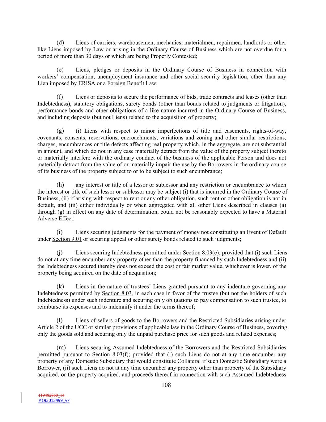 (d) Liens of carriers, warehousemen, mechanics, materialmen, repairmen, landlords or other like Liens imposed by Law or arising in the Ordinary Course of Business which are not overdue for a period of more than 30 days or which are being Properly Contested; (e) Liens, pledges or deposits in the Ordinary Course of Business in connection with workers’ compensation, unemployment insurance and other social security legislation, other than any Lien imposed by ERISA or a Foreign Benefit Law; (f) Liens or deposits to secure the performance of bids, trade contracts and leases (other than Indebtedness), statutory obligations, surety bonds (other than bonds related to judgments or litigation), performance bonds and other obligations of a like nature incurred in the Ordinary Course of Business, and including deposits (but not Liens) related to the acquisition of property; (g) (i) Liens with respect to minor imperfections of title and easements, rights-of-way, covenants, consents, reservations, encroachments, variations and zoning and other similar restrictions, charges, encumbrances or title defects affecting real property which, in the aggregate, are not substantial in amount, and which do not in any case materially detract from the value of the property subject thereto or materially interfere with the ordinary conduct of the business of the applicable Person and does not materially detract from the value of or materially impair the use by the Borrowers in the ordinary course of its business of the property subject to or to be subject to such encumbrance; (h) any interest or title of a lessor or sublessor and any restriction or encumbrance to which the interest or title of such lessor or sublessor may be subject (i) that is incurred in the Ordinary Course of Business, (ii) if arising with respect to rent or any other obligation, such rent or other obligation is not in default, and (iii) either individually or when aggregated with all other Liens described in clauses (a) through (g) in effect on any date of determination, could not be reasonably expected to have a Material Adverse Effect; (i) Liens securing judgments for the payment of money not constituting an Event of Default under Section 9.01 or securing appeal or other surety bonds related to such judgments; (j) Liens securing Indebtedness permitted under Section 8.03(e); provided that (i) such Liens do not at any time encumber any property other than the property financed by such Indebtedness and (ii) the Indebtedness secured thereby does not exceed the cost or fair market value, whichever is lower, of the property being acquired on the date of acquisition; (k) Liens in the nature of trustees’ Liens granted pursuant to any indenture governing any Indebtedness permitted by Section 8.03, in each case in favor of the trustee (but not the holders of such Indebtedness) under such indenture and securing only obligations to pay compensation to such trustee, to reimburse its expenses and to indemnify it under the terms thereof; (l) Liens of sellers of goods to the Borrowers and the Restricted Subsidiaries arising under Article 2 of the UCC or similar provisions of applicable law in the Ordinary Course of Business, covering only the goods sold and securing only the unpaid purchase price for such goods and related expenses; (m) Liens securing Assumed Indebtedness of the Borrowers and the Restricted Subsidiaries permitted pursuant to Section 8.03(f); provided that (i) such Liens do not at any time encumber any property of any Domestic Subsidiary that would constitute Collateral if such Domestic Subsidiary were a Borrower, (ii) such Liens do not at any time encumber any property other than property of the Subsidiary acquired, or the property acquired, and proceeds thereof in connection with such Assumed Indebtedness 108 119482860_14 #193013499_v7