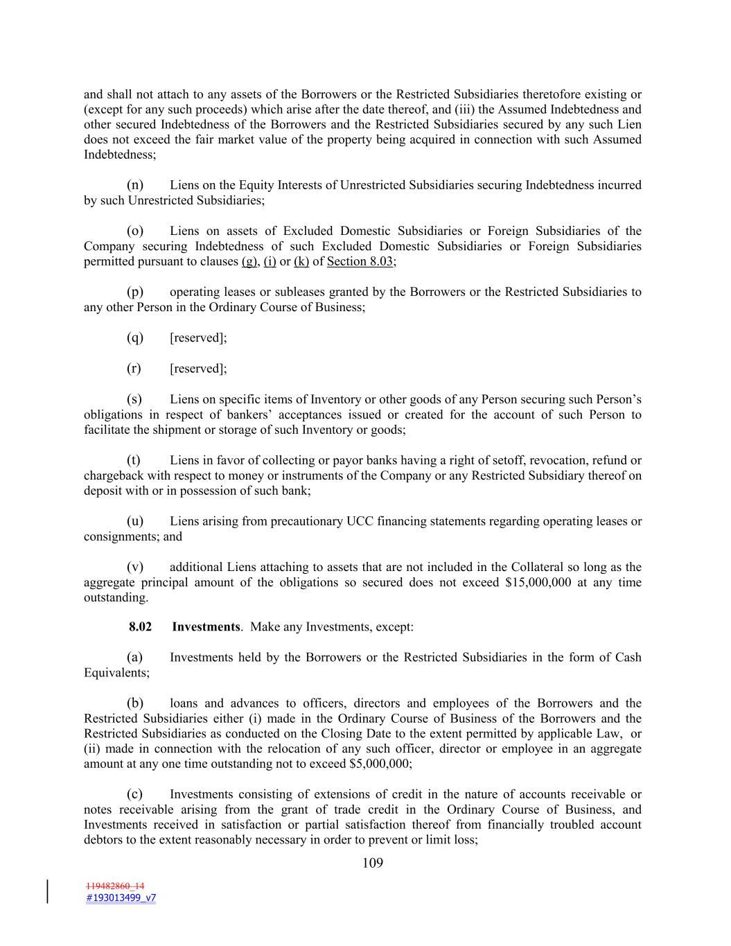 and shall not attach to any assets of the Borrowers or the Restricted Subsidiaries theretofore existing or (except for any such proceeds) which arise after the date thereof, and (iii) the Assumed Indebtedness and other secured Indebtedness of the Borrowers and the Restricted Subsidiaries secured by any such Lien does not exceed the fair market value of the property being acquired in connection with such Assumed Indebtedness; (n) Liens on the Equity Interests of Unrestricted Subsidiaries securing Indebtedness incurred by such Unrestricted Subsidiaries; (o) Liens on assets of Excluded Domestic Subsidiaries or Foreign Subsidiaries of the Company securing Indebtedness of such Excluded Domestic Subsidiaries or Foreign Subsidiaries permitted pursuant to clauses (g), (i) or (k) of Section 8.03; (p) operating leases or subleases granted by the Borrowers or the Restricted Subsidiaries to any other Person in the Ordinary Course of Business; (q) [reserved]; (r) [reserved]; (s) Liens on specific items of Inventory or other goods of any Person securing such Person’s obligations in respect of bankers’ acceptances issued or created for the account of such Person to facilitate the shipment or storage of such Inventory or goods; (t) Liens in favor of collecting or payor banks having a right of setoff, revocation, refund or chargeback with respect to money or instruments of the Company or any Restricted Subsidiary thereof on deposit with or in possession of such bank; (u) Liens arising from precautionary UCC financing statements regarding operating leases or consignments; and (v) additional Liens attaching to assets that are not included in the Collateral so long as the aggregate principal amount of the obligations so secured does not exceed $15,000,000 at any time outstanding. 8.02 Investments. Make any Investments, except: (a) Investments held by the Borrowers or the Restricted Subsidiaries in the form of Cash Equivalents; (b) loans and advances to officers, directors and employees of the Borrowers and the Restricted Subsidiaries either (i) made in the Ordinary Course of Business of the Borrowers and the Restricted Subsidiaries as conducted on the Closing Date to the extent permitted by applicable Law, or (ii) made in connection with the relocation of any such officer, director or employee in an aggregate amount at any one time outstanding not to exceed $5,000,000; (c) Investments consisting of extensions of credit in the nature of accounts receivable or notes receivable arising from the grant of trade credit in the Ordinary Course of Business, and Investments received in satisfaction or partial satisfaction thereof from financially troubled account debtors to the extent reasonably necessary in order to prevent or limit loss; 109 119482860_14 #193013499_v7