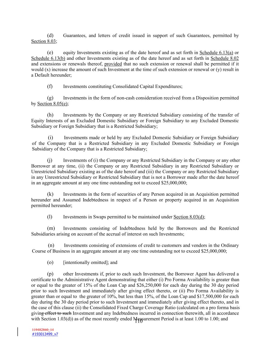 (d) Guarantees, and letters of credit issued in support of such Guarantees, permitted by Section 8.03; (e) equity Investments existing as of the date hereof and as set forth in Schedule 6.13(a) or Schedule 6.13(b) and other Investments existing as of the date hereof and as set forth in Schedule 8.02 and extensions or renewals thereof, provided that no such extension or renewal shall be permitted if it would (x) increase the amount of such Investment at the time of such extension or renewal or (y) result in a Default hereunder; (f) Investments constituting Consolidated Capital Expenditures; (g) Investments in the form of non-cash consideration received from a Disposition permitted by Section 8.05(e); (h) Investments by the Company or any Restricted Subsidiary consisting of the transfer of Equity Interests of an Excluded Domestic Subsidiary or Foreign Subsidiary to any Excluded Domestic Subsidiary or Foreign Subsidiary that is a Restricted Subsidiary; (i) Investments made or held by any Excluded Domestic Subsidiary or Foreign Subsidiary of the Company that is a Restricted Subsidiary in any Excluded Domestic Subsidiary or Foreign Subsidiary of the Company that is a Restricted Subsidiary; (j) Investments of (i) the Company or any Restricted Subsidiary in the Company or any other Borrower at any time, (ii) the Company or any Restricted Subsidiary in any Restricted Subsidiary or Unrestricted Subsidiary existing as of the date hereof and (iii) the Company or any Restricted Subsidiary in any Unrestricted Subsidiary or Restricted Subsidiary that is not a Borrower made after the date hereof in an aggregate amount at any one time outstanding not to exceed $25,000,000; (k) Investments in the form of securities of any Person acquired in an Acquisition permitted hereunder and Assumed Indebtedness in respect of a Person or property acquired in an Acquisition permitted hereunder; (l) Investments in Swaps permitted to be maintained under Section 8.03(d); (m) Investments consisting of Indebtedness held by the Borrowers and the Restricted Subsidiaries arising on account of the accrual of interest on such Investments; (n) Investments consisting of extensions of credit to customers and vendors in the Ordinary Course of Business in an aggregate amount at any one time outstanding not to exceed $25,000,000; (o) [intentionally omitted]; and (p) other Investments if, prior to each such Investment, the Borrower Agent has delivered a certificate to the Administrative Agent demonstrating that either (i) Pro Forma Availability is greater than or equal to the greater of 15% of the Loan Cap and $26,250,000 for each day during the 30 day period prior to such Investment and immediately after giving effect thereto, or (ii) Pro Forma Availability is greater than or equal to the greater of 10%, but less than 15%, of the Loan Cap and $17,500,000 for each day during the 30 day period prior to such Investment and immediately after giving effect thereto, and in the case of this clause (ii) the Consolidated Fixed Charge Coverage Ratio (calculated on a pro forma basis giving effect to such Investment and any Indebtedness incurred in connection therewith, all in accordance with Section 1.03(d)) as of the most recently ended Measurement Period is at least 1.00 to 1.00; and110 119482860_14 #193013499_v7
