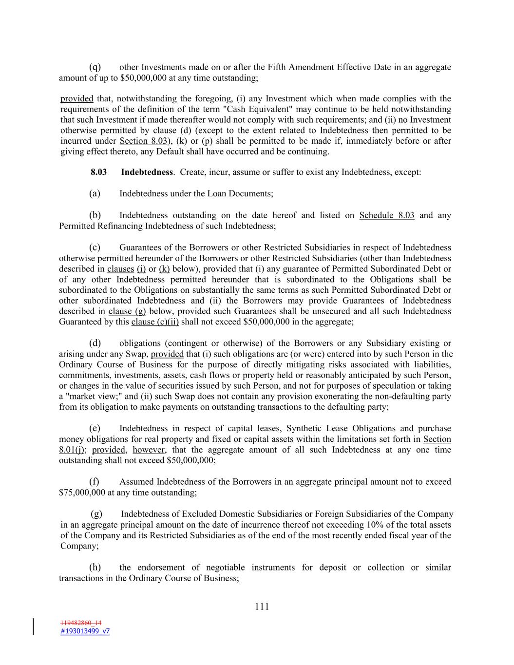 (q) other Investments made on or after the Fifth Amendment Effective Date in an aggregate amount of up to $50,000,000 at any time outstanding; provided that, notwithstanding the foregoing, (i) any Investment which when made complies with the requirements of the definition of the term "Cash Equivalent" may continue to be held notwithstanding that such Investment if made thereafter would not comply with such requirements; and (ii) no Investment otherwise permitted by clause (d) (except to the extent related to Indebtedness then permitted to be incurred under Section 8.03), (k) or (p) shall be permitted to be made if, immediately before or after giving effect thereto, any Default shall have occurred and be continuing. 8.03 Indebtedness. Create, incur, assume or suffer to exist any Indebtedness, except: (a) Indebtedness under the Loan Documents; (b) Indebtedness outstanding on the date hereof and listed on Schedule 8.03 and any Permitted Refinancing Indebtedness of such Indebtedness; (c) Guarantees of the Borrowers or other Restricted Subsidiaries in respect of Indebtedness otherwise permitted hereunder of the Borrowers or other Restricted Subsidiaries (other than Indebtedness described in clauses (i) or (k) below), provided that (i) any guarantee of Permitted Subordinated Debt or of any other Indebtedness permitted hereunder that is subordinated to the Obligations shall be subordinated to the Obligations on substantially the same terms as such Permitted Subordinated Debt or other subordinated Indebtedness and (ii) the Borrowers may provide Guarantees of Indebtedness described in clause (g) below, provided such Guarantees shall be unsecured and all such Indebtedness Guaranteed by this clause (c)(ii) shall not exceed $50,000,000 in the aggregate; (d) obligations (contingent or otherwise) of the Borrowers or any Subsidiary existing or arising under any Swap, provided that (i) such obligations are (or were) entered into by such Person in the Ordinary Course of Business for the purpose of directly mitigating risks associated with liabilities, commitments, investments, assets, cash flows or property held or reasonably anticipated by such Person, or changes in the value of securities issued by such Person, and not for purposes of speculation or taking a "market view;" and (ii) such Swap does not contain any provision exonerating the non-defaulting party from its obligation to make payments on outstanding transactions to the defaulting party; (e) Indebtedness in respect of capital leases, Synthetic Lease Obligations and purchase money obligations for real property and fixed or capital assets within the limitations set forth in Section 8.01(j); provided, however, that the aggregate amount of all such Indebtedness at any one time outstanding shall not exceed $50,000,000; (f) Assumed Indebtedness of the Borrowers in an aggregate principal amount not to exceed $75,000,000 at any time outstanding; (g) Indebtedness of Excluded Domestic Subsidiaries or Foreign Subsidiaries of the Company in an aggregate principal amount on the date of incurrence thereof not exceeding 10% of the total assets of the Company and its Restricted Subsidiaries as of the end of the most recently ended fiscal year of the Company; (h) the endorsement of negotiable instruments for deposit or collection or similar transactions in the Ordinary Course of Business; 111 119482860_14 #193013499_v7